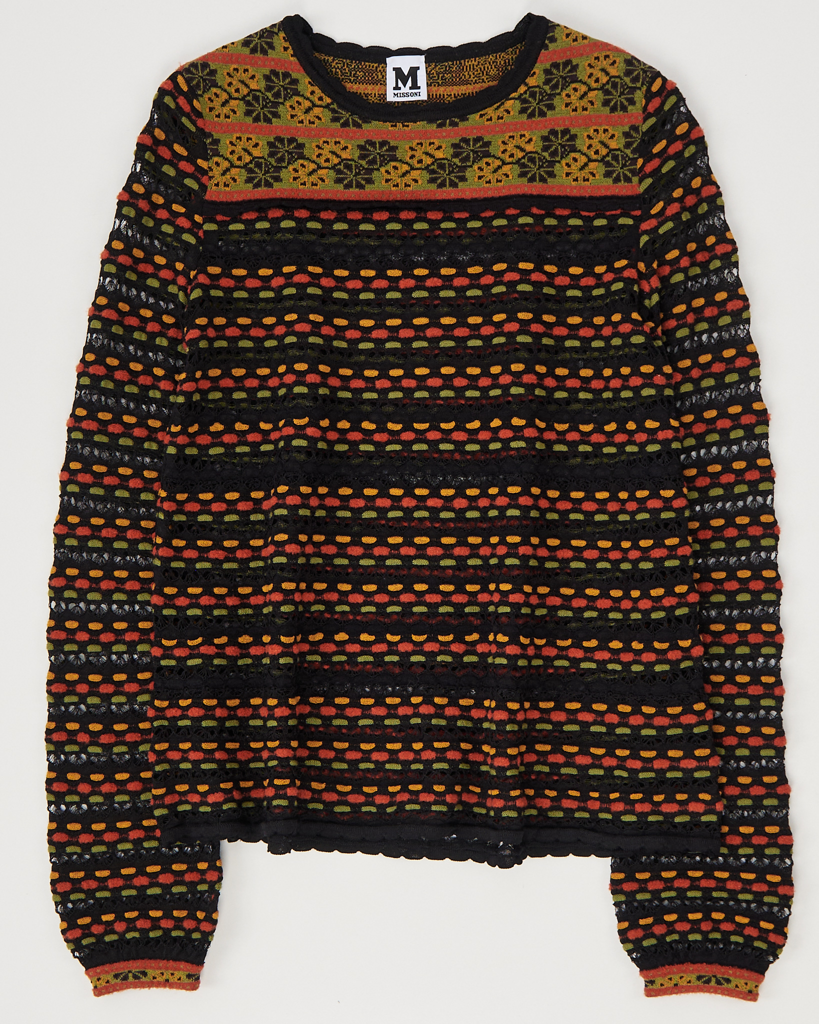 Свитер от итальянского бренда Missoni с ажурным узором. Трикотаж Missoni с выразительным орнаментом и фирменной графикой бренда. Модель прямого кроя, материал приятный на ощупь. Ажурное плетение создаёт многослойный визуальный эффект и подчёркивает характер изделия.