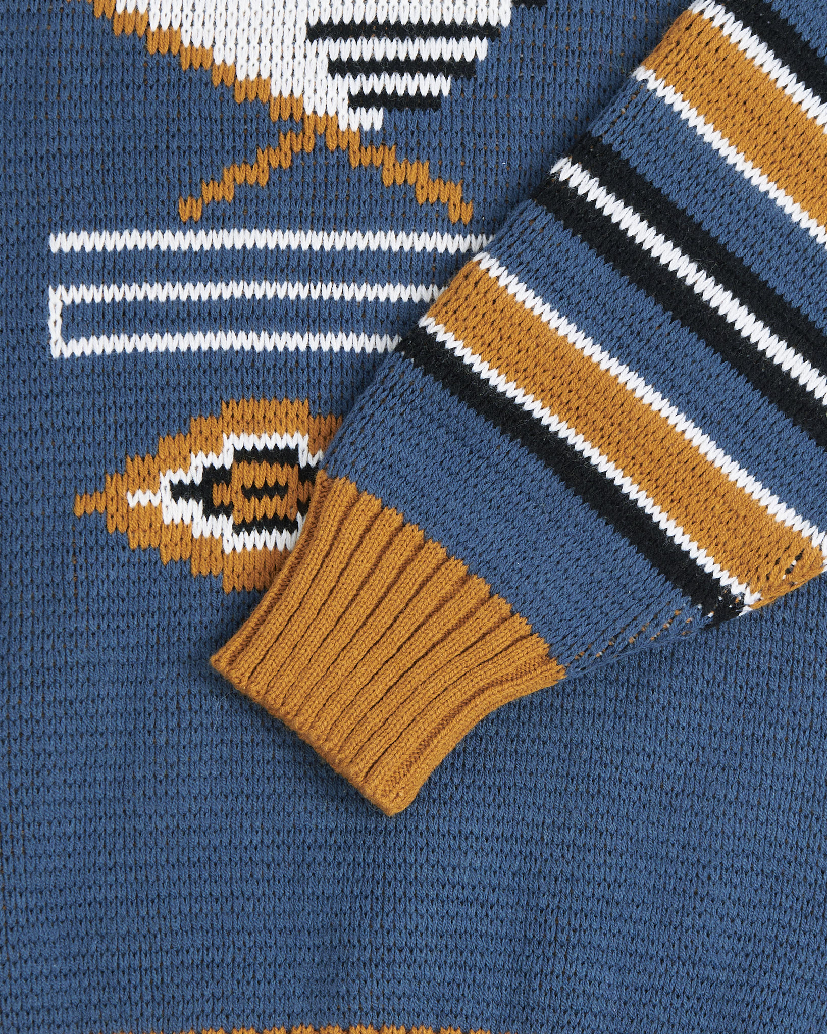 Вязаный свитер с насыщенным орнаментом и контрастными деталями, который сразу привлекает внимание фактурой и рисунком. Посадка свободная, с мягкой линией плеч и аккуратными манжетами, за счёт чего вещь комфортно лежит по фигуре и не сковывает движения. Свитер плотный с графичным принтом.