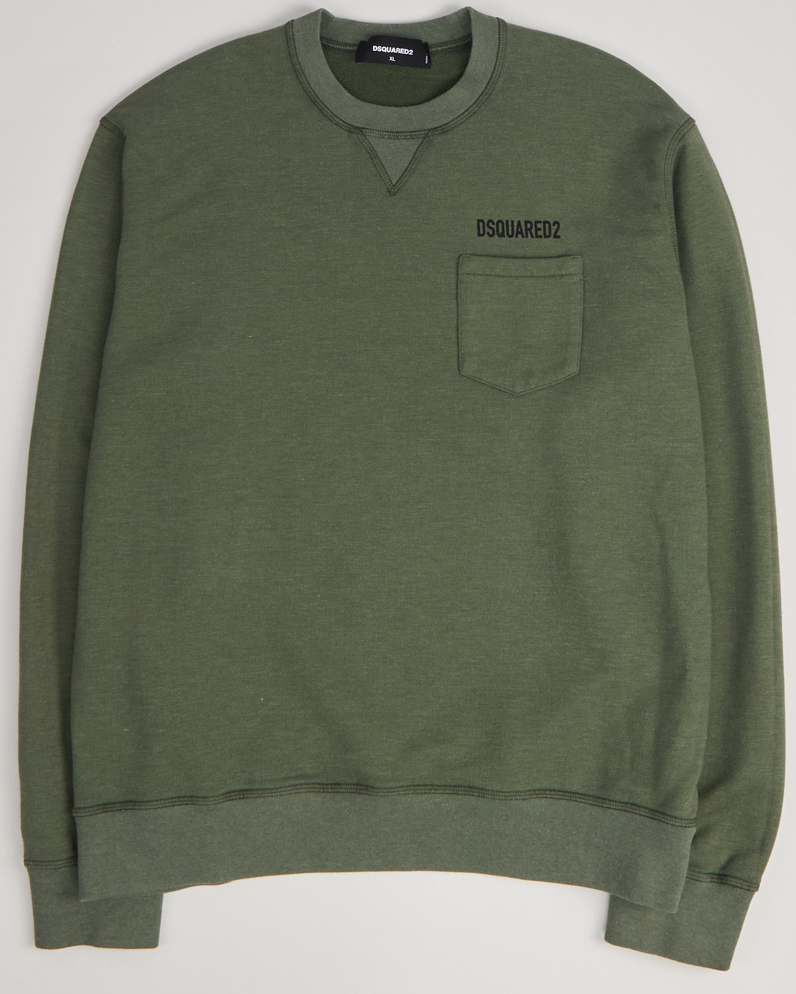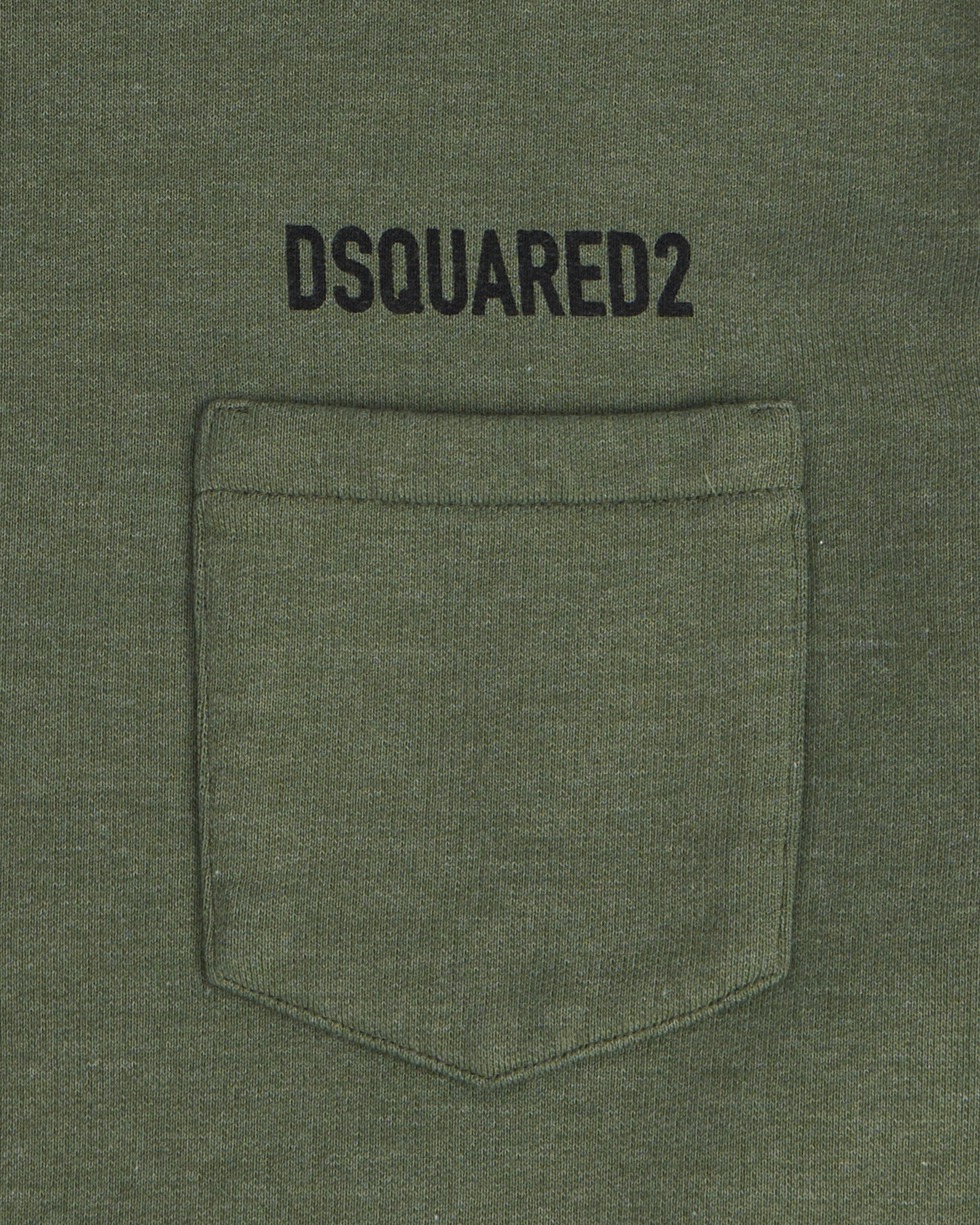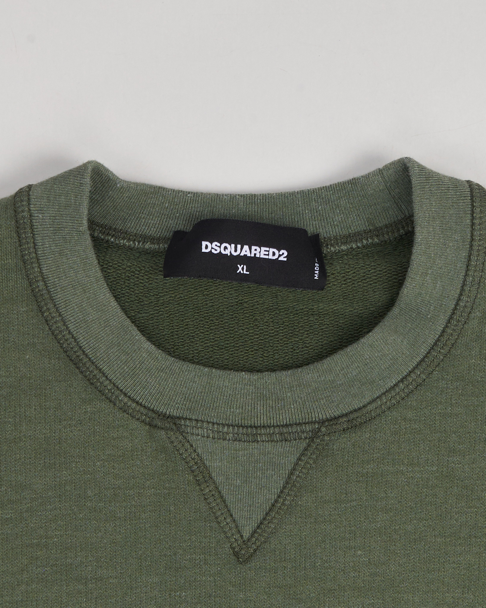 Свитшот Dsquared2 из плотного хлопкового трикотажа. Выполнен в приглушённом оливковом оттенке. Классический прямой крой с круглым вырезом и треугольной вставкой у горловины. На груди — накладной карман и контрастный логотип бренда. Манжеты и низ на эластичной резинке.