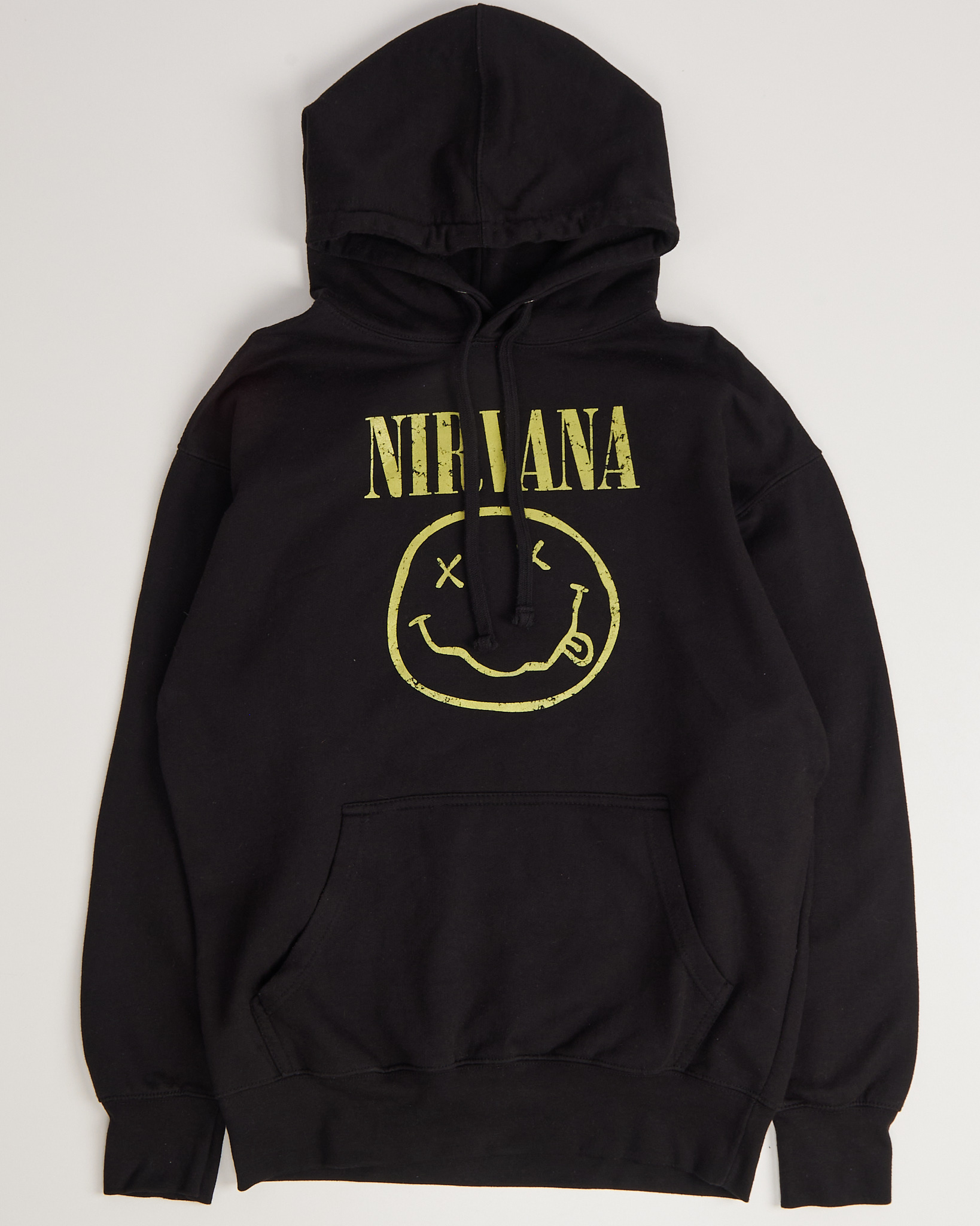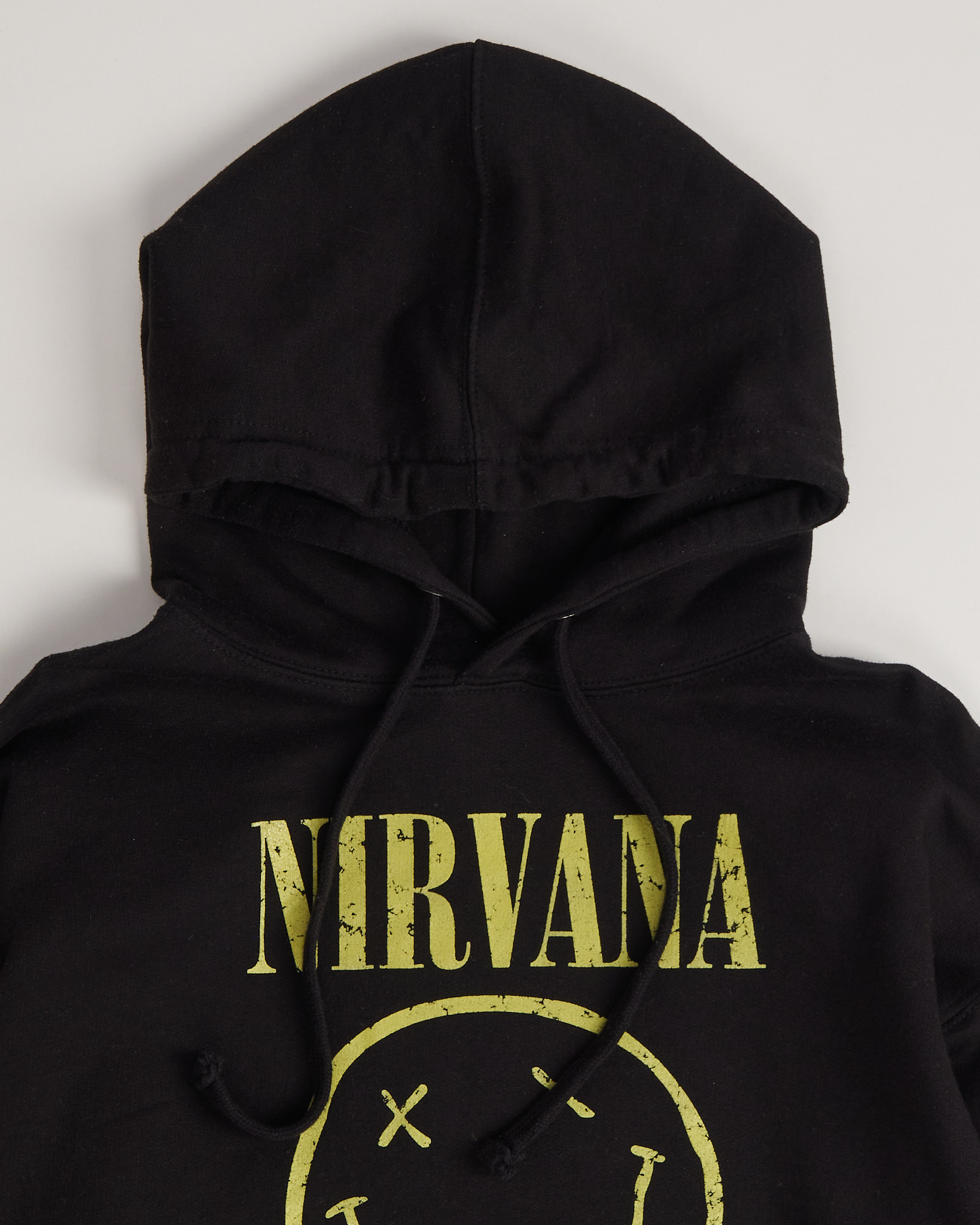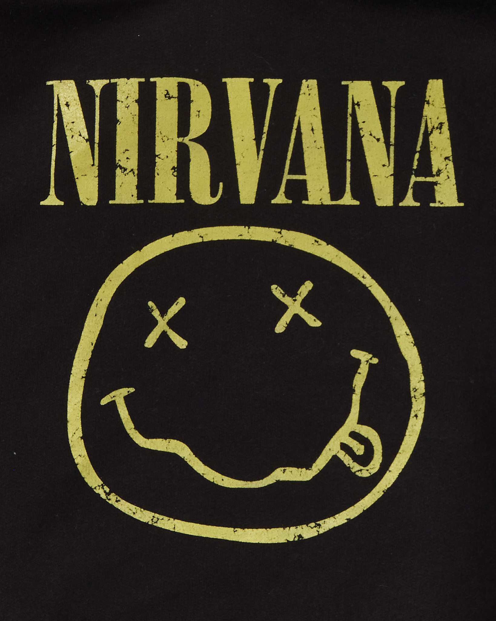 Толстовка Boohooman черного цвета. Свободная посадка. Спущенная линия плеч. Глубокий капюшон с утяжками. Спереди вместительный карман. Манжеты и низ оформлены широкой резинкой. На груди крупный принт Nirvana.