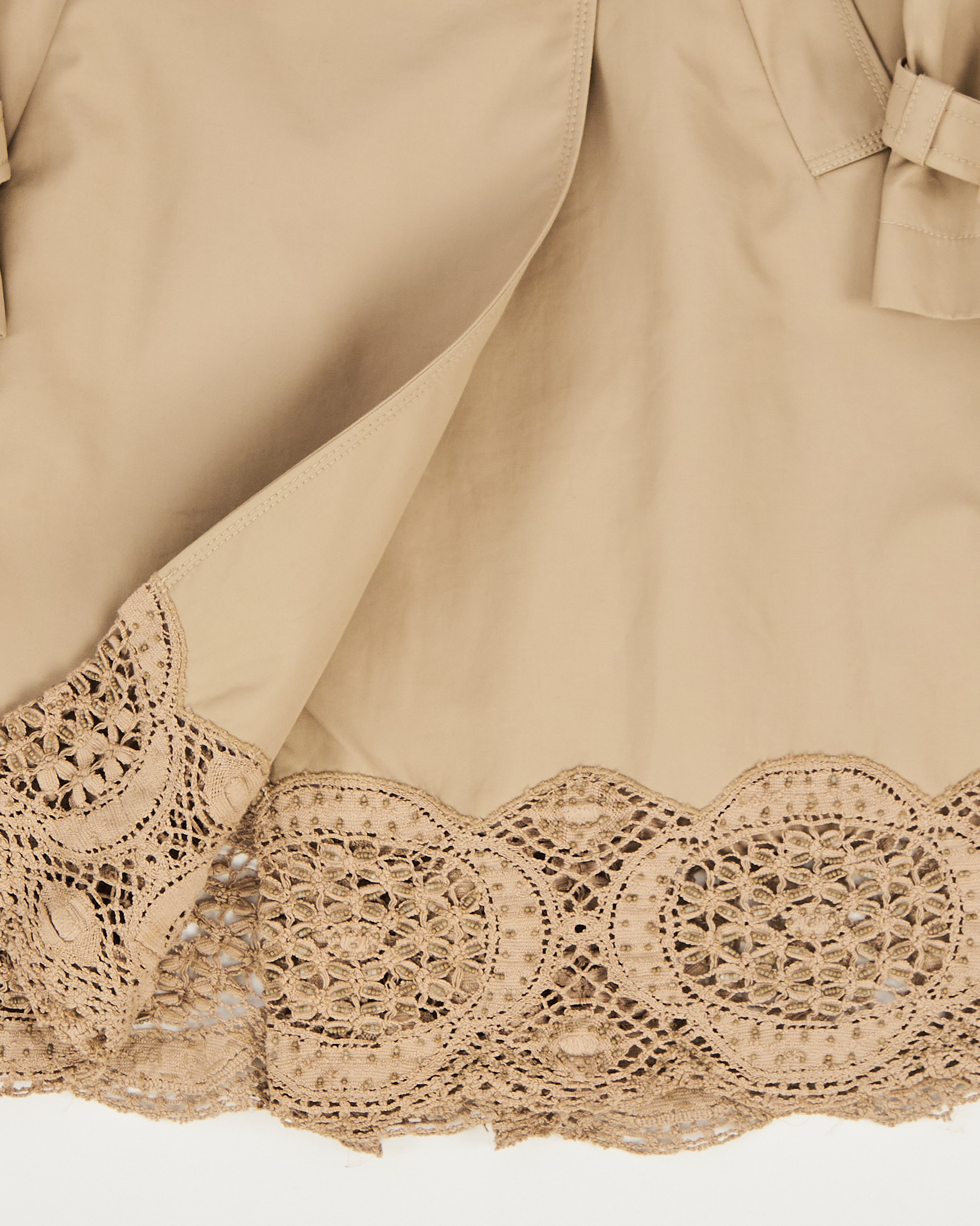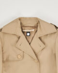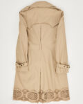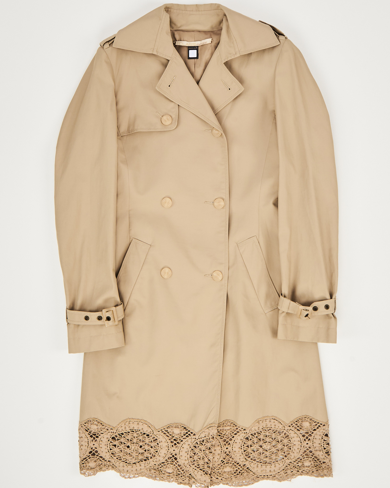 Двубортный тренч от бренда Class Roberto Cavalli  с подолом макраме. Классический крой, строгий силуэт с четким акцентом на линии талии. Контраст базового верха и сложного низа из фактурного макраме, детали в виде погонов и ремешков на манжетах.