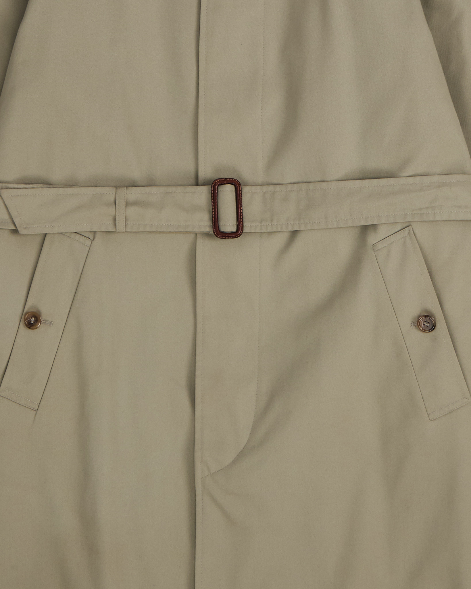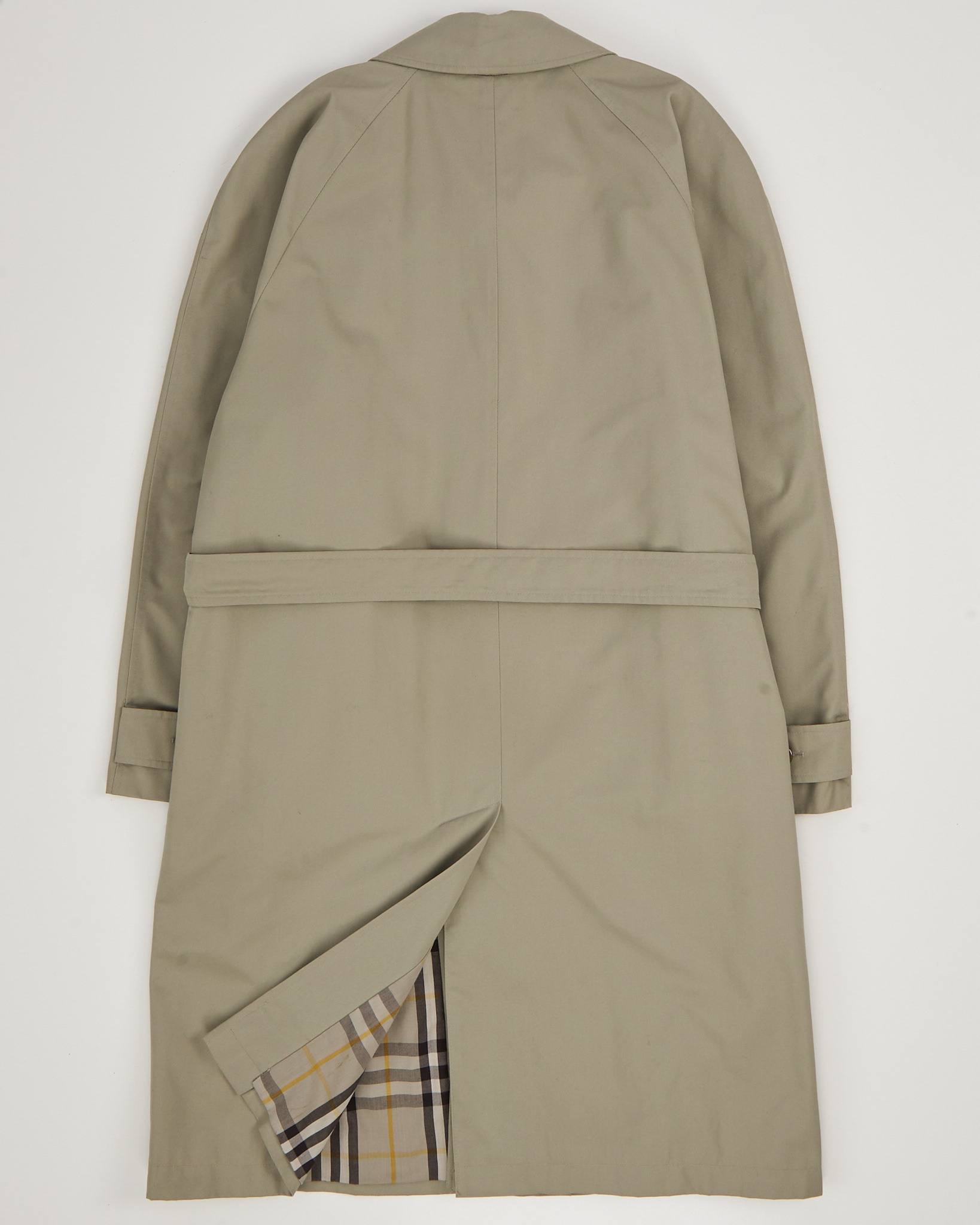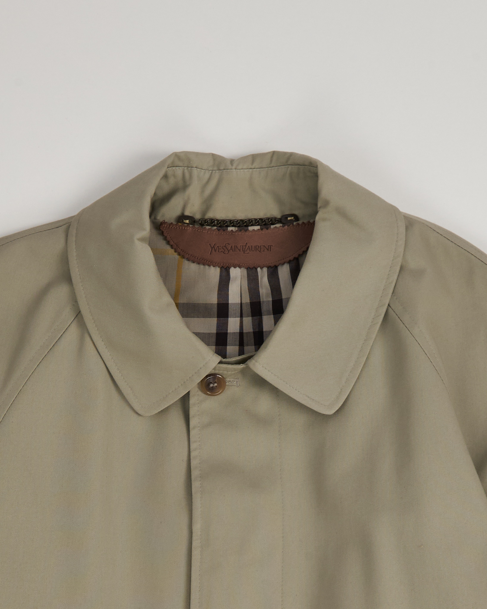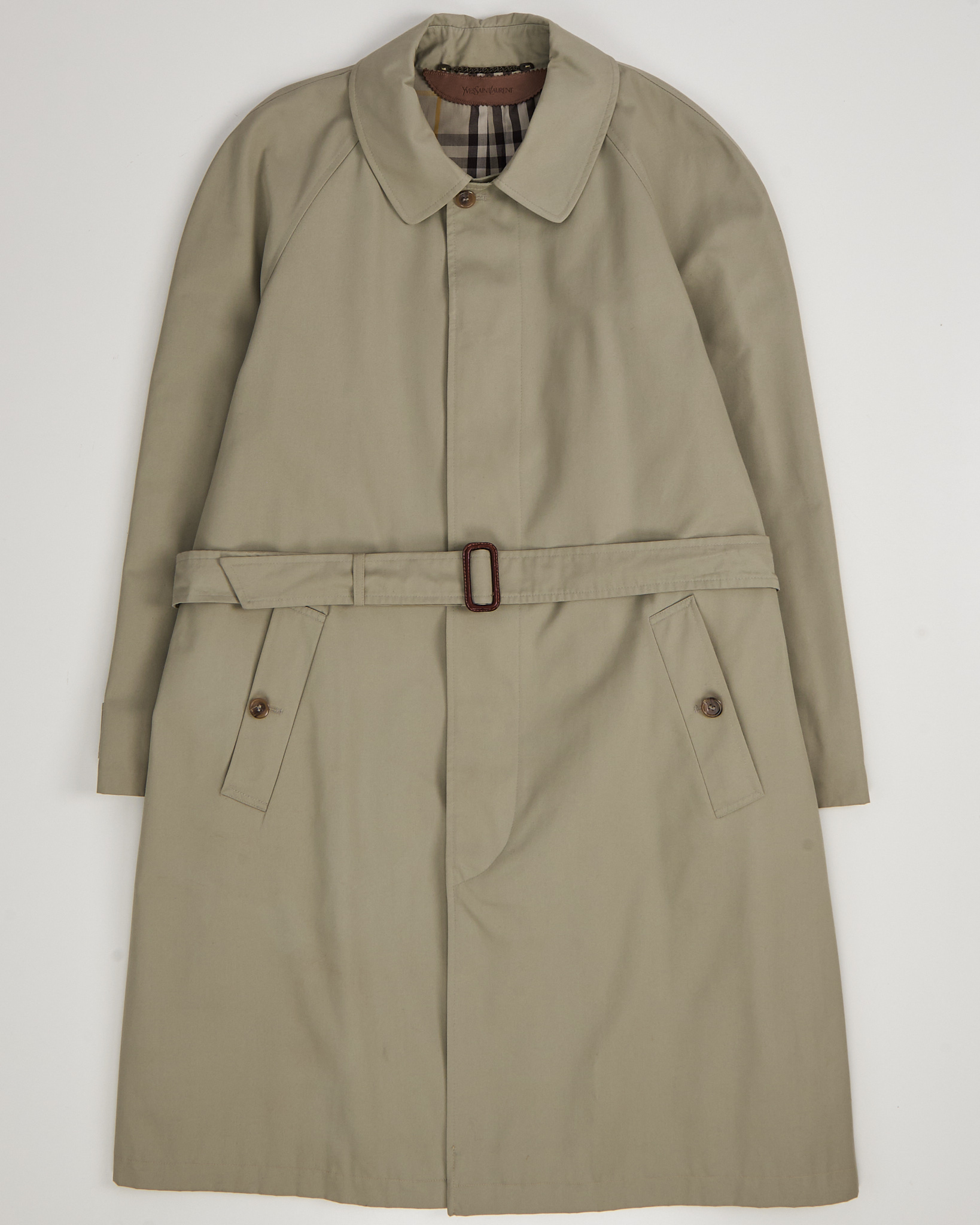 Тренч Yves Saint Laurent из плотной хлопковой ткани. Собранный силуэт, регулируемая посадка с помощью пояса. Аккуратный воротник, скрытая застёжка и кожаная деталь с логотипом бренда, клетчатая подкладка.