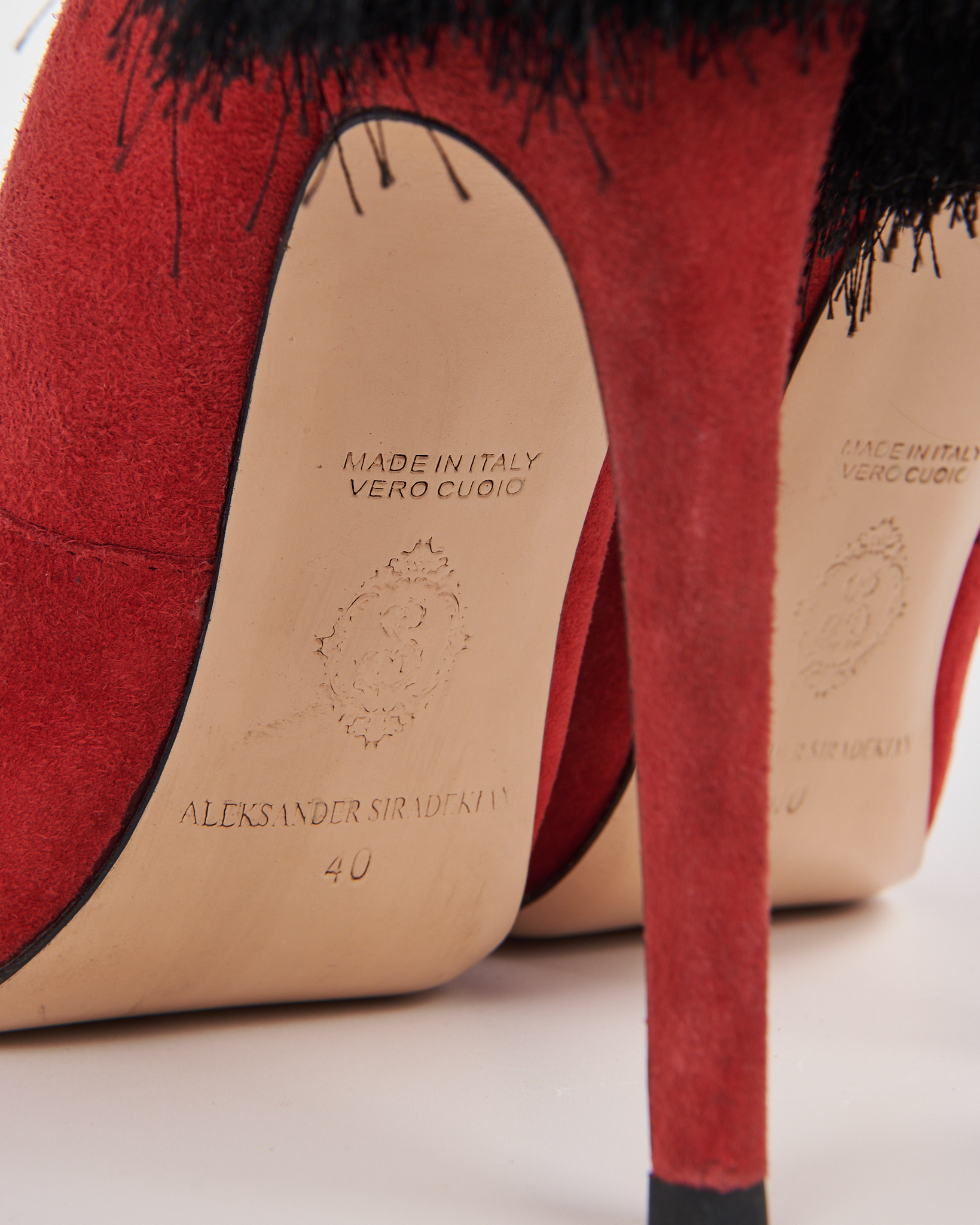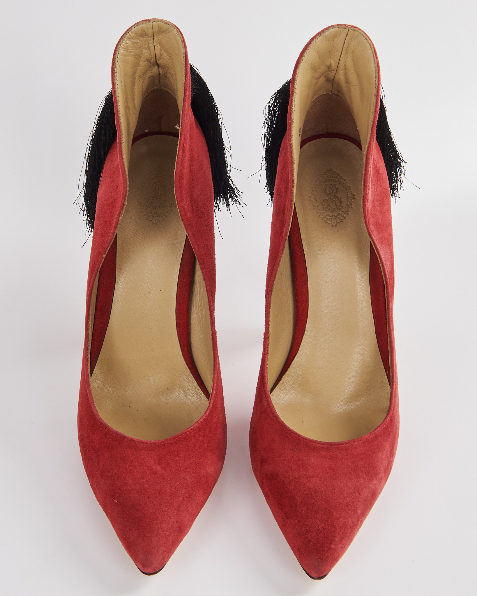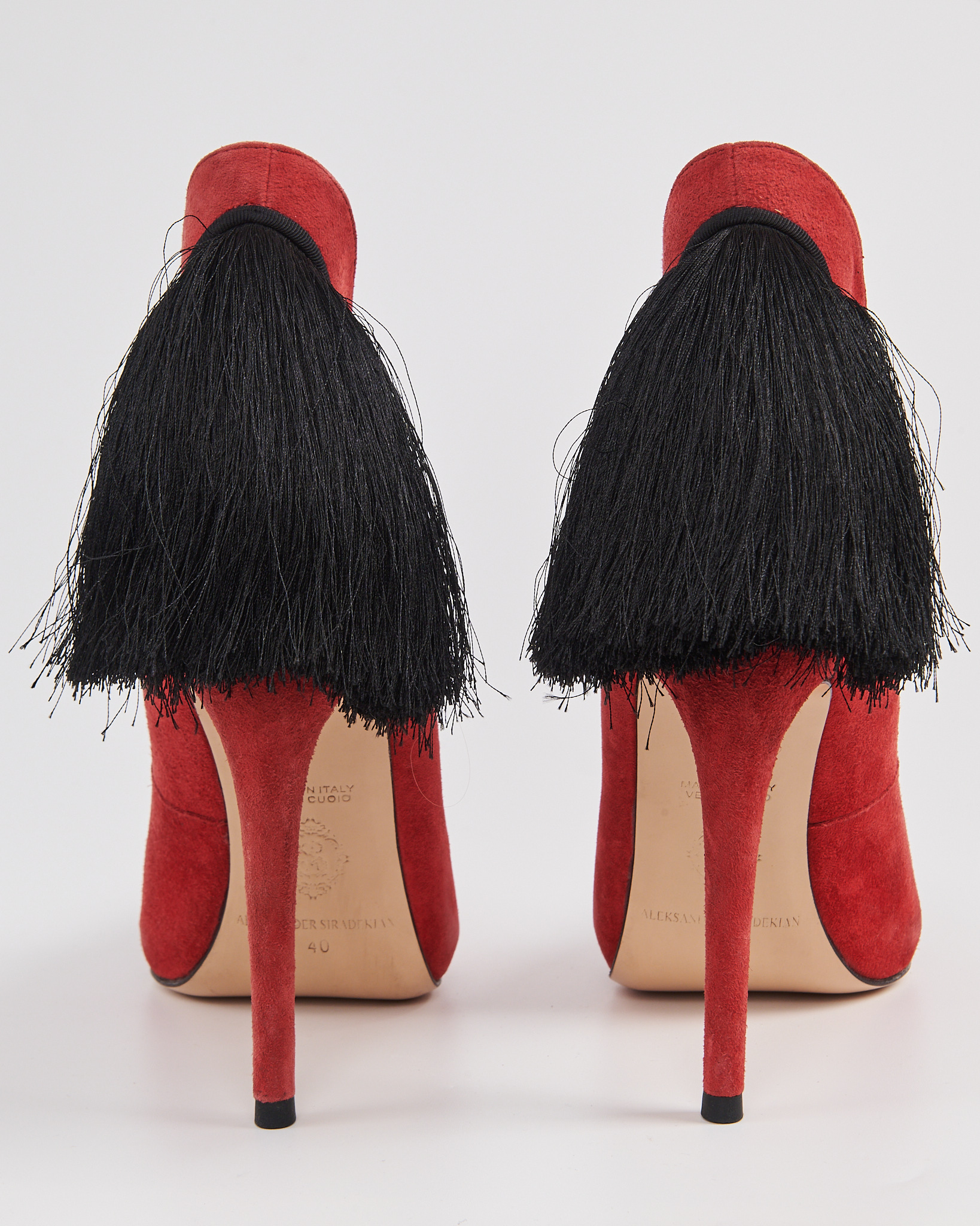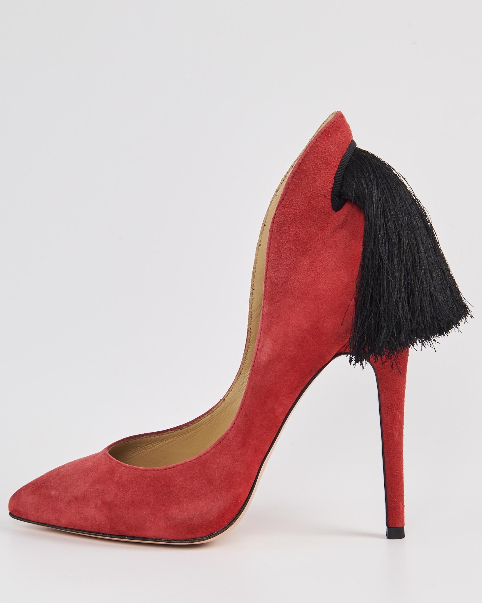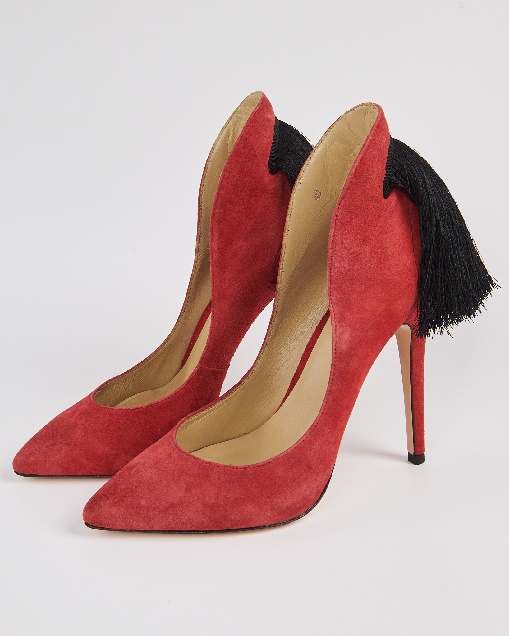 Туфли из мягкой замши в насыщенном красном оттенке. Выполнены с острым мысом и высоким тонким каблуком. Задняя часть дополнена длинными чёрными кистями. Внутренняя отделка из натуральной кожи
