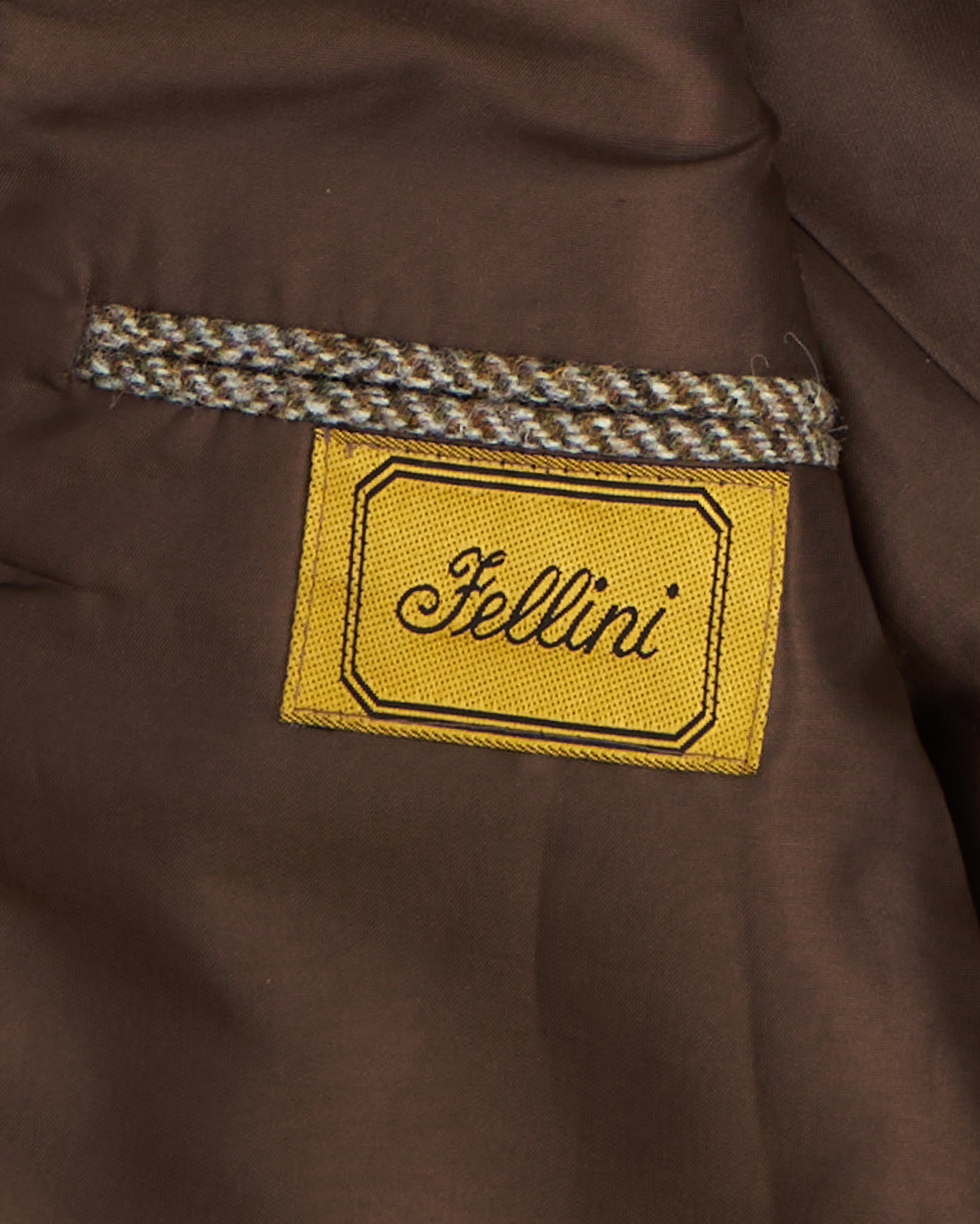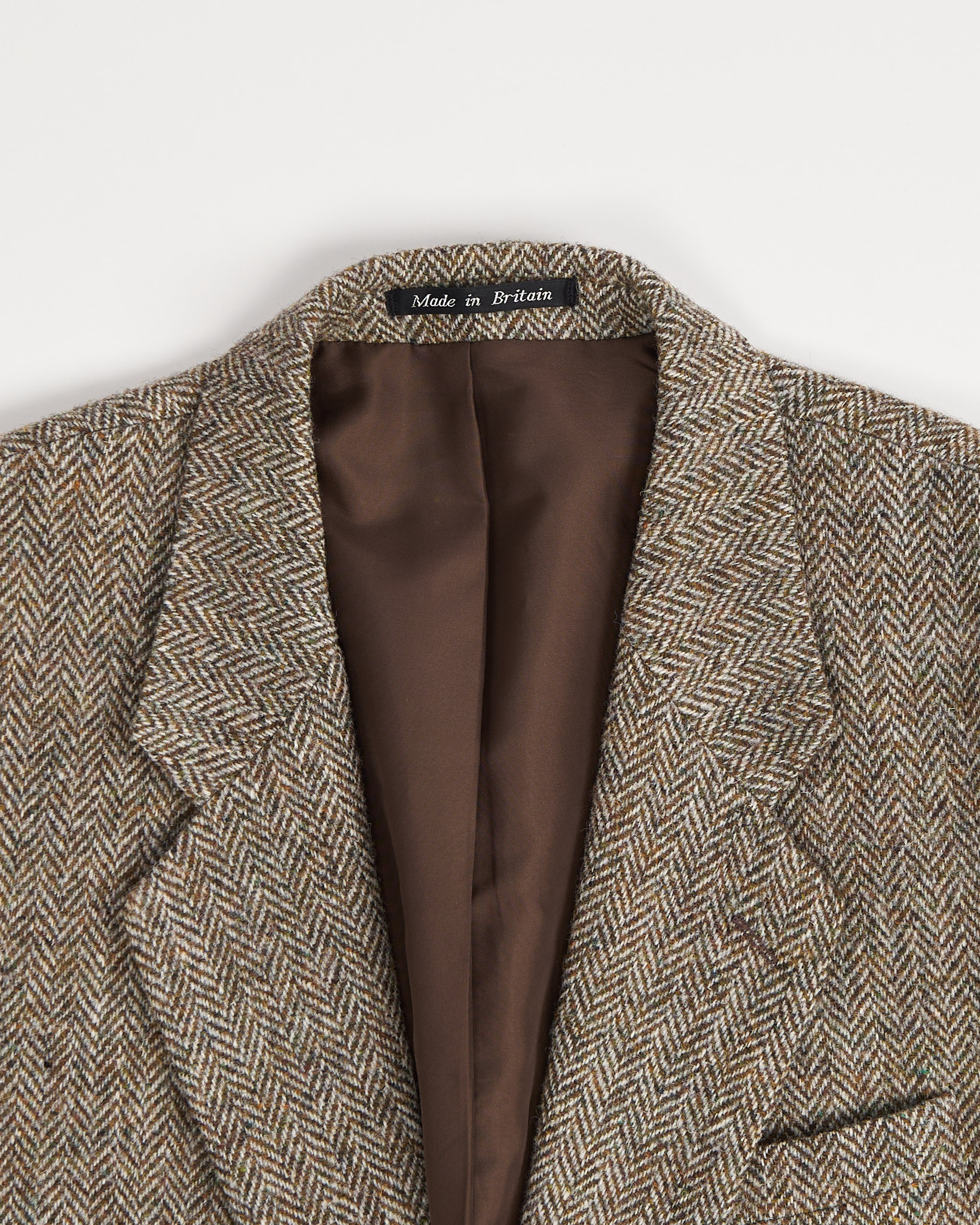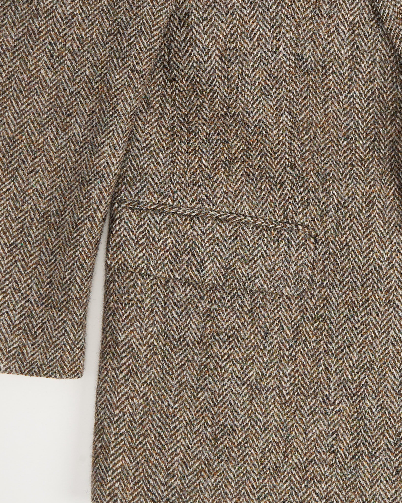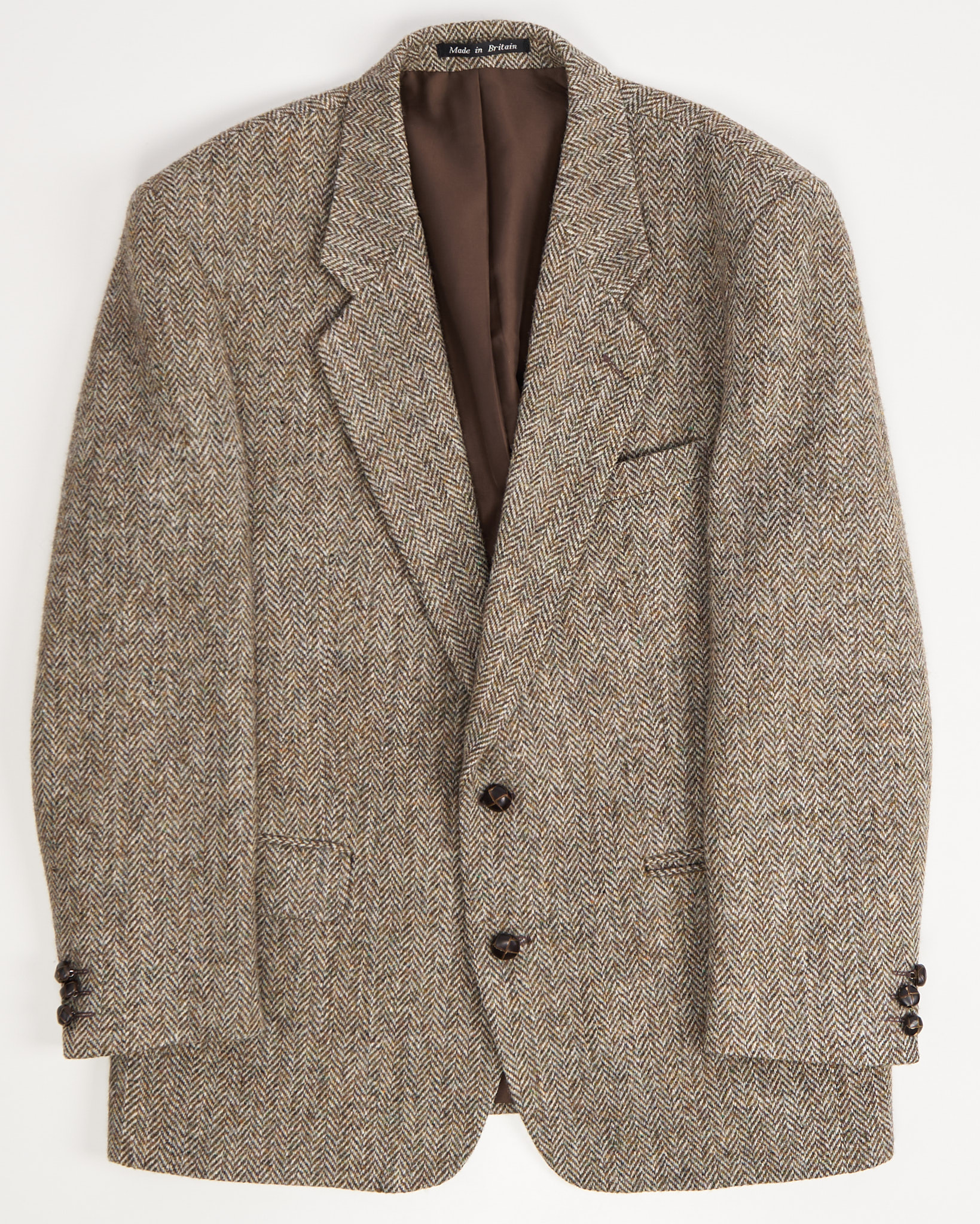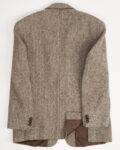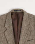 Универсальная модель в стиле унисекс из знаменитого шотландского твида Harris Tweed «в елочку». В основной бежевый цвет полотна вплетены желтые и зеленые нити. Обтяжные кожаные пуговицы, функциональные карманы по бокам.