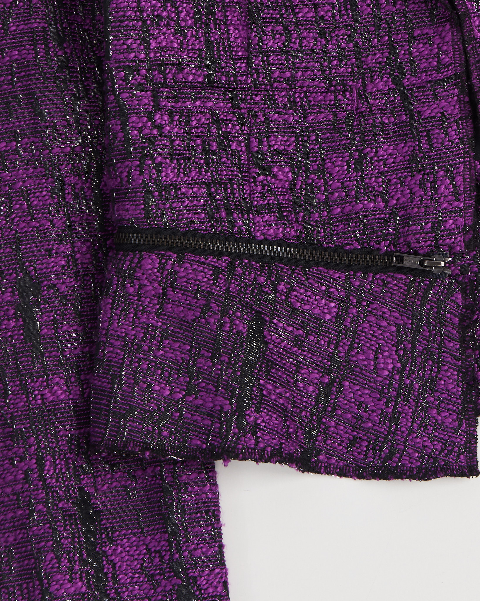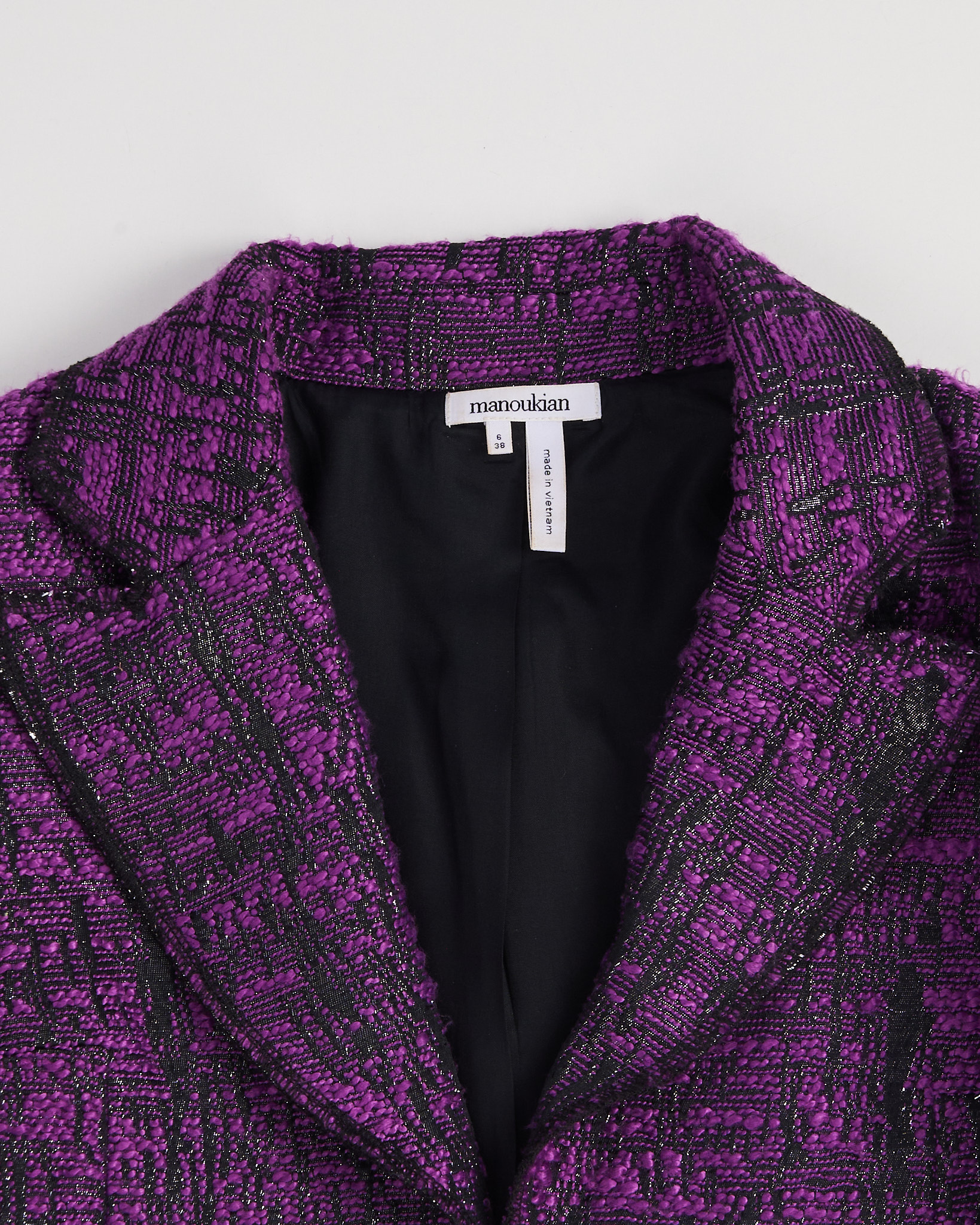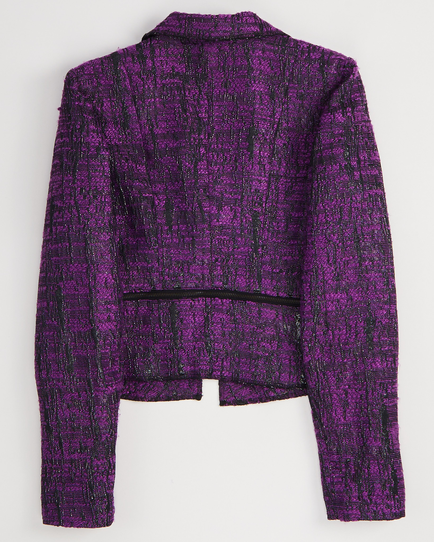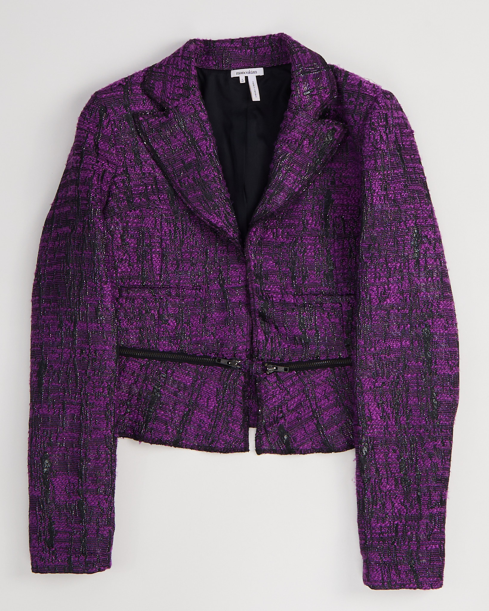 Жакет  Manoukian в насыщенном фиолетово-чёрном оттенке. Посадка прямая, линия плеч чёткая, длина укороченная. Материал с выраженной фактурой, на ощупь плотный и рельефный. Декоративная молния по линии талии придает акцент.