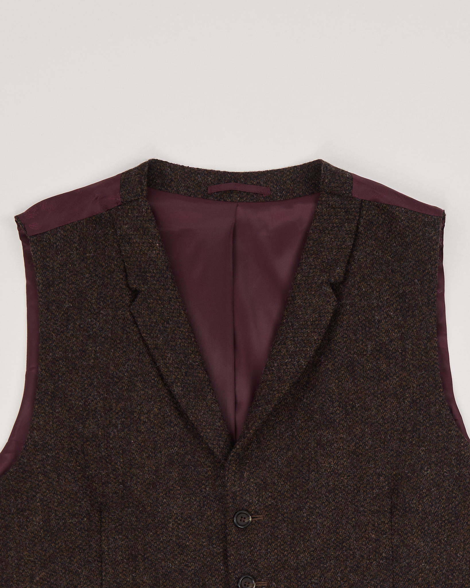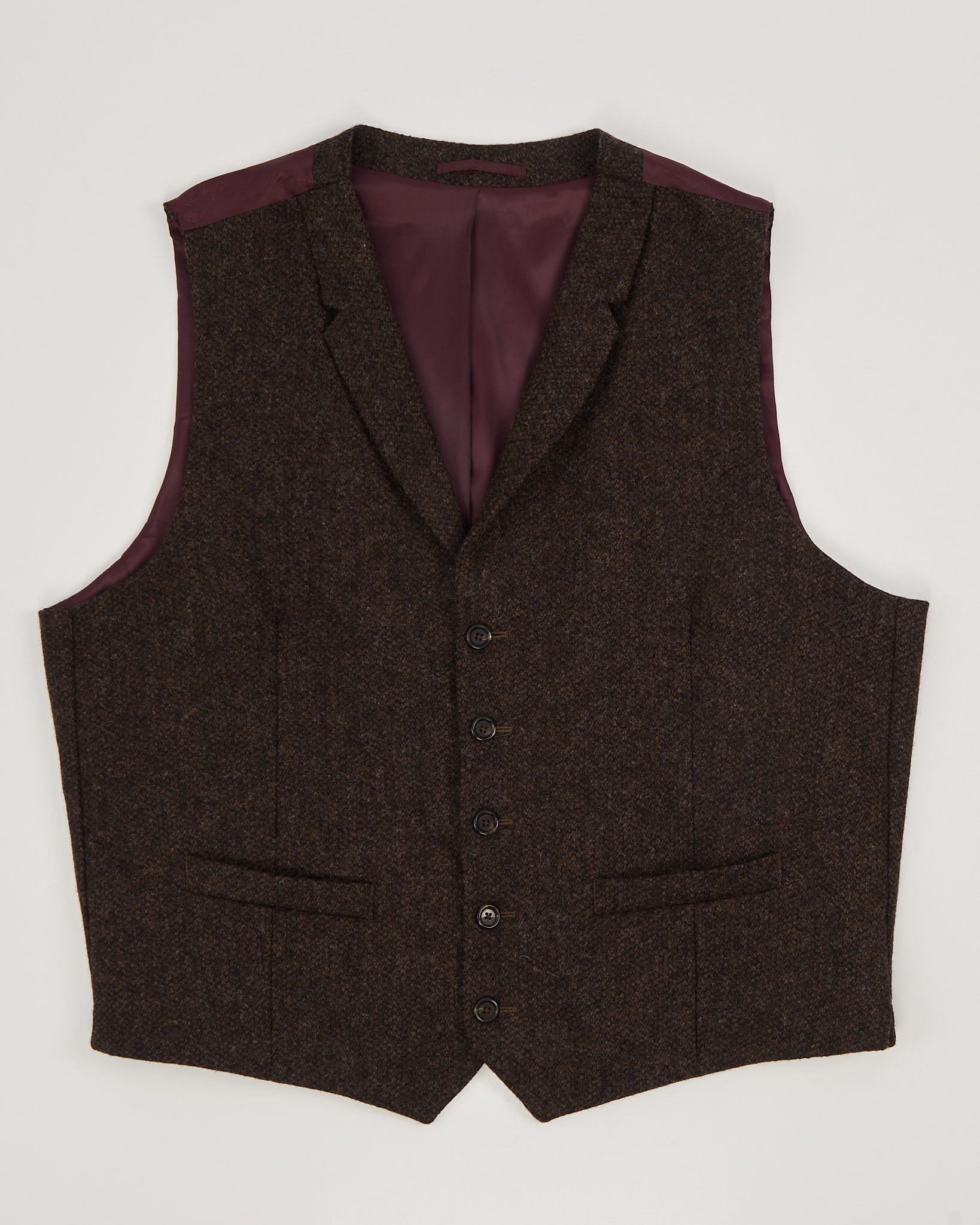 Классический жилет из 100% шерсти. Прямой силуэт. Отложной воротник с лацканами. Подкладка насыщенно-бордового цвета.