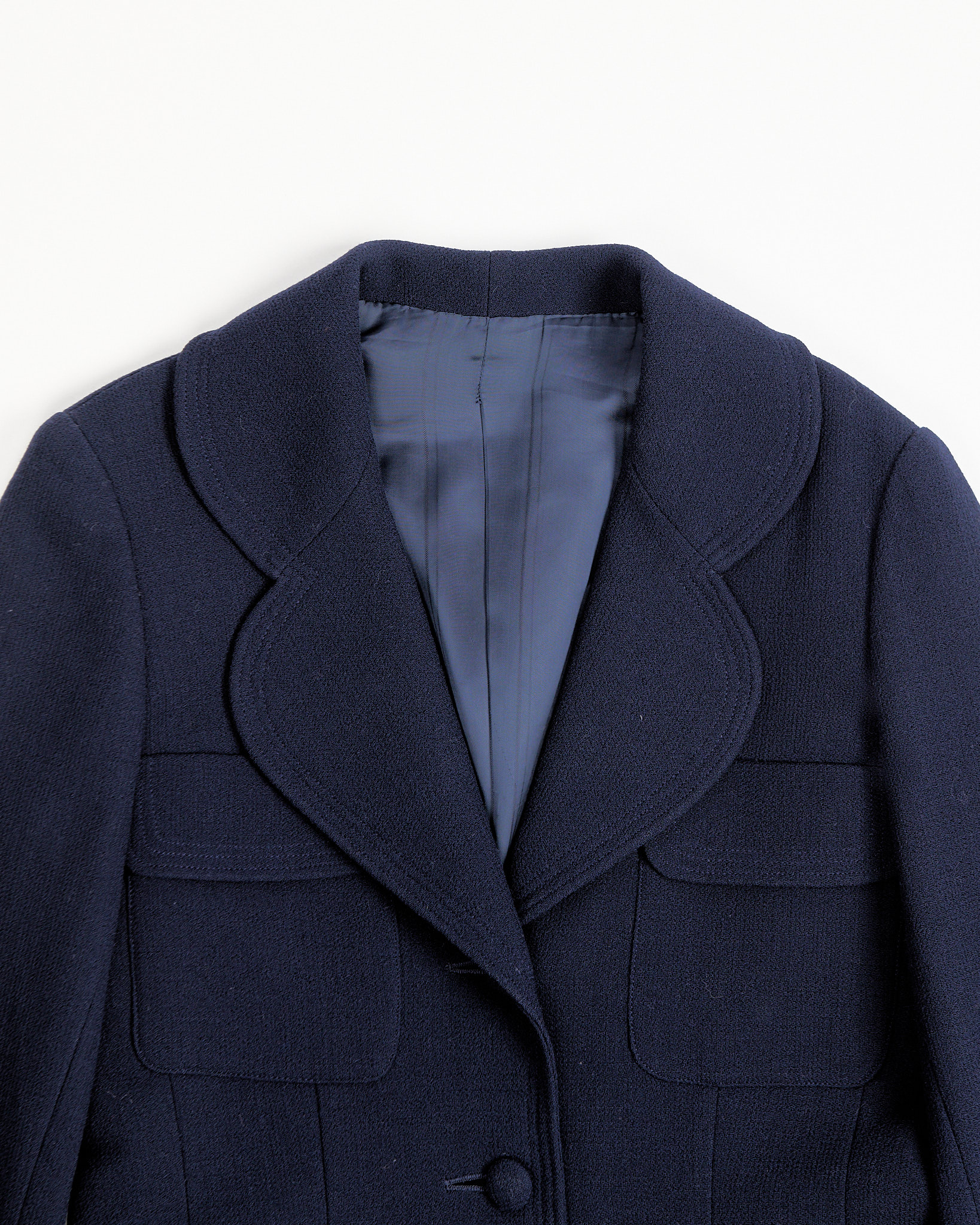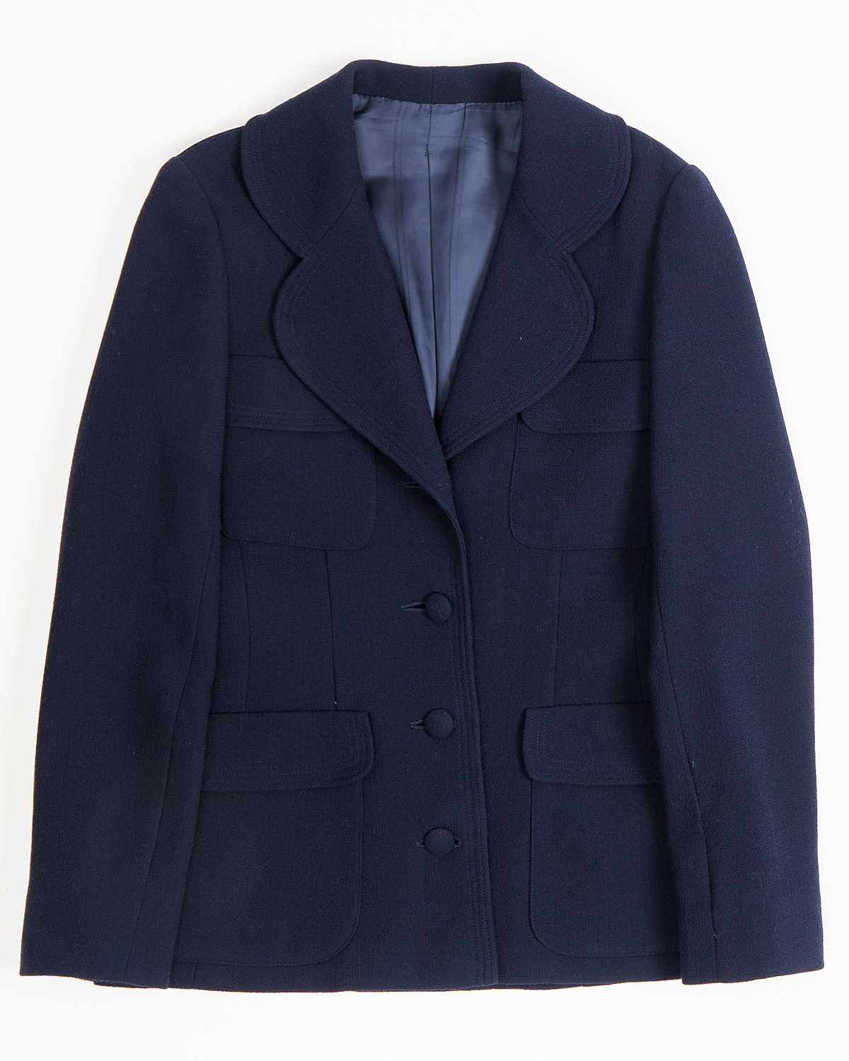 Жакет из плотной ткани, с выраженной фактурой. Посадка полуприлегающая. Фигурный воротник и накладные карманы с клапанами