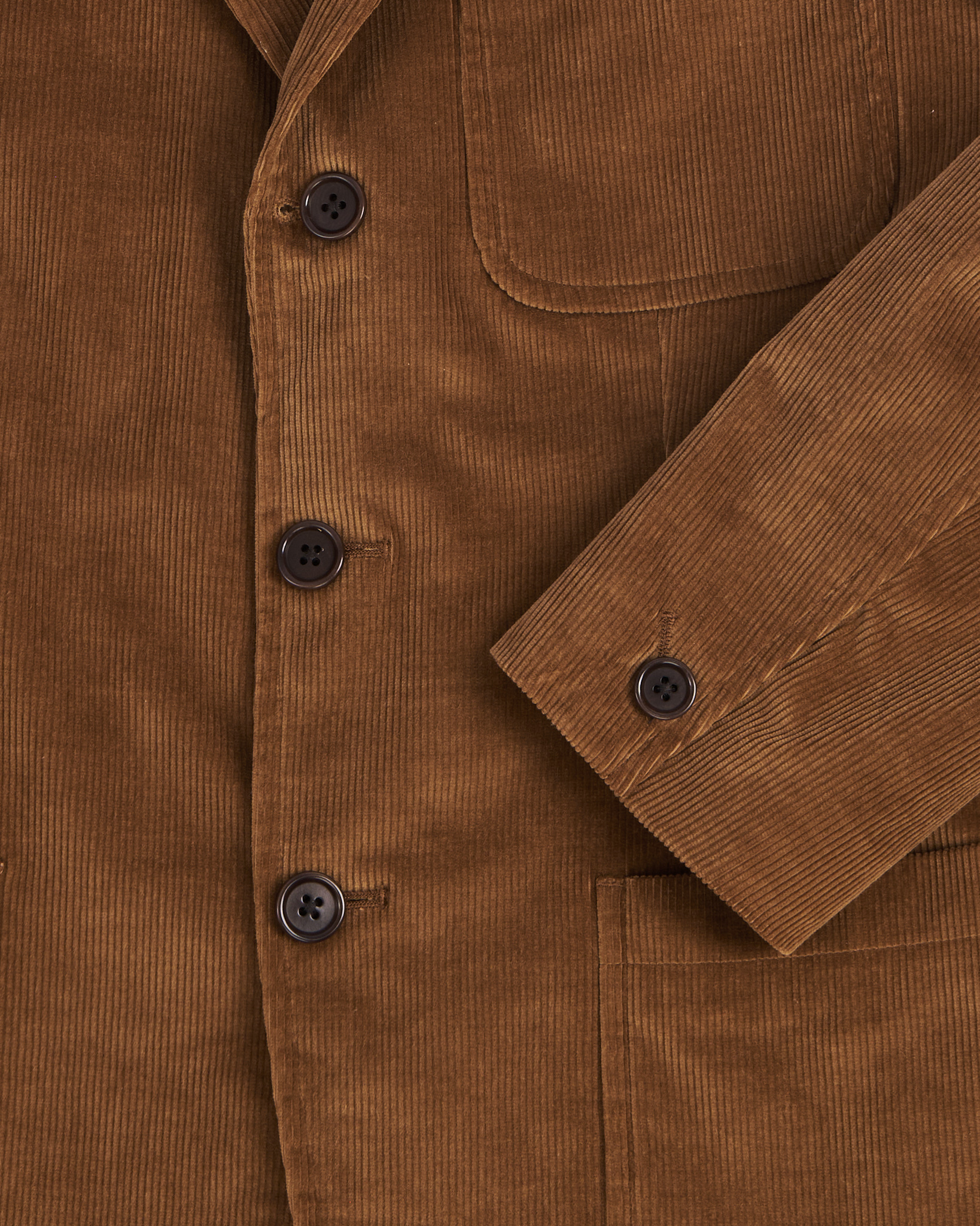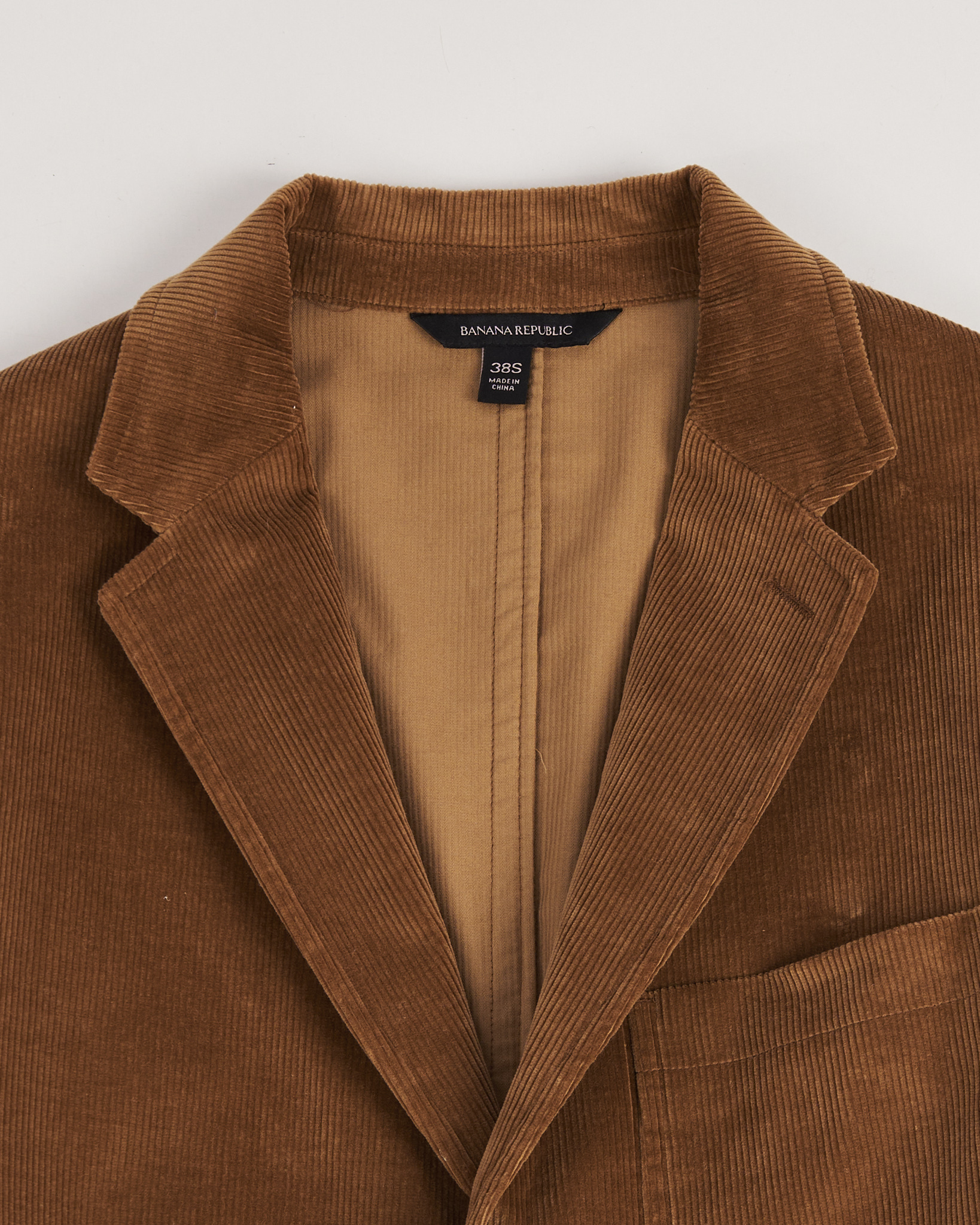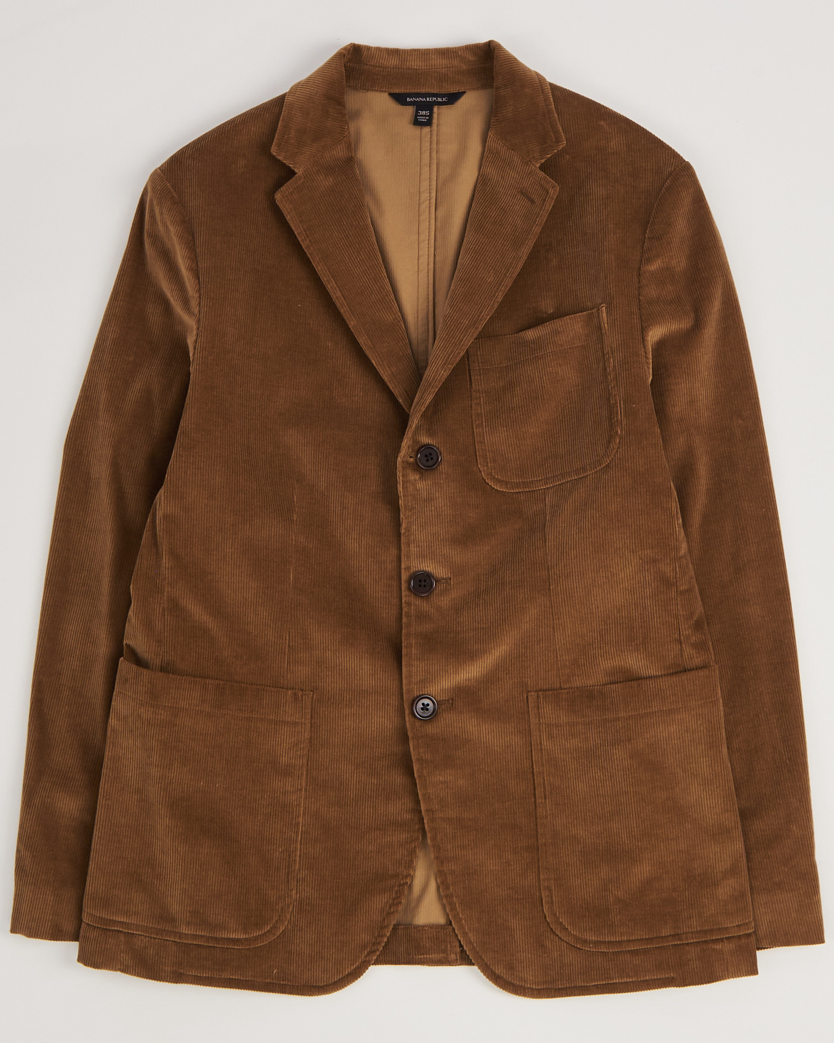 Пиджак из мягкого вельвета от Banana Republic. Выполнен в тёплом коричневом оттенке с выраженной фактурой рубчика и бархатистой поверхностью. Классический лацкан и застёжка на пуговицы. Накладные карманы
