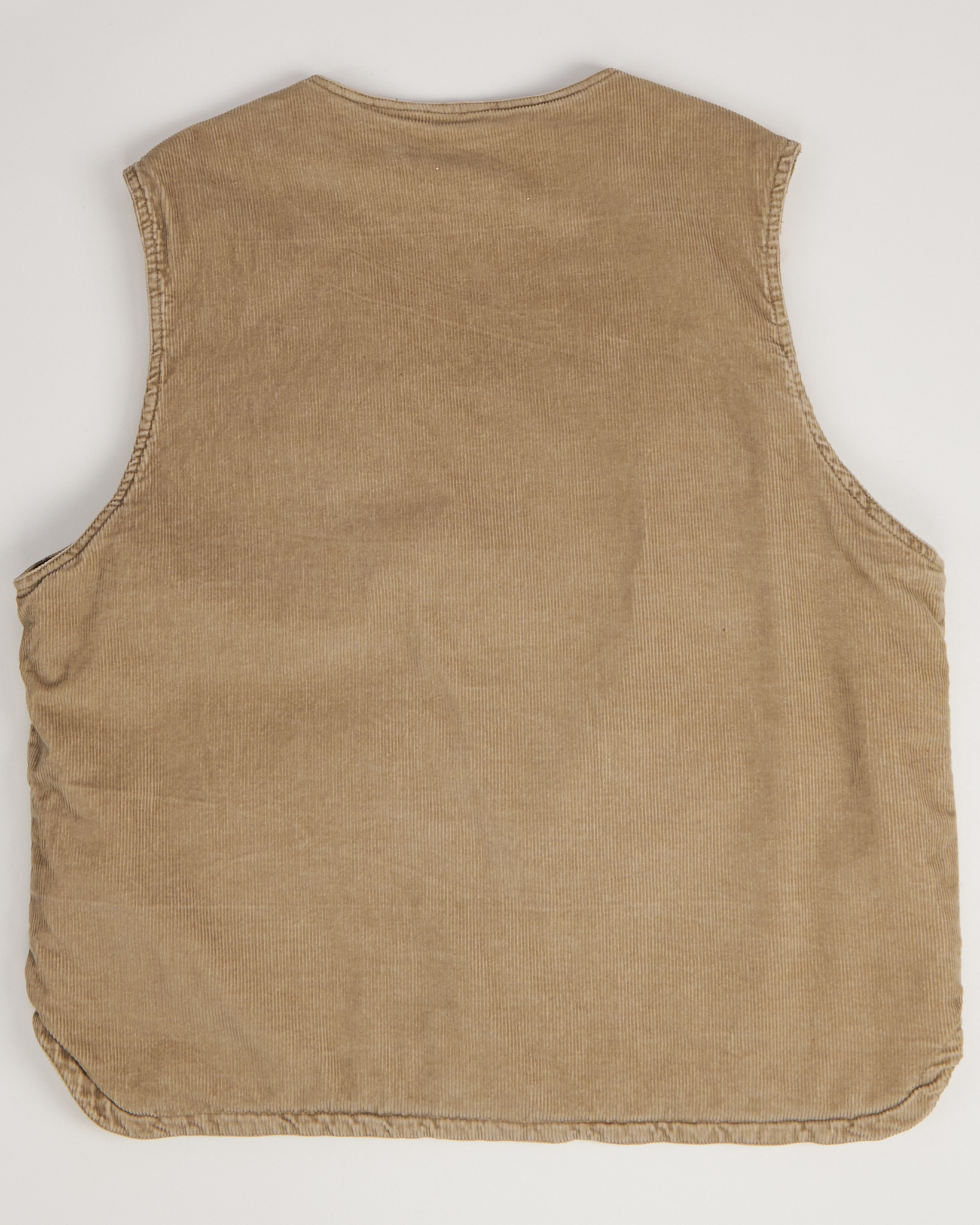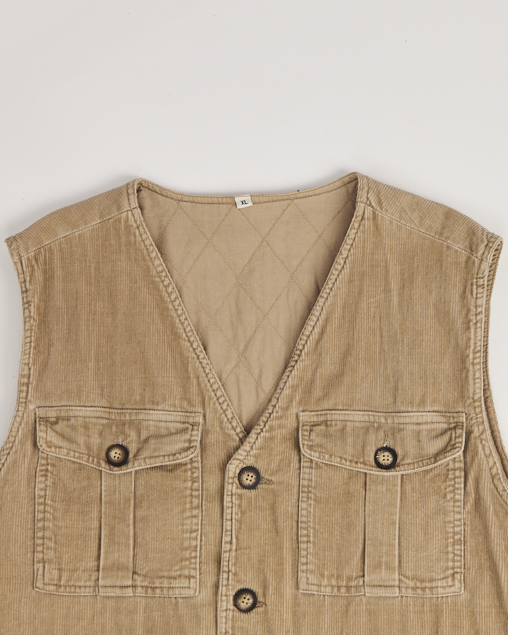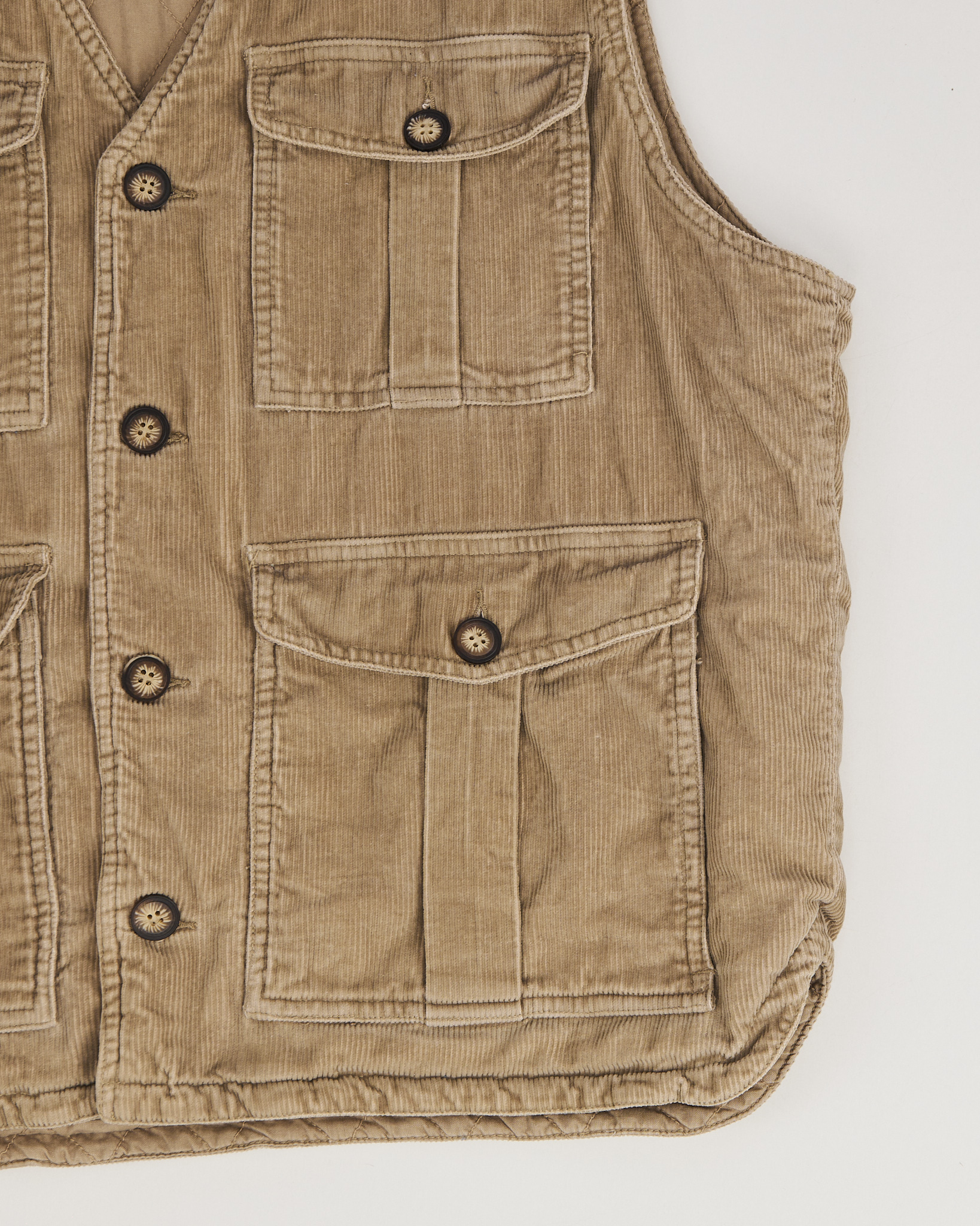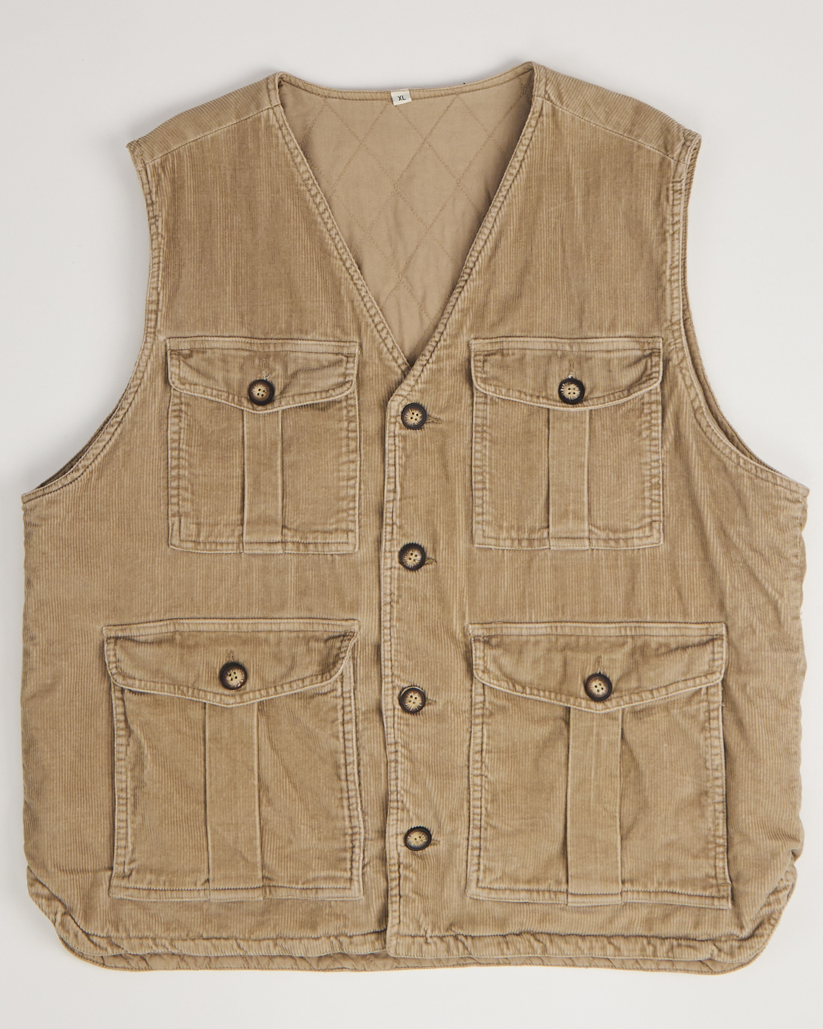 Жилет из плотного хлопкового вельвета. Тёплого песочного оттенка. Прямой крой с удобной посадкой, комфортно садится по корпусу и подходит для многослойных образов. Материал мягкий, с выраженной фактурой рубчика и лёгким бархатистым эффектом. Четыре накладных кармана с клапанами и застёжка на пуговицах. Стёганая подкладка