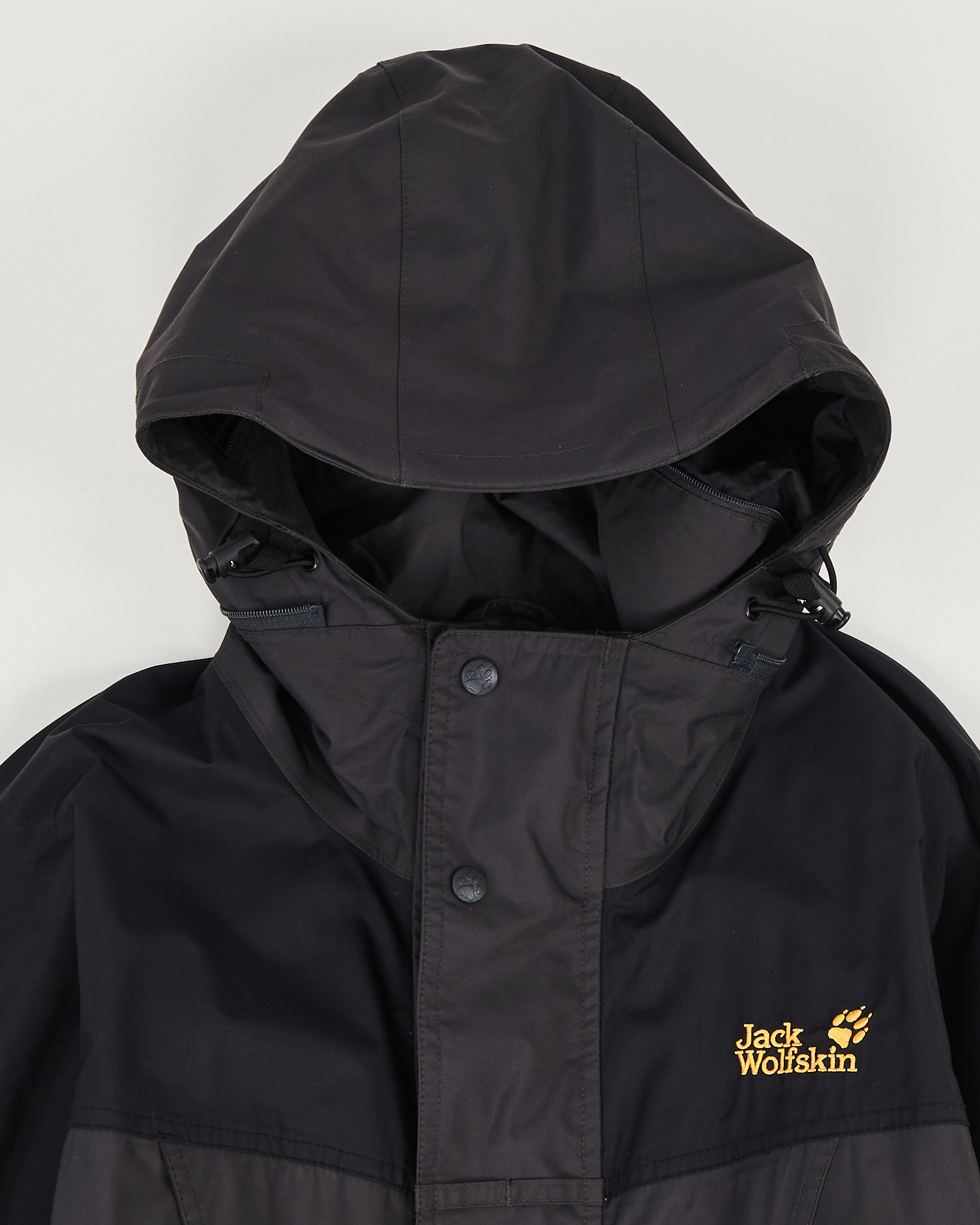 Ветровка Jack Wolfskin из плотного материала. Ткань гладкая и приятная на ощупь, свободная посадка, высокий ворот на клепках и удобный капюшон. Контрастный логотип Jack Wolfskin на груди и спине, функциональные карманы по бокам, акцентная кулиска, дышащая подкладка.