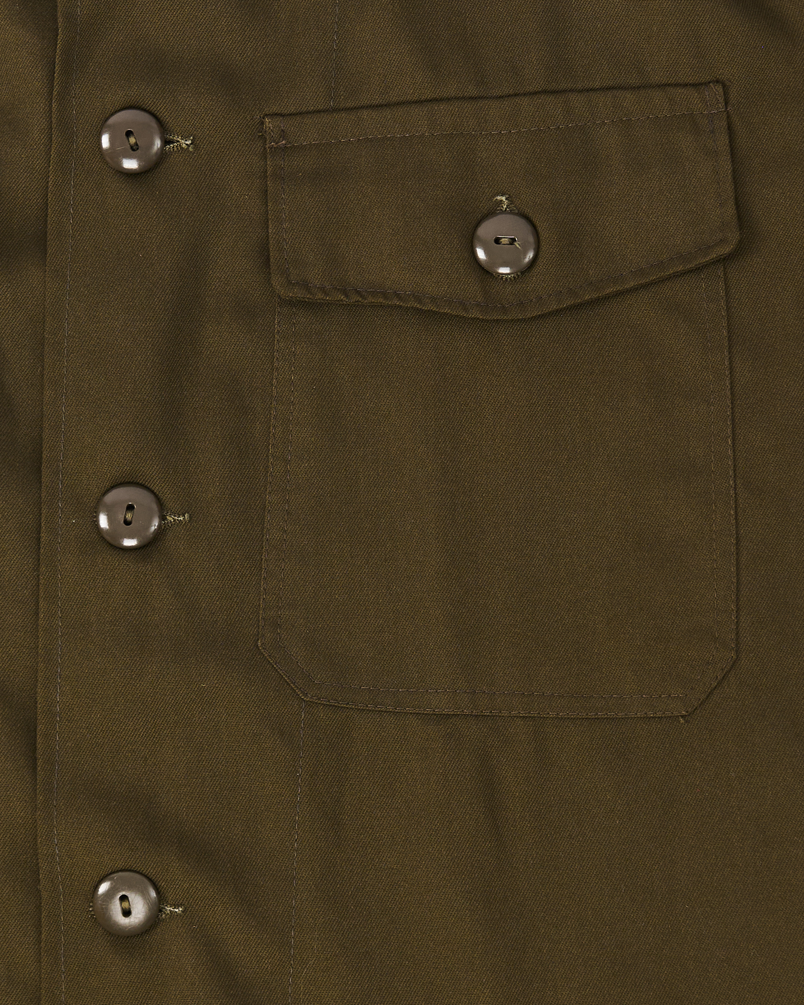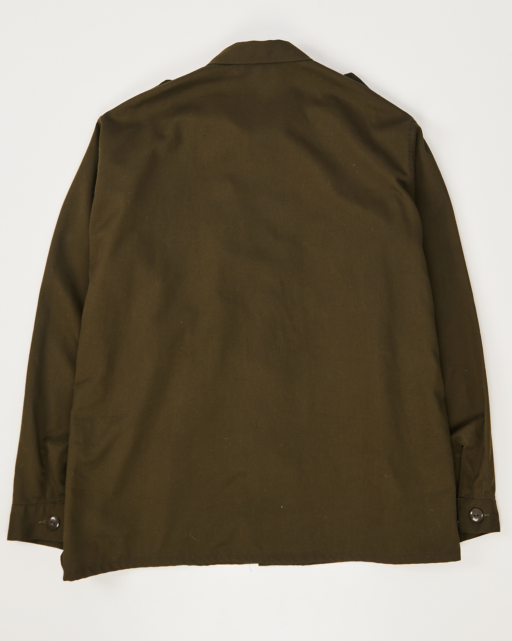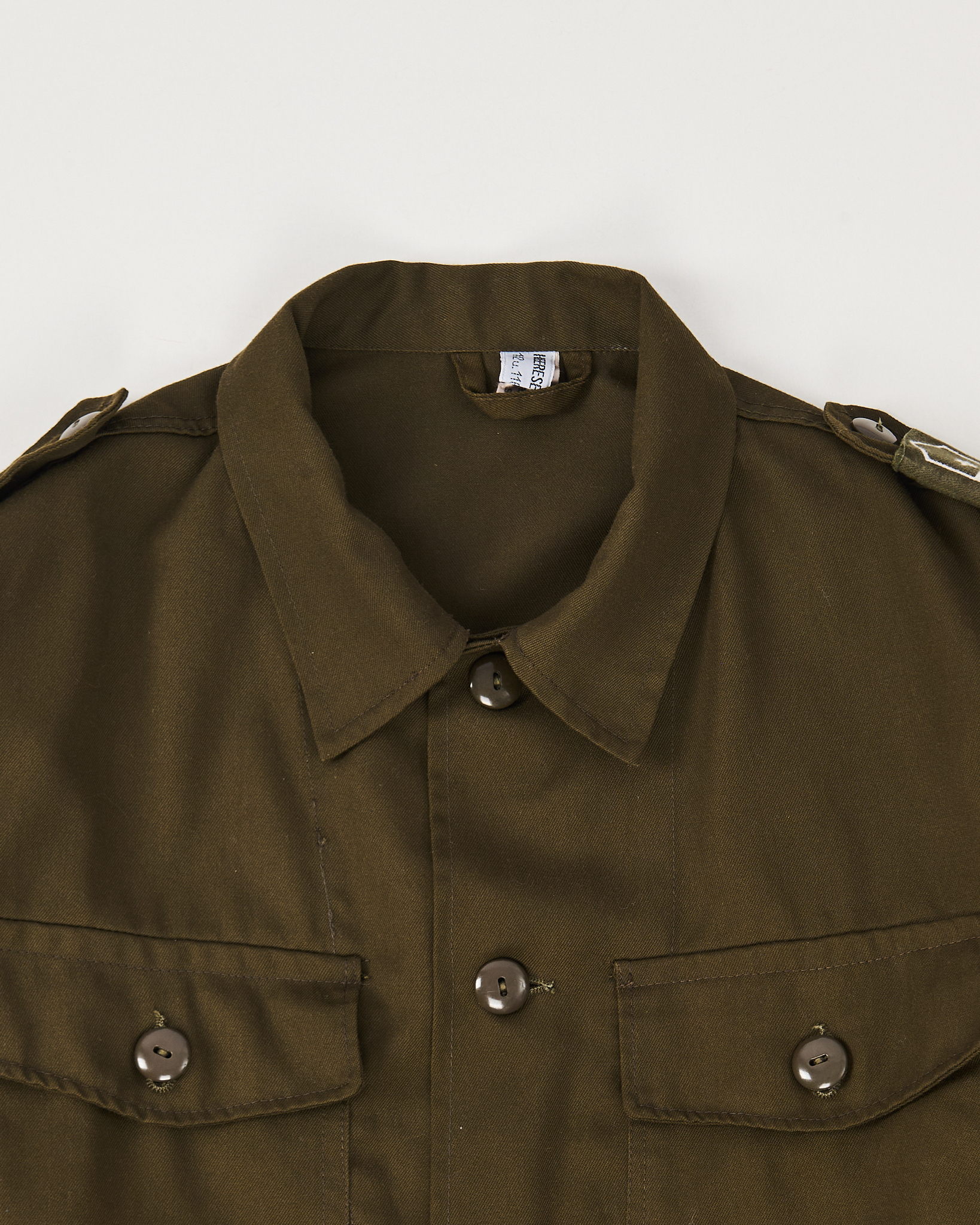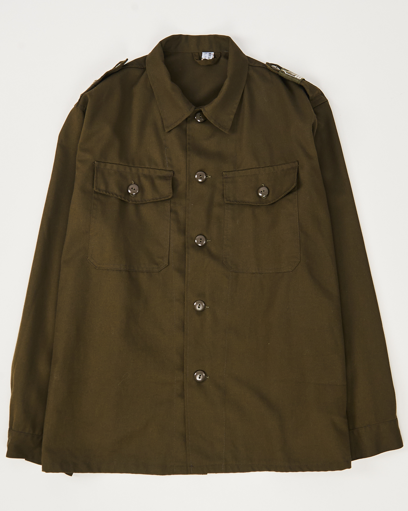 Рубашка цвета хаки в стиле милитари. Свободный, удлиненный крой, два нагрудных кармана с клапанами, погоны с на плечах, фронтальная застежка на пуговицах и рукава с манжетами.