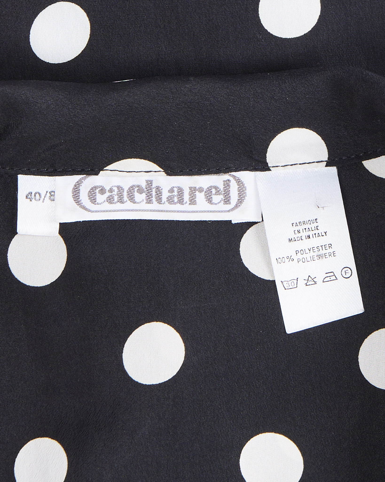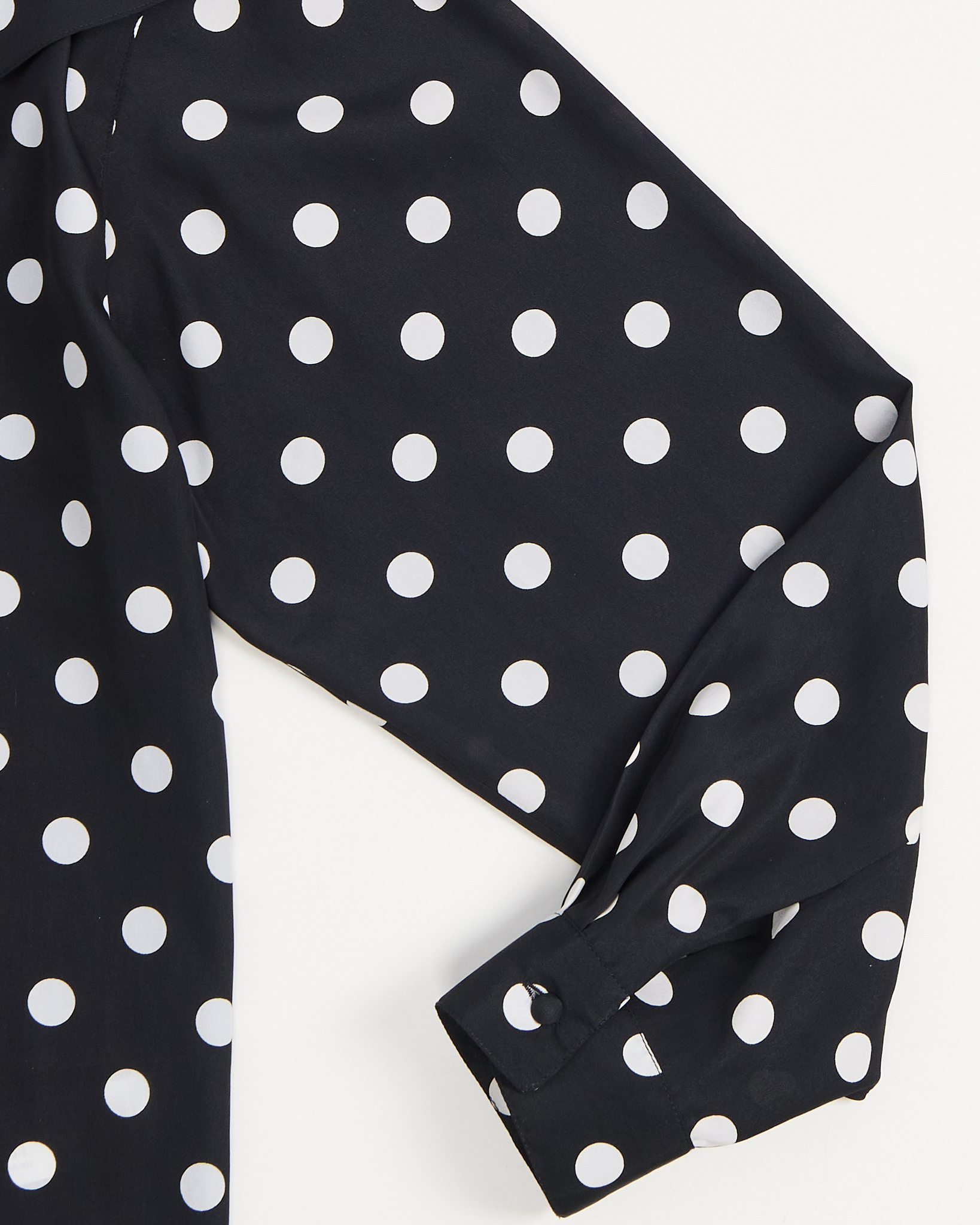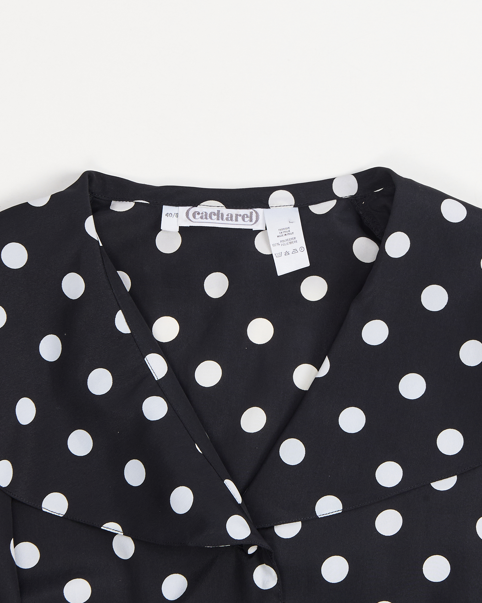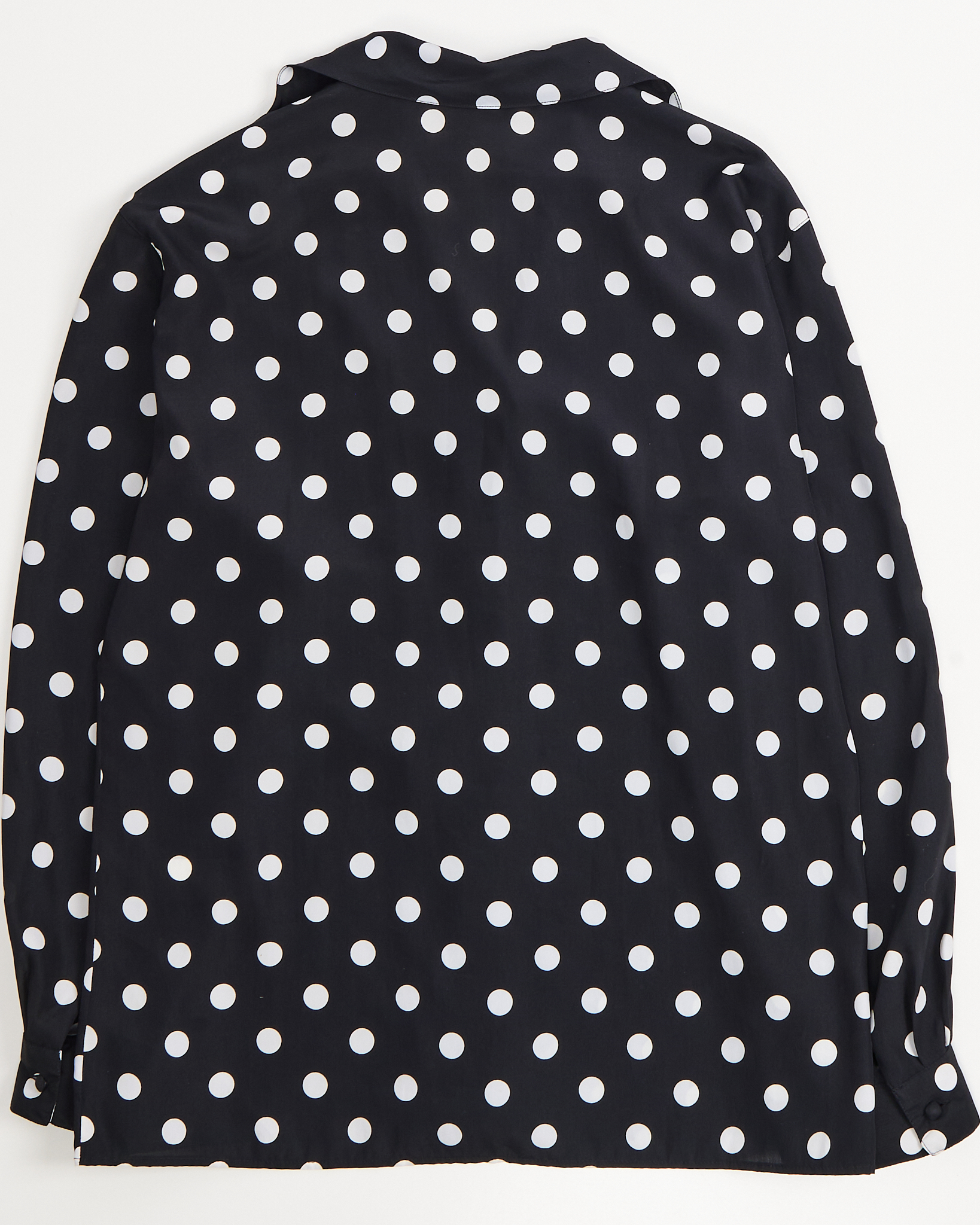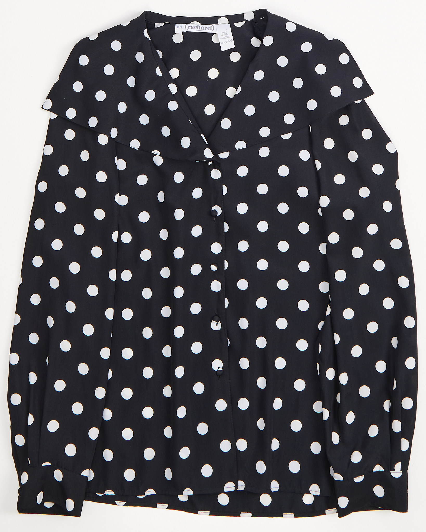 Стильная черная блуза в белый горох made in Italy. Струящийся воротник, обшивные пуговицы. Трендовая вещь от французского бренда.
