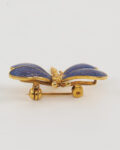 Винтажная брошь в золотом оттенке с фиолетовыми крыльями. Фактура крыльев рельефная, застёжка фиксирует изделие чётко и надёжно. Детальная проработка крыльев и корпуса придаёт аксессуару акцент.