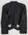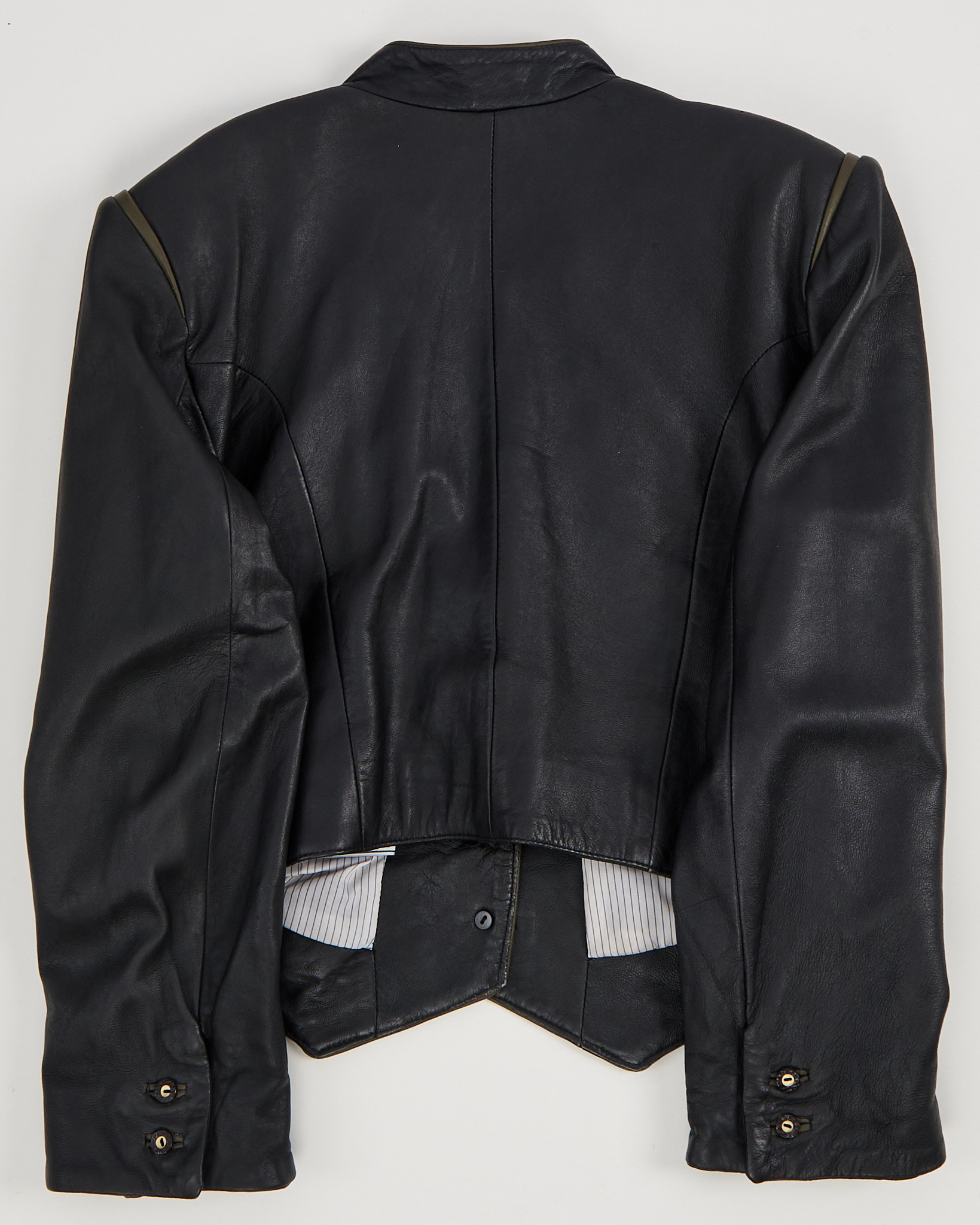 Двубортная куртка из 100% натуральной кожи. Приталенный силуэт, контрастная отделка карманов и лацканов, внутренняя подкладка в тонкую полоску.