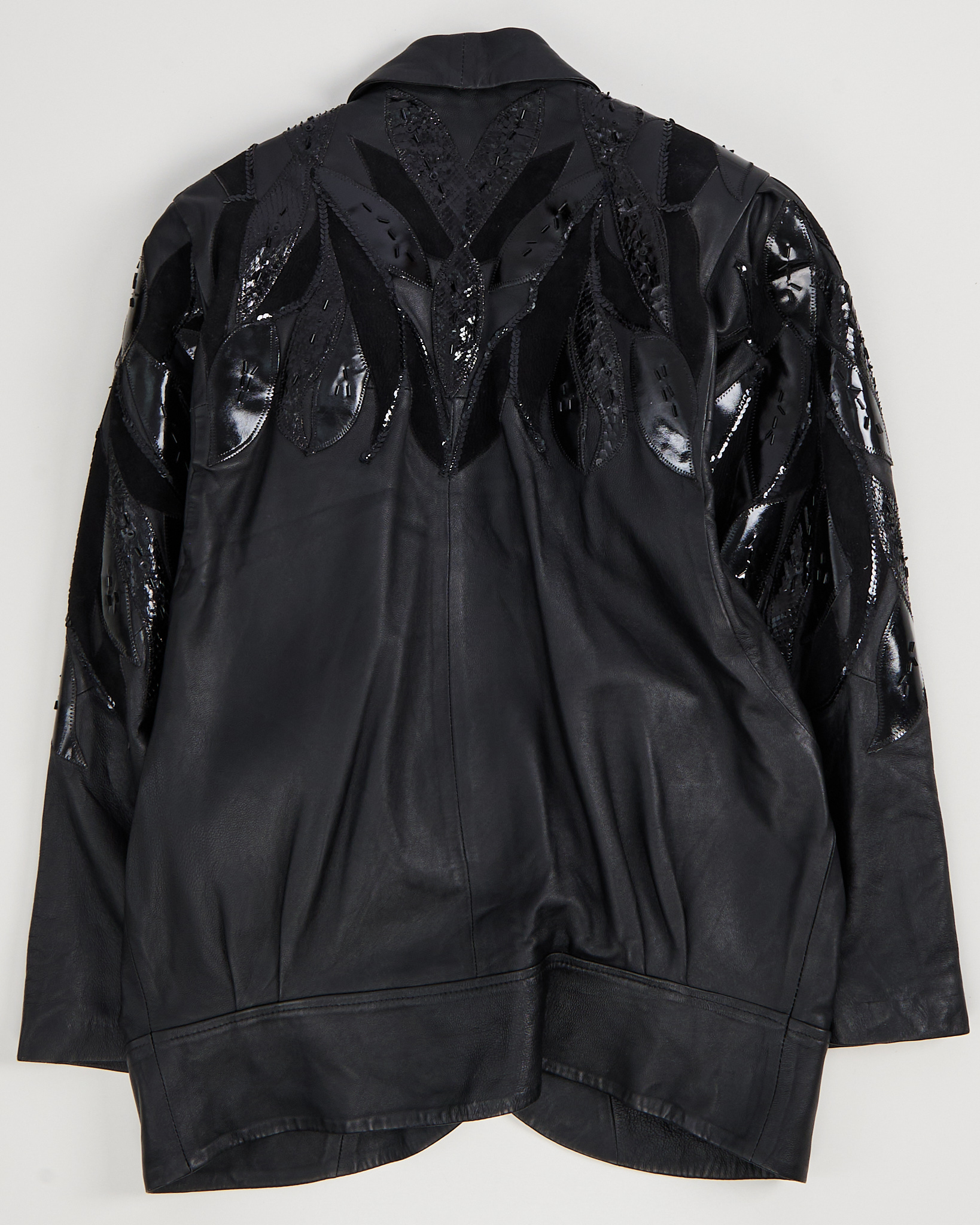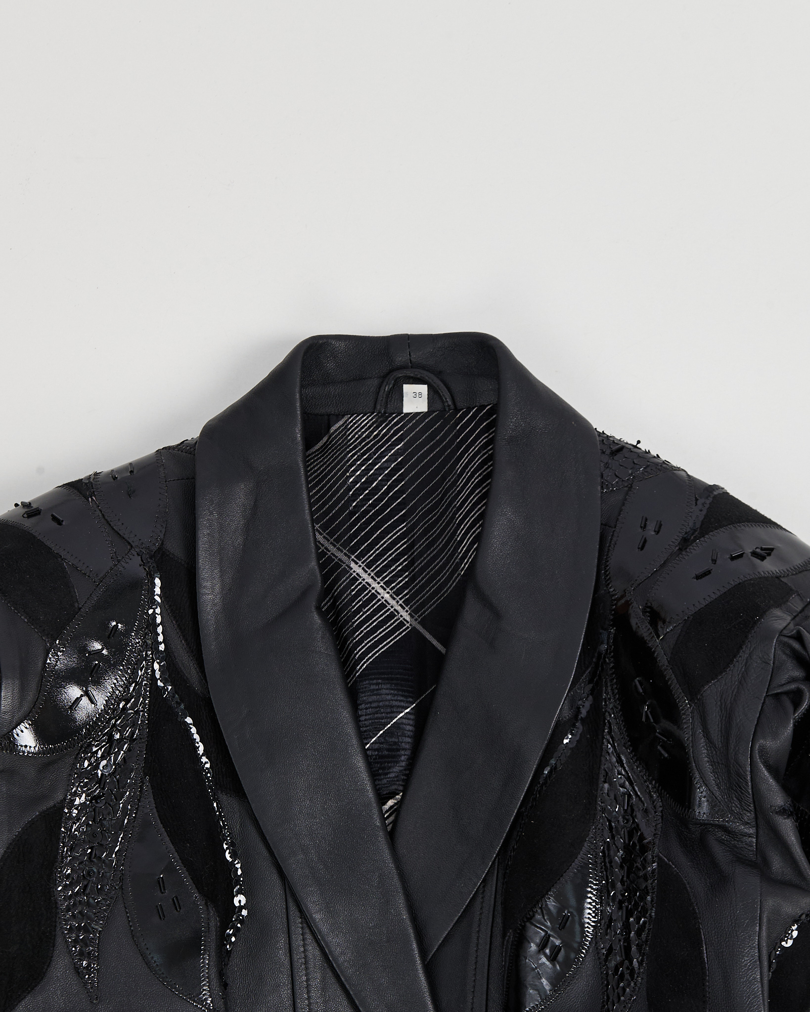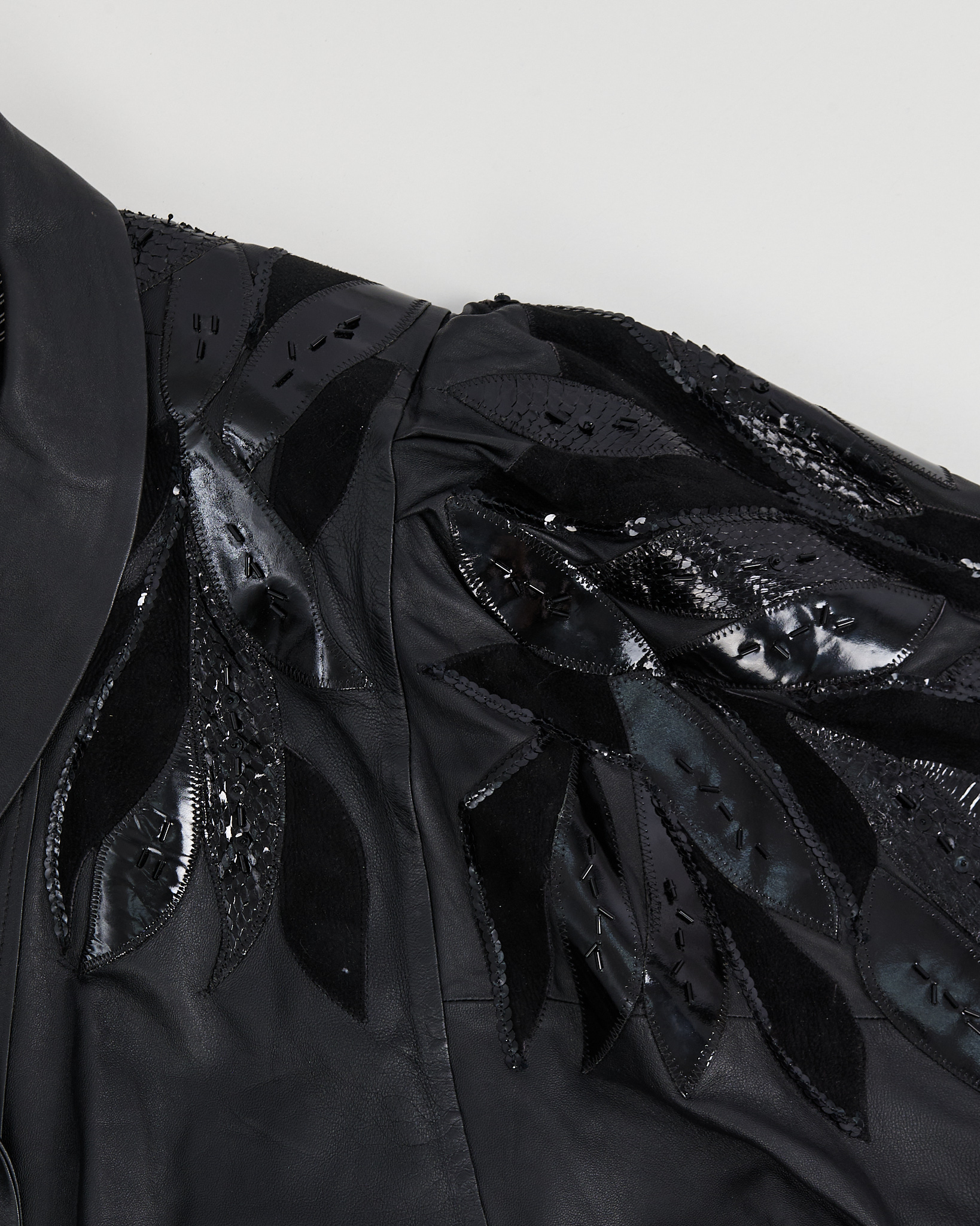 Кожаная куртка с декоративной отделкой. Выполнена из мягкой 100% натуральной кожи. Посадка свободная, укаршена декоративными кожаными вставками с пайетками и бисером. Застёжка на пуговицу, функциональные карманы по бокам.