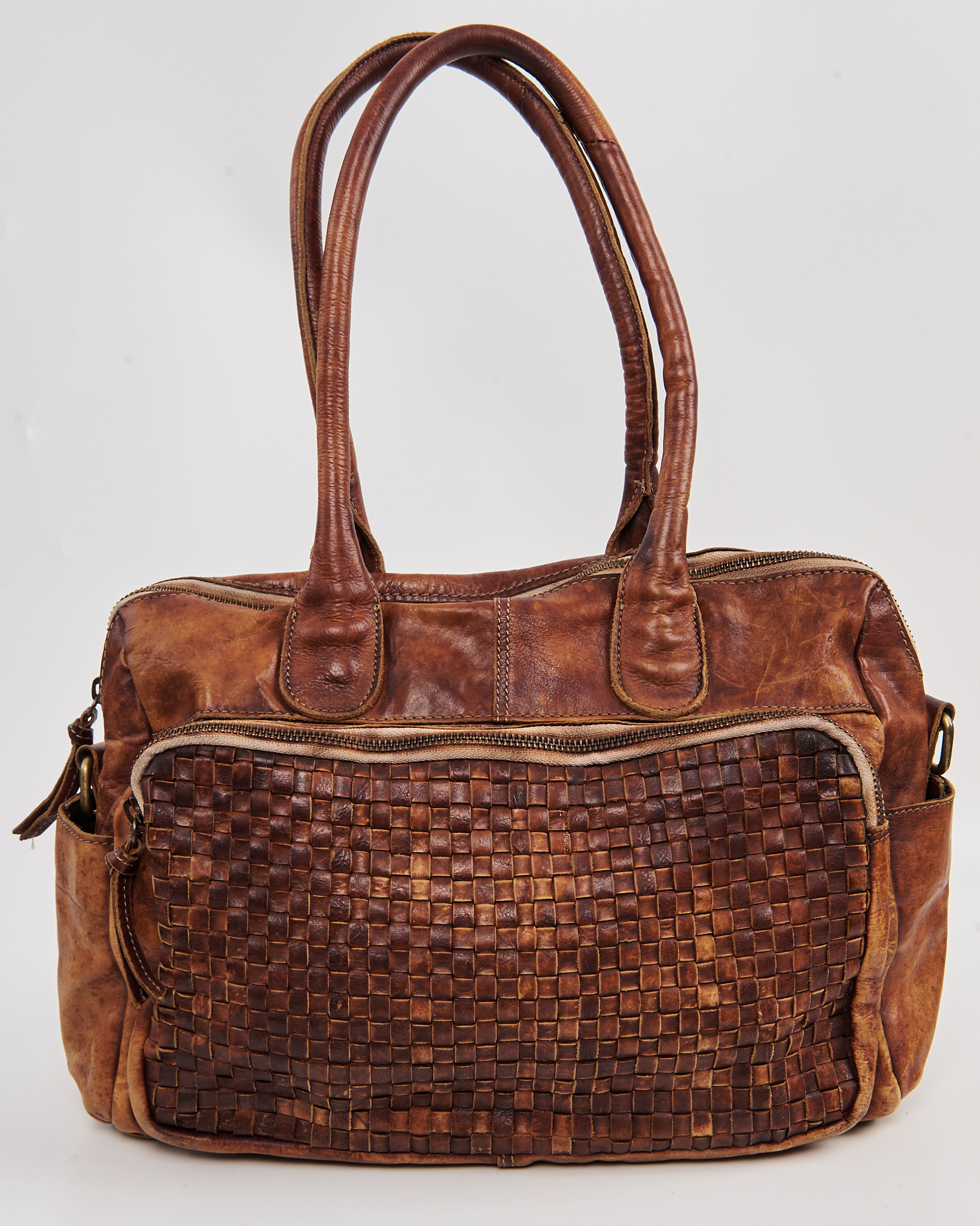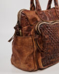 Сумка из натуральной кожи тёплого коньячного оттенка с плетёной вставкой на передней панели. Вместительное основное отделение и внешние карманы, удобные практичные ручки.