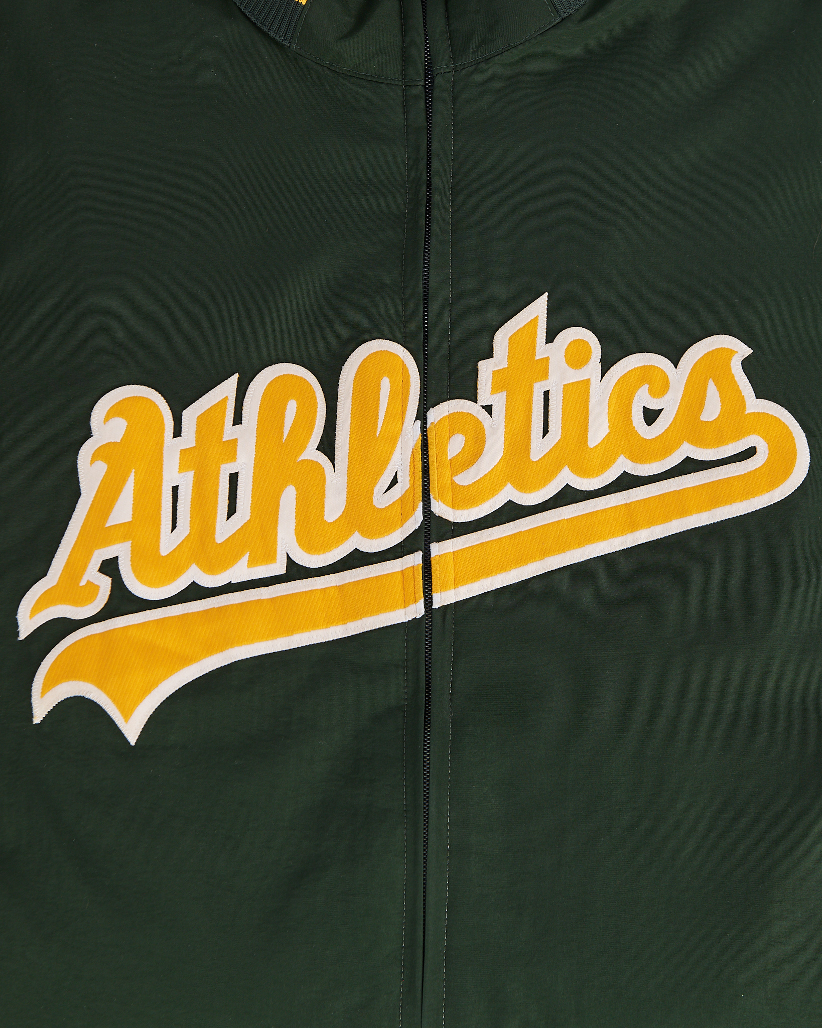 Куртка Majestic с символикой Oakland Athletics в насыщенном зелёном цвете. Посадка свободная, контрастная надпись Athletics на груди, жёлтые полосы на воротнике и рукавах, плотная резинка внизу и на манжетах.