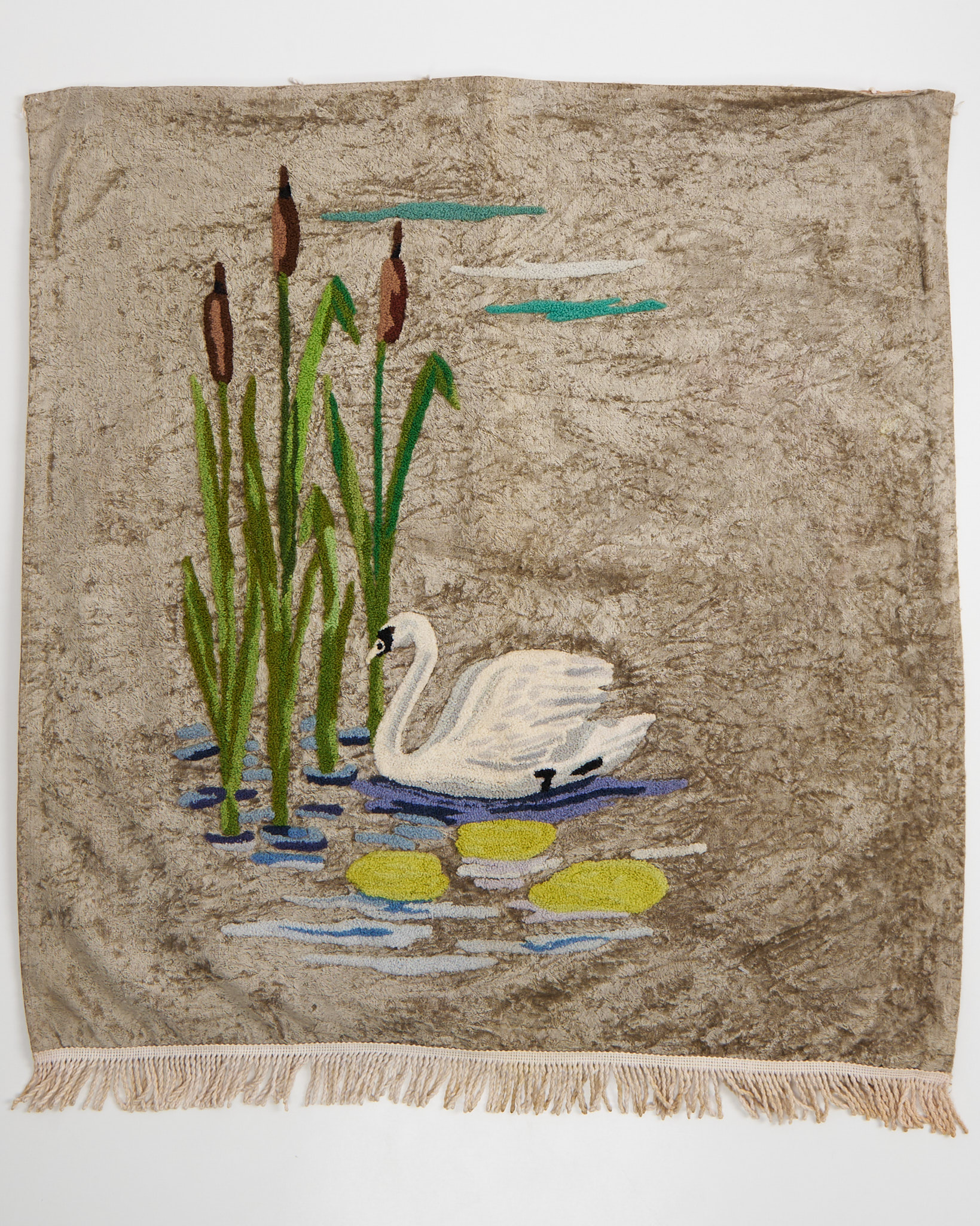 Винтажное плюшевое панно «Лебединое озеро». Густой ворс, сюжет с плывущим лебедем и камышами на бежевом бежевом фоне. Гладкая подкладка с крупным цветочным паттерном.
