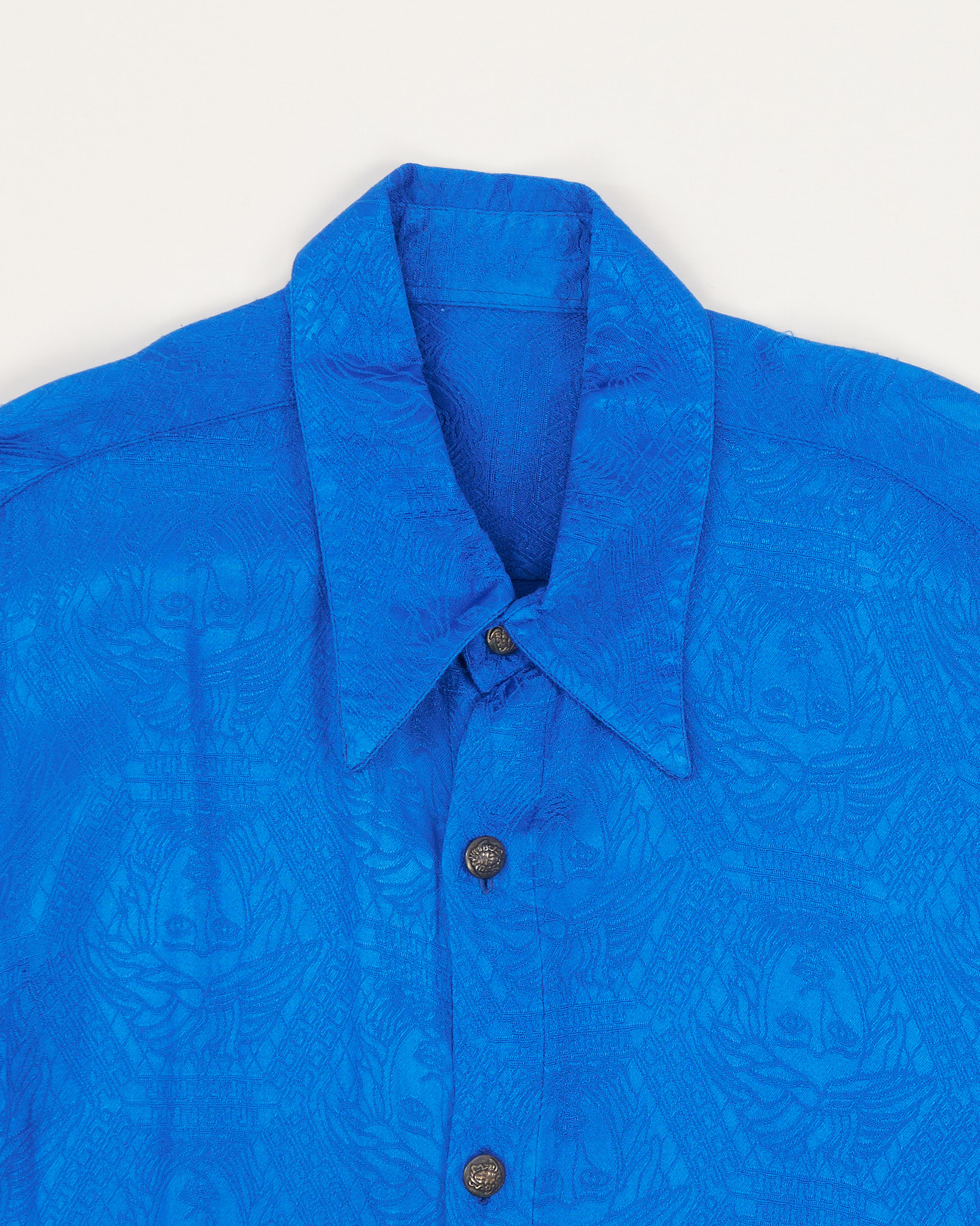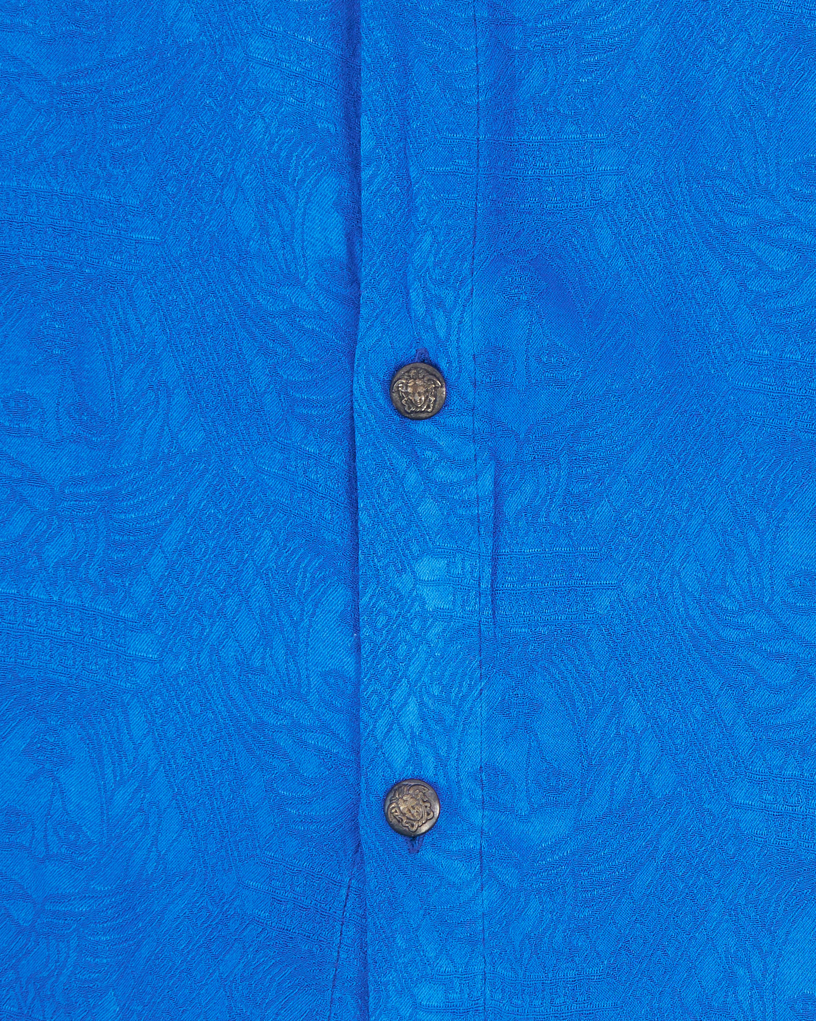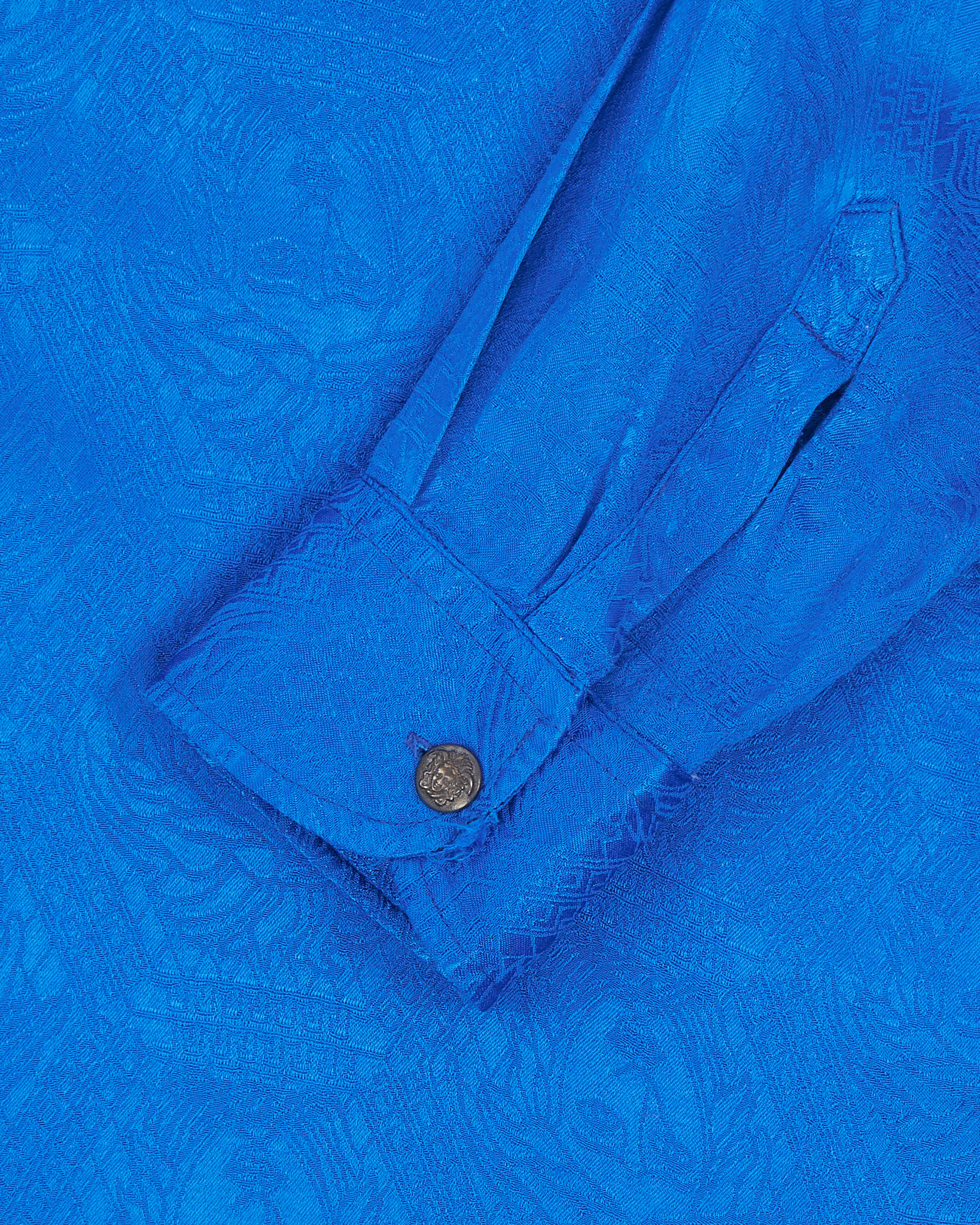 Винтажная рубашка Versace в цвете электрик. По всей поверхности фактурный узор, тяжелые металлические пуговицы с рельефом. Свободный крой, комфортная посадка.