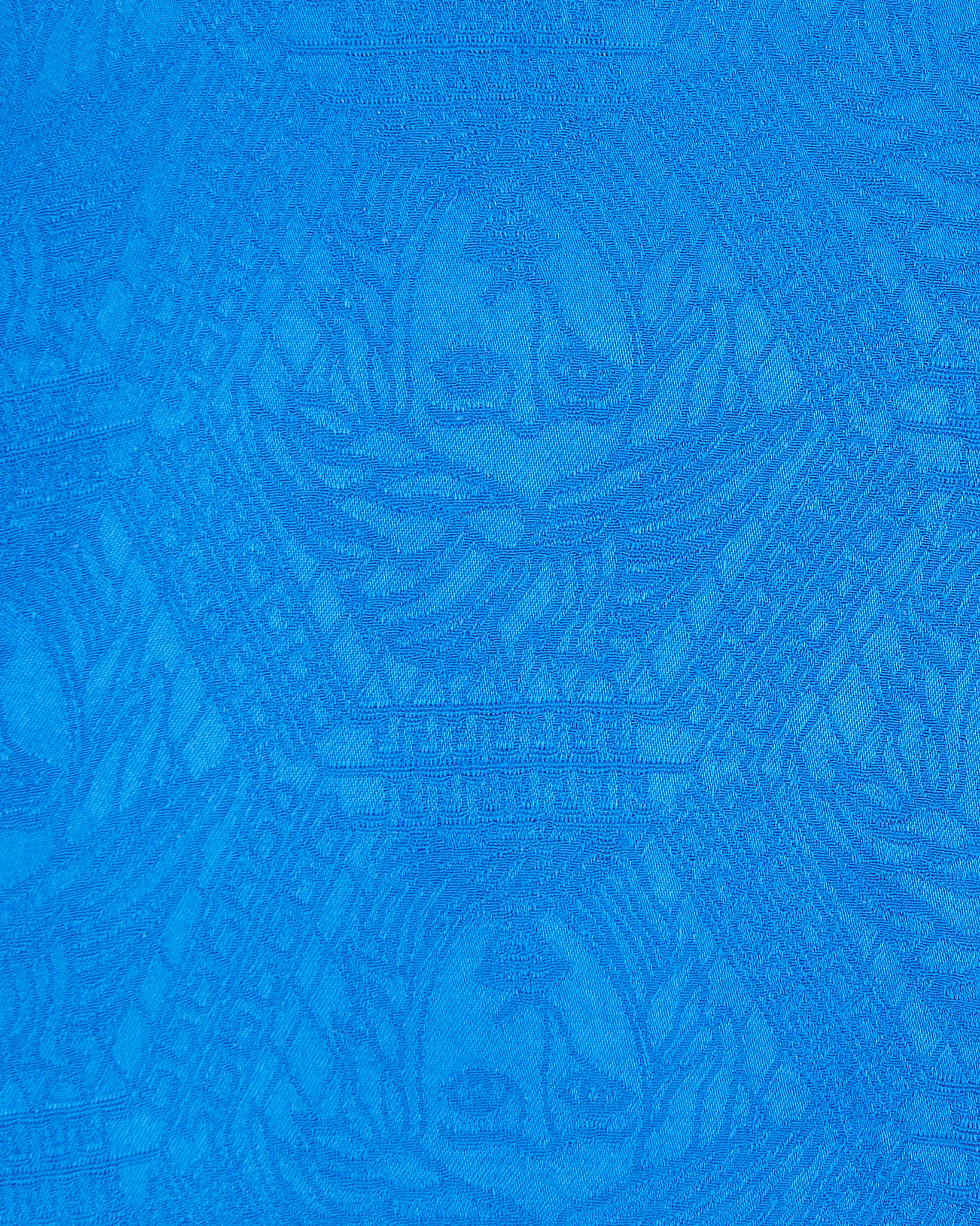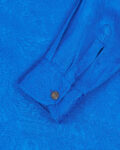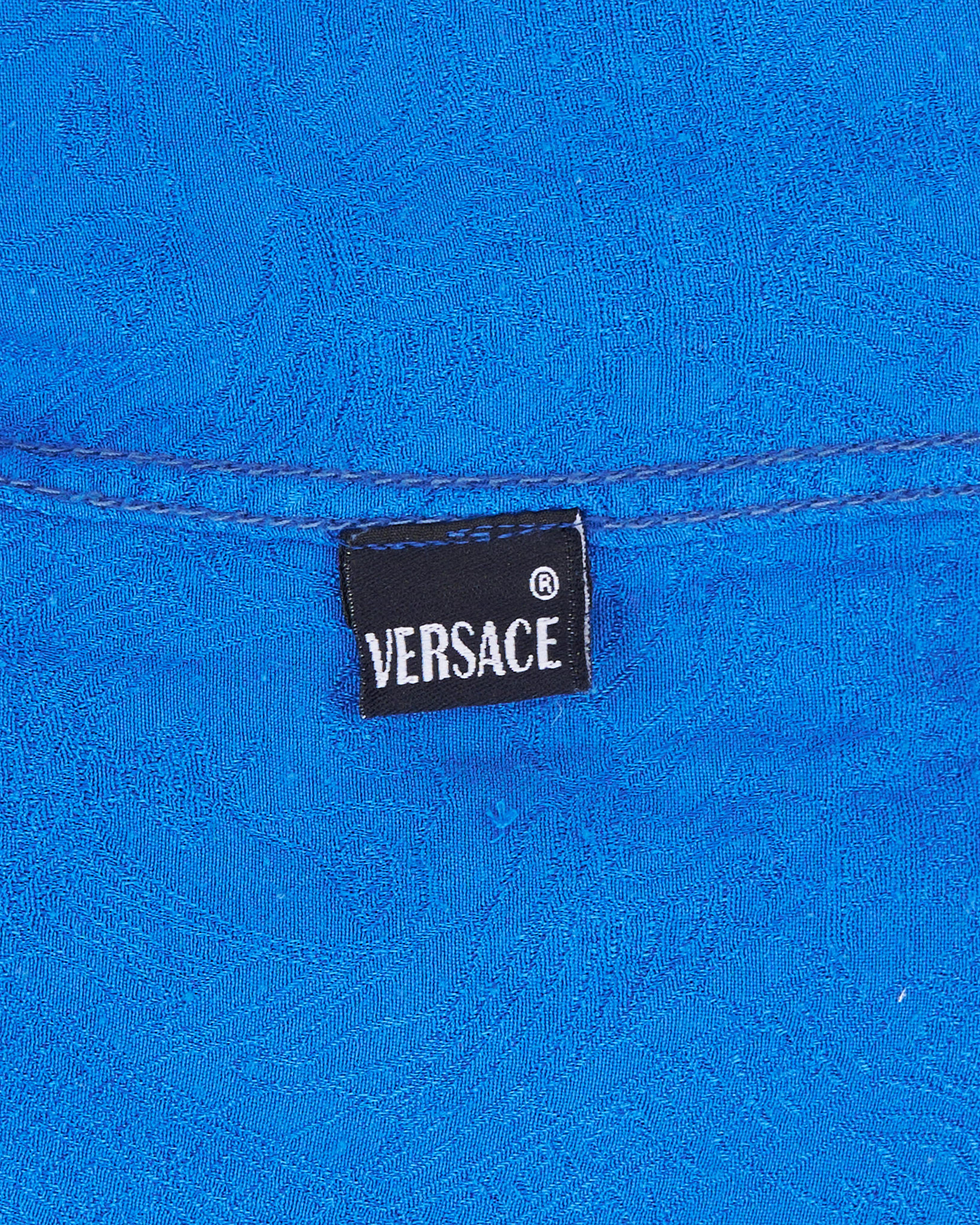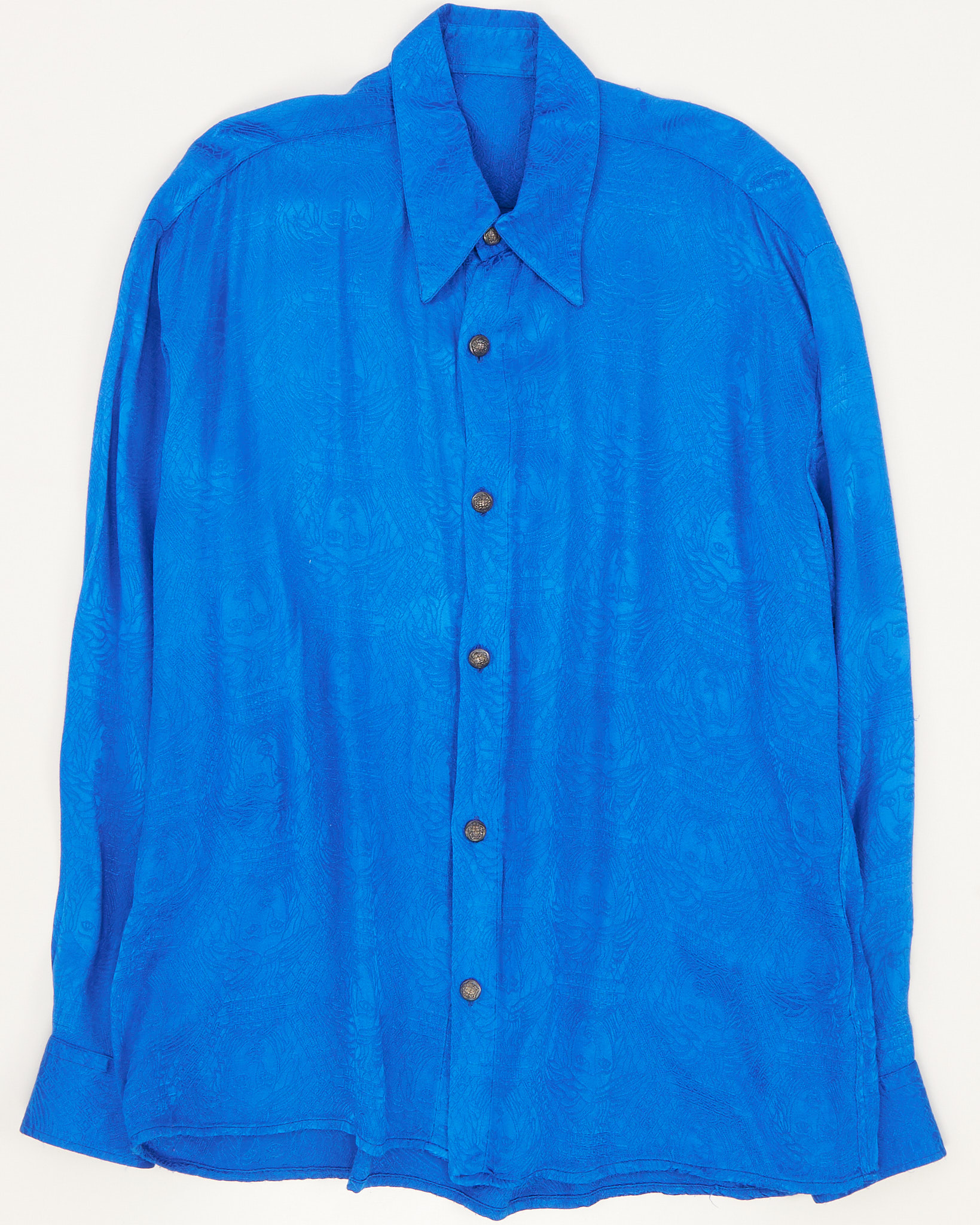 Винтажная рубашка Versace в цвете электрик. По всей поверхности фактурный узор, тяжелые металлические пуговицы с рельефом. Свободный крой, комфортная посадка.