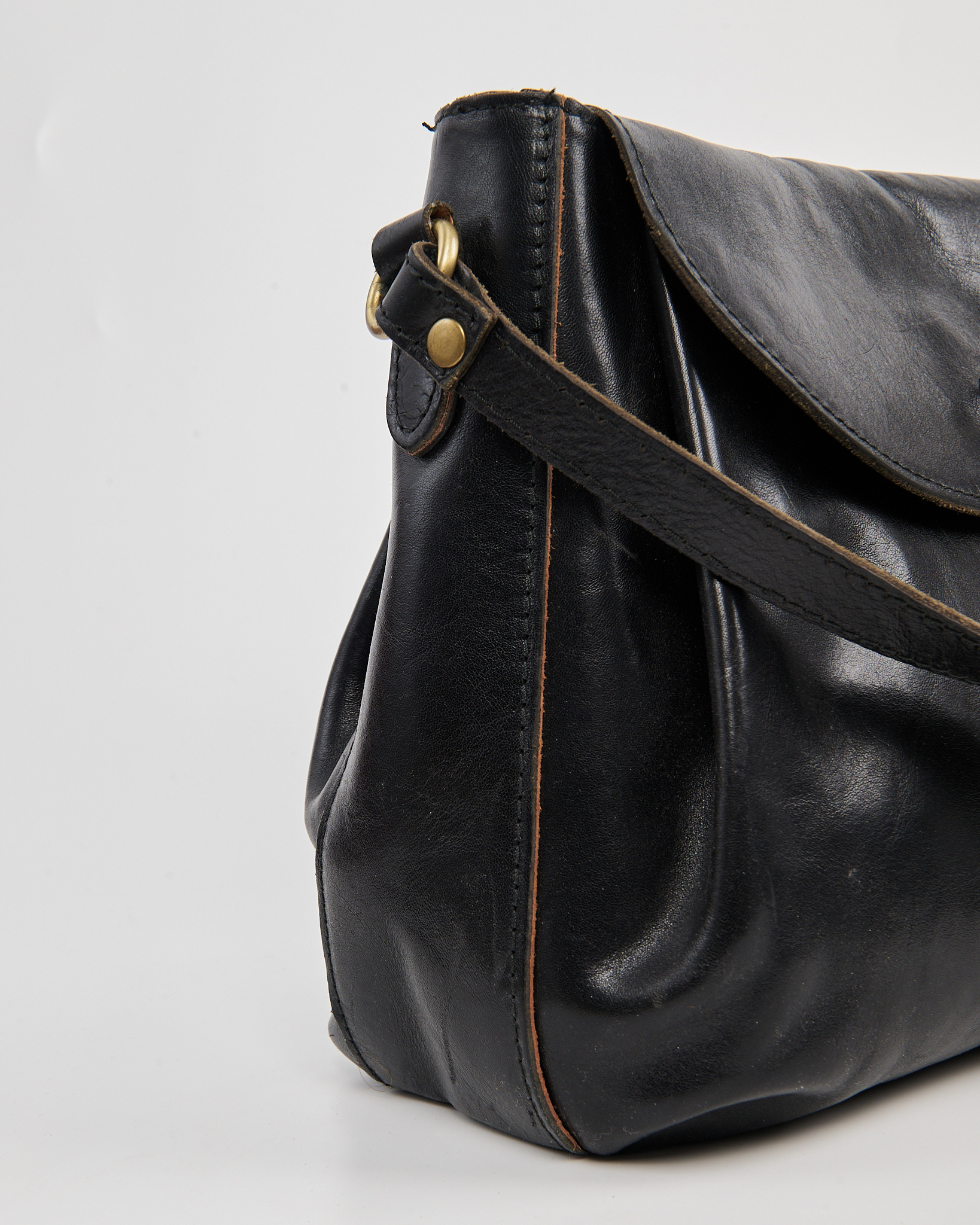 Сумка Anokhi Paris из натуральной кожи. Откидной клапан на металлической кнопке и регулируемый ремень, золотистая фурнитура с патиной.