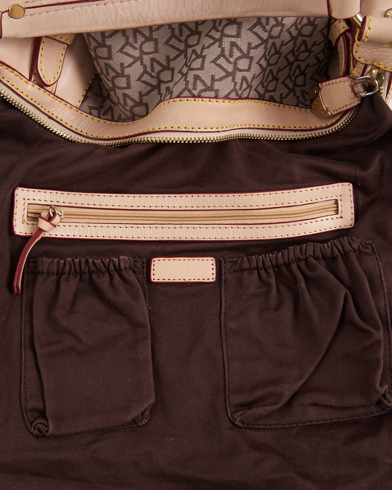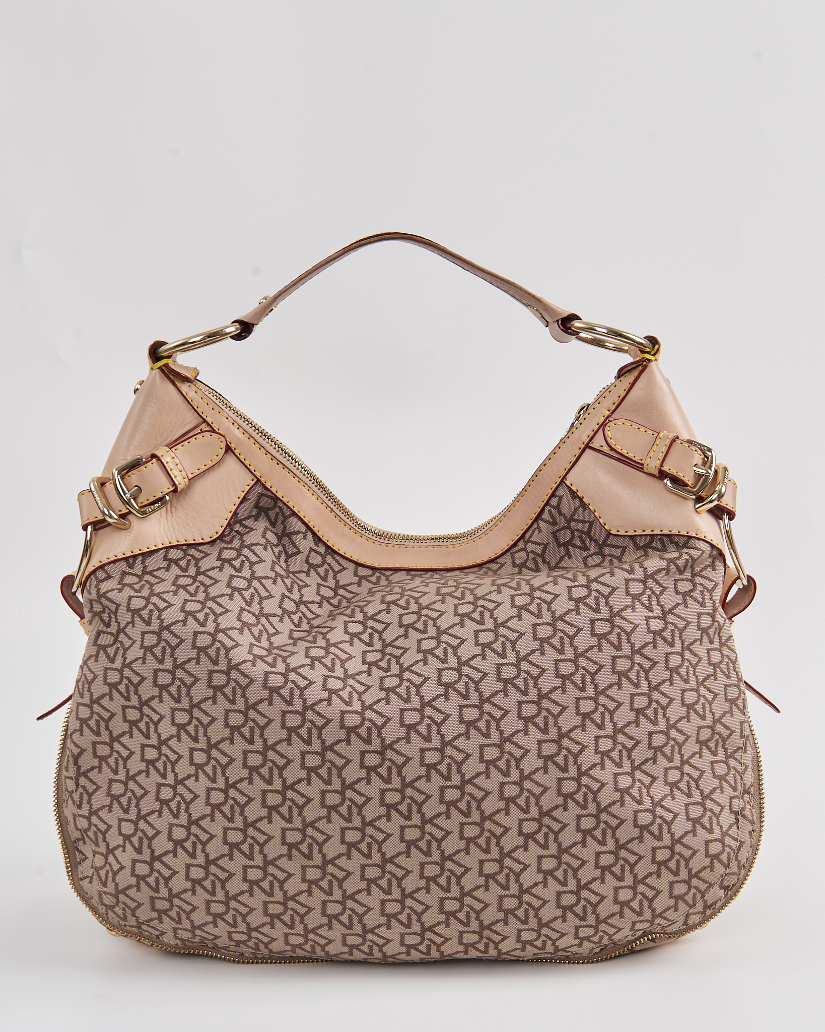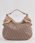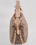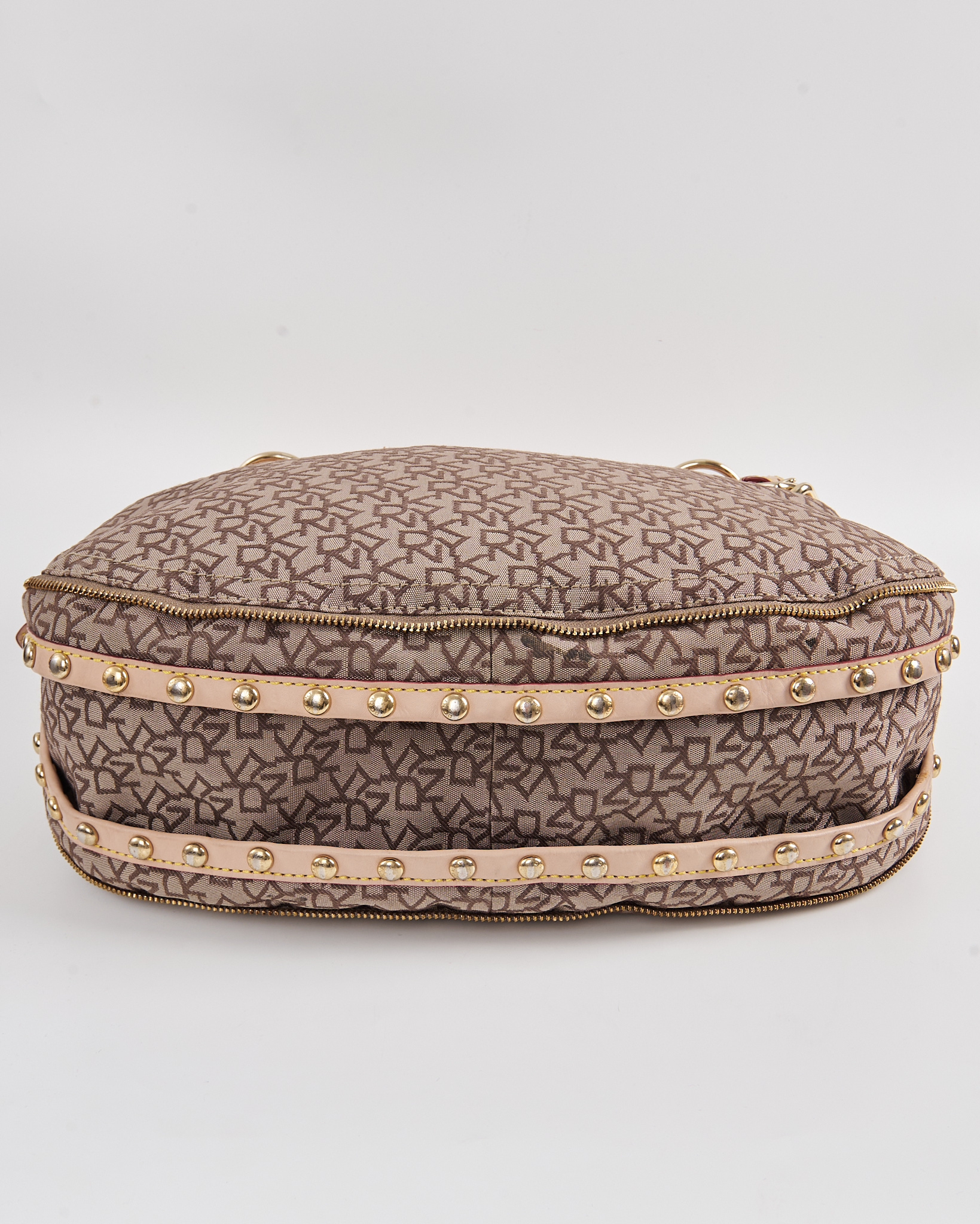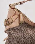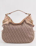 Сумка из плотного текстиля с фирменным принтом и дополнена мягкими кожаными вставками светло-бежевого оттенка. Изогнутая ручка, металлическая фурнитура золотистого цвета и декоративные заклёпки по нижнему краю придают вещи выразительный характер. Внутри предусмотрены отделения и карманы для аккуратной организации содержимого.