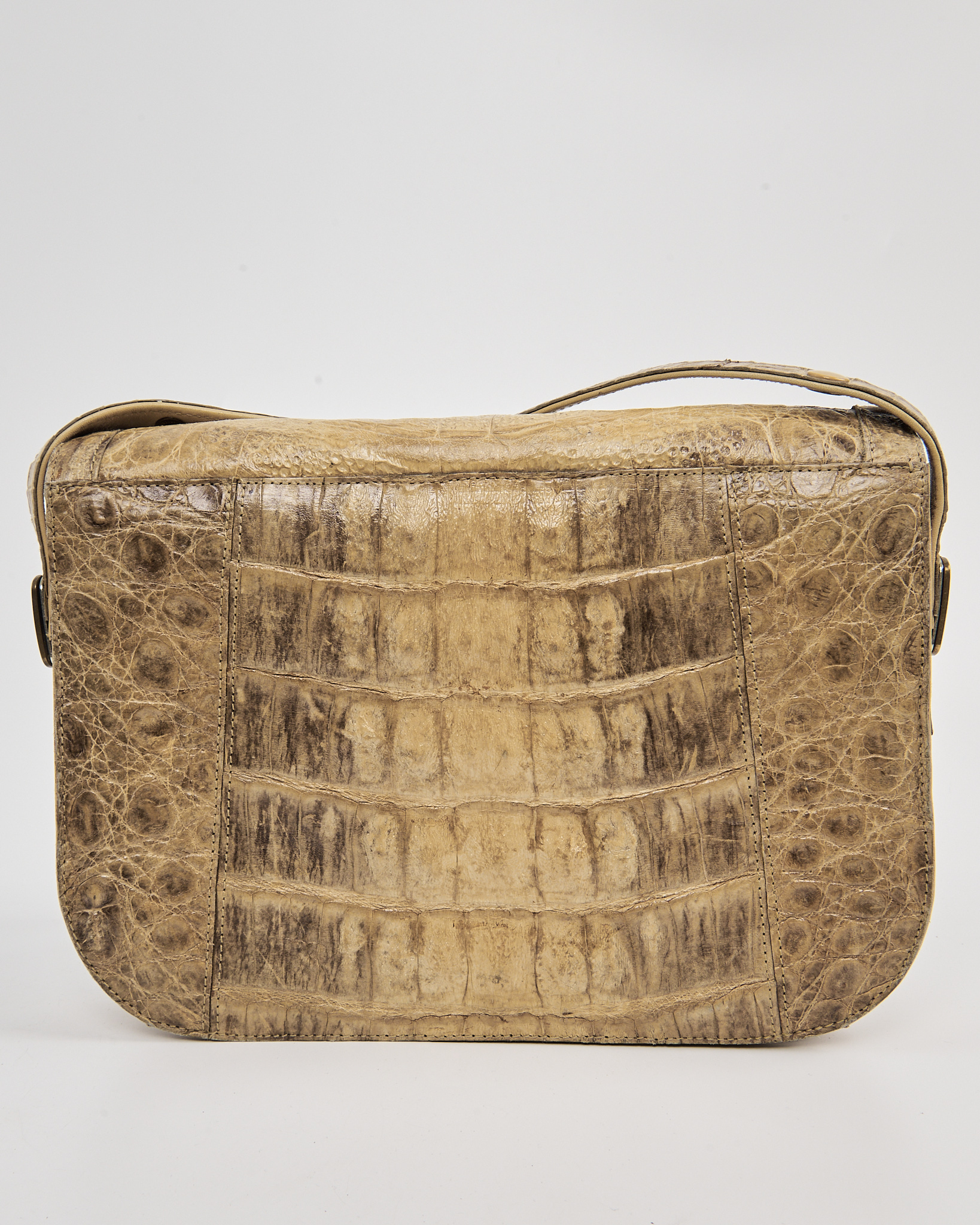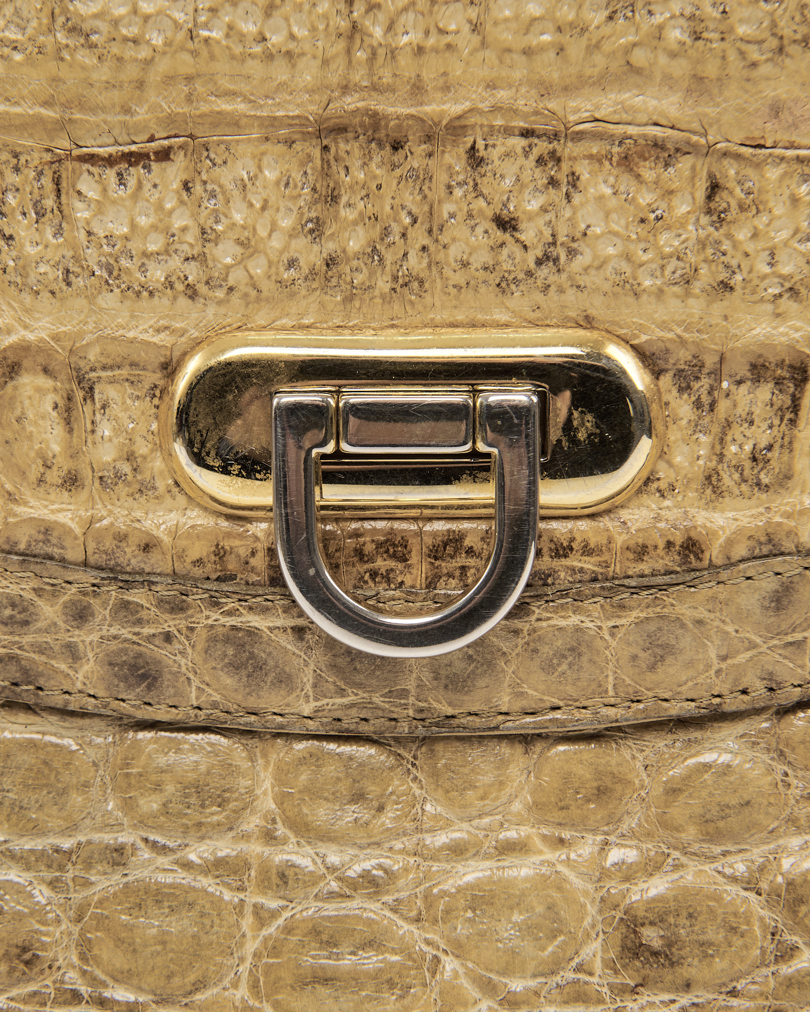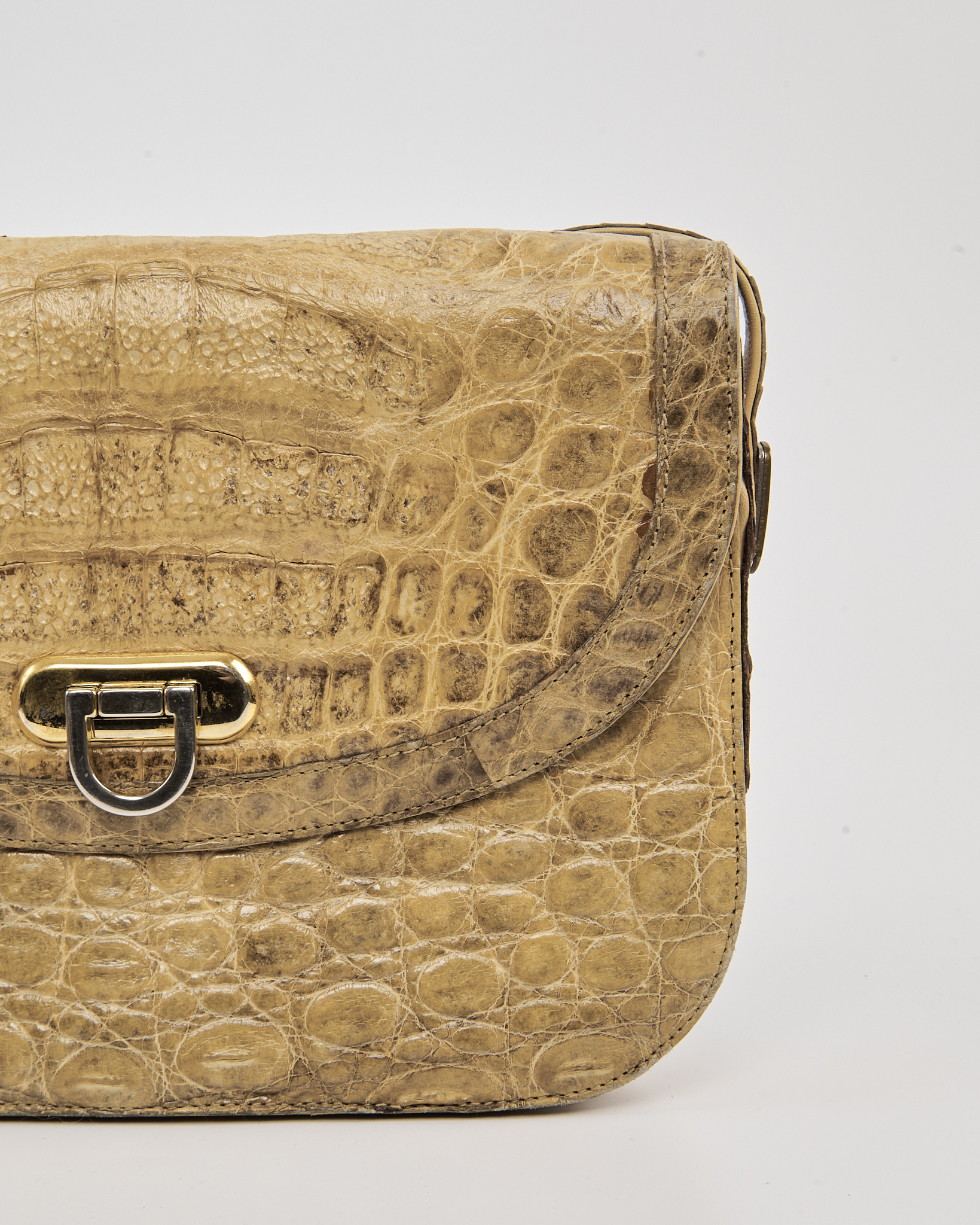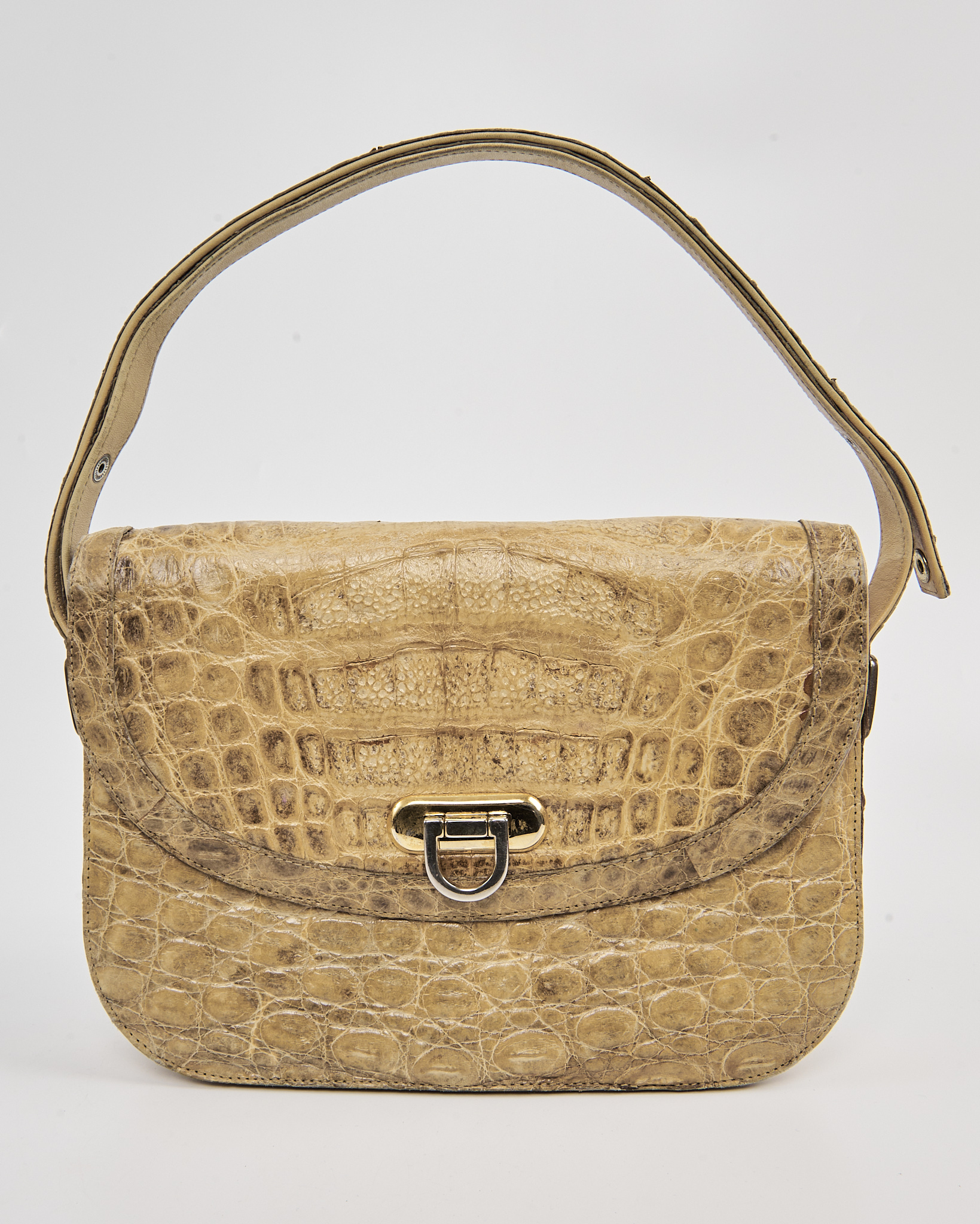 Эффектная сумка из плотной кожи рептилии в теплом бежевом оттенке. Клапан с металлической застежкой и регулируемый ремень