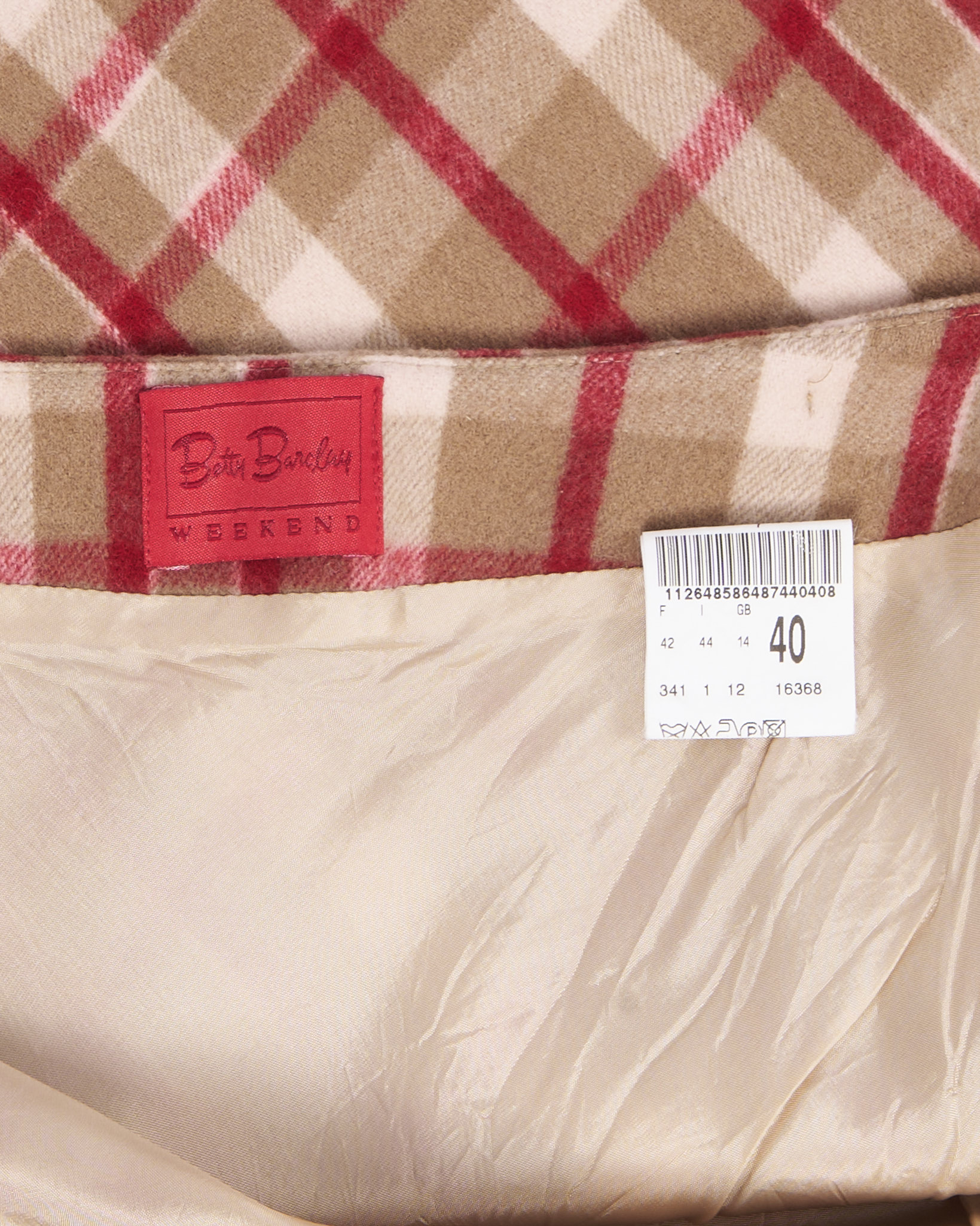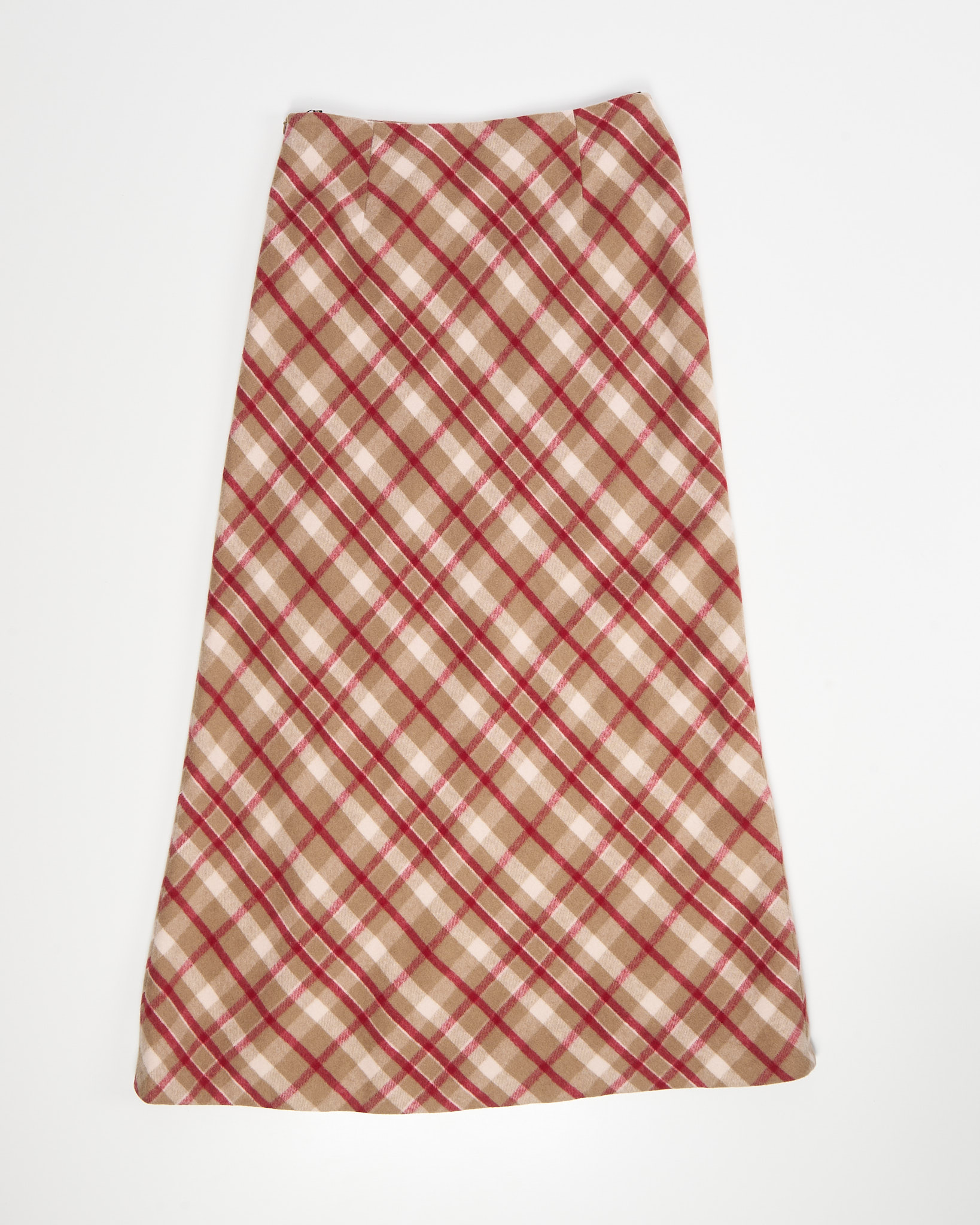 Юбка из шерсти в стиле преппи. Материал плотный с гладким подкладом. Теплая гамма из бежевых и красных оттенков создает выразительный геометрический рисунок.