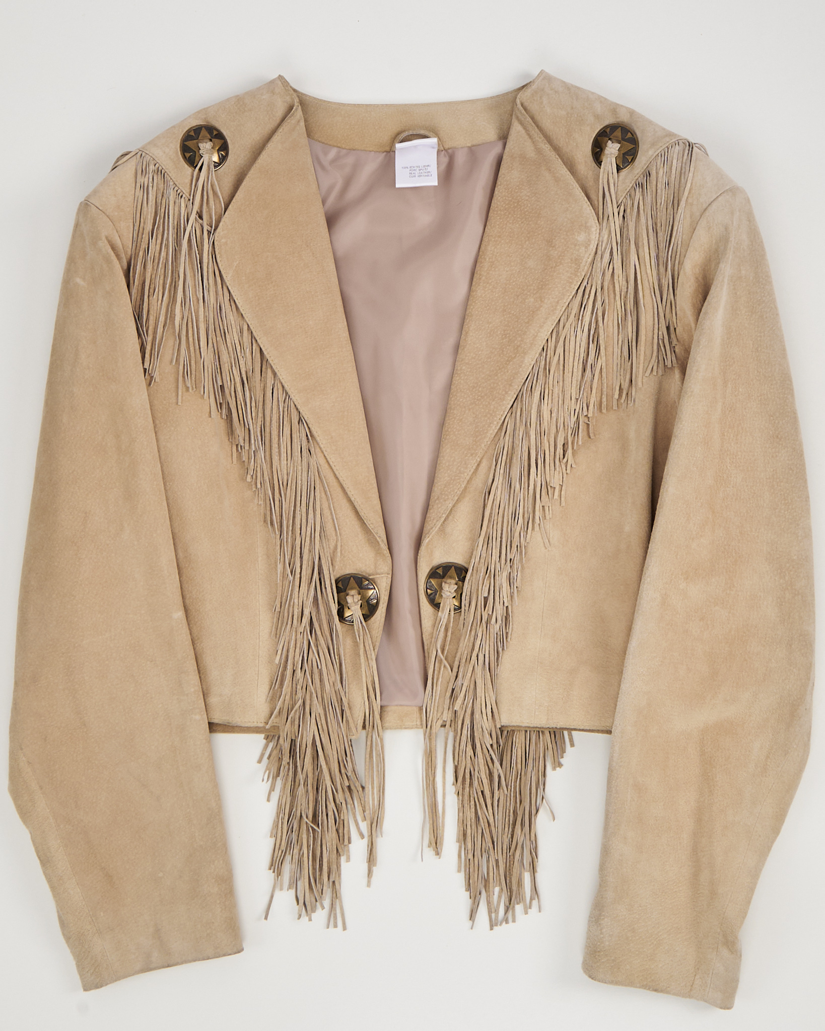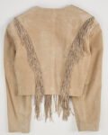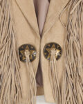 Замшевая куртка с бахромой в стиле вестерн. Куртка из мягкой натуральной замши тёплого песочного оттенка. Посадка укороченная, линия плеч чёткая, силуэт не утяжеляет образ. Длинная бахрома и декоративные металлические элементы со звёздами.