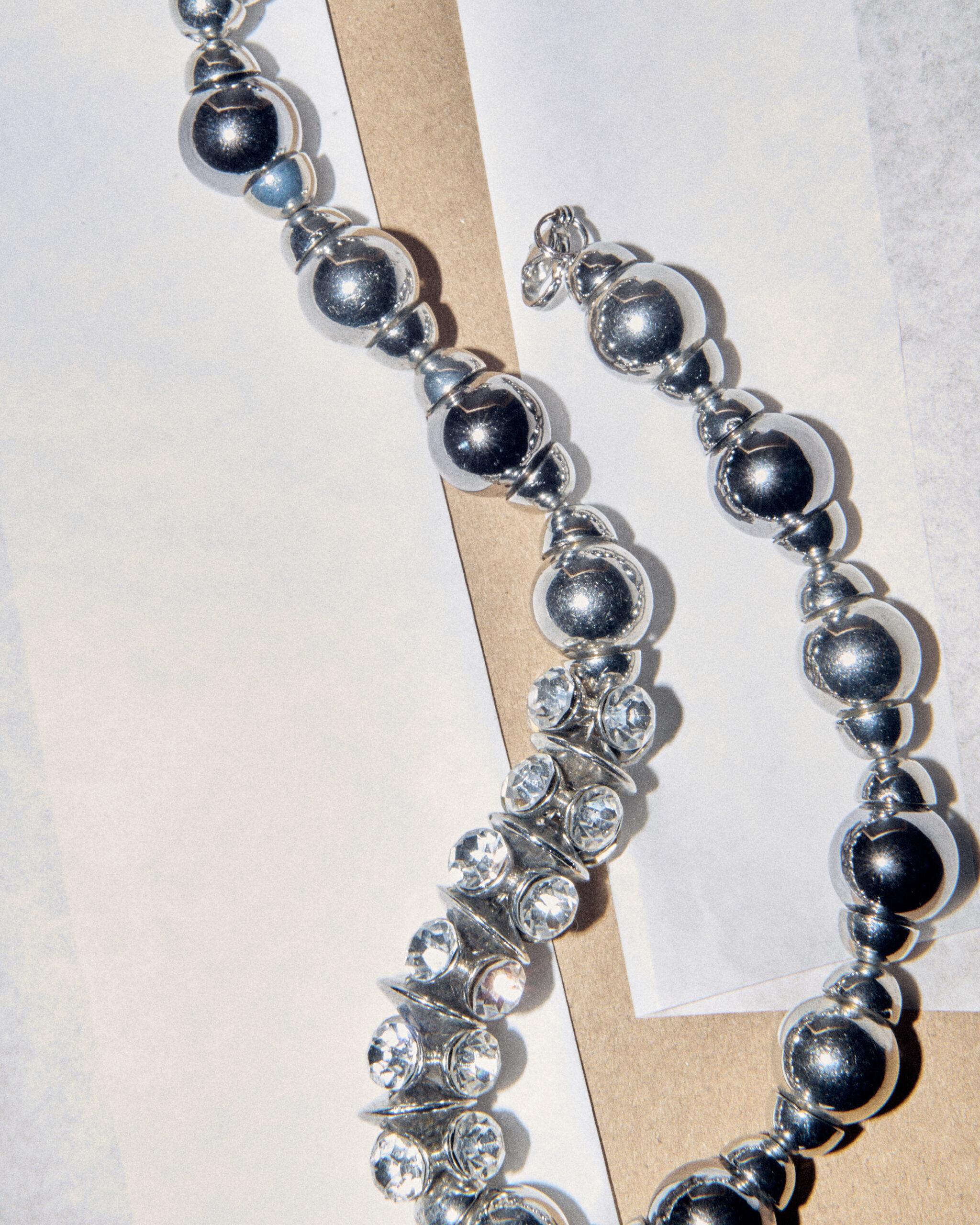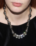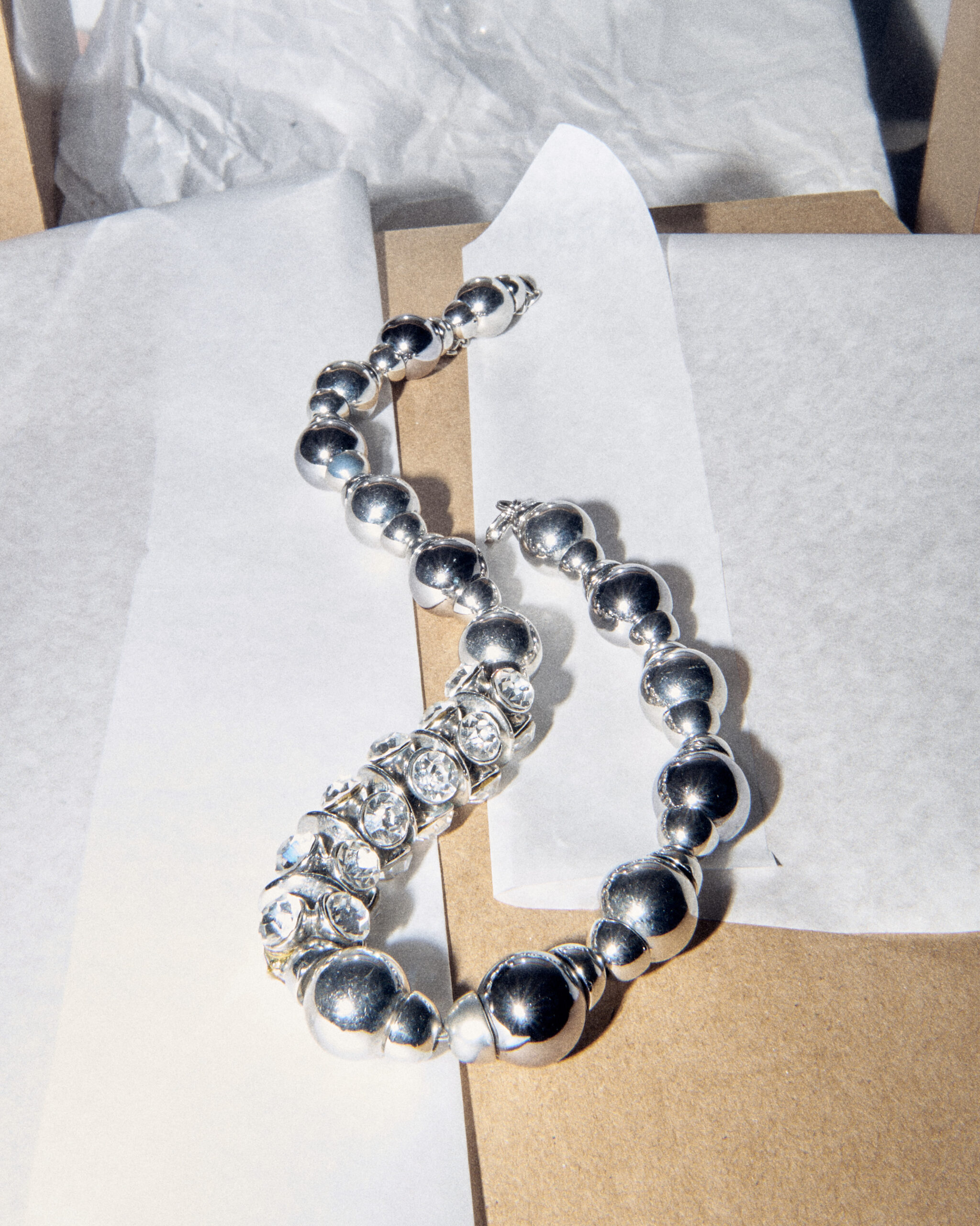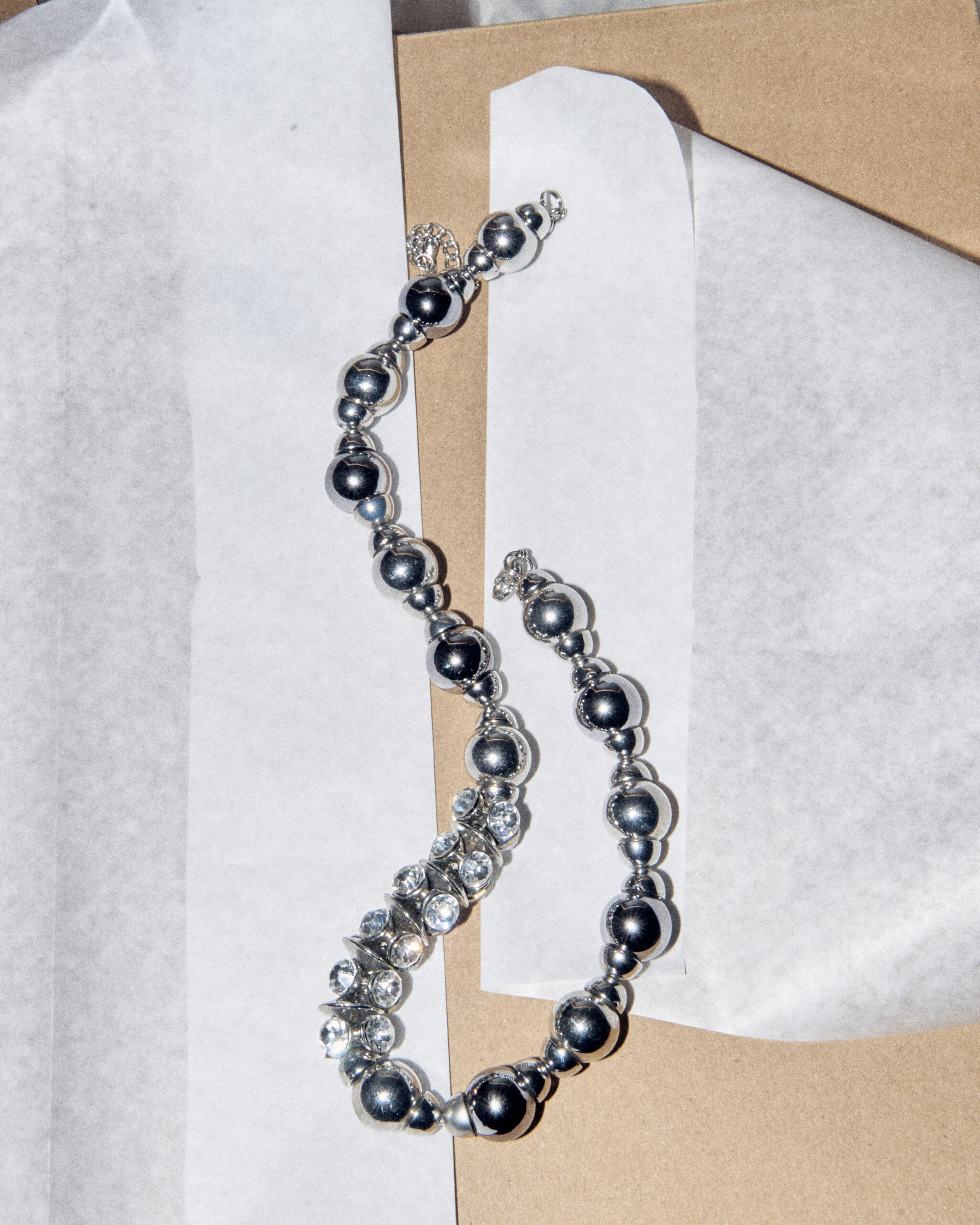 Крупные зеркальные бусы в сочетании с дорожками из прозрачных кристаллов. Удобная функциональная застежка.