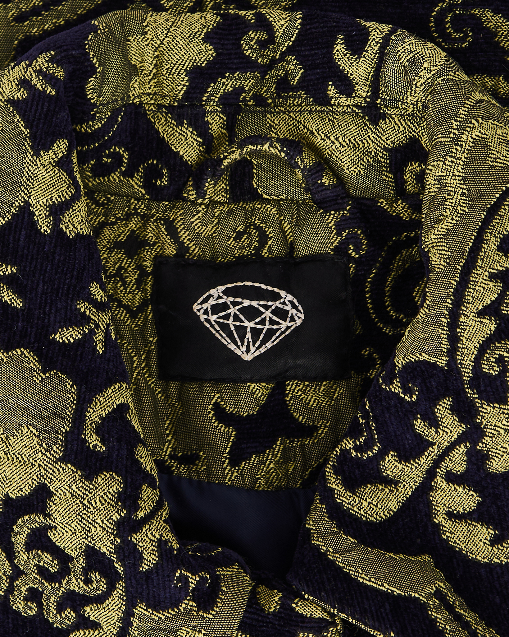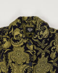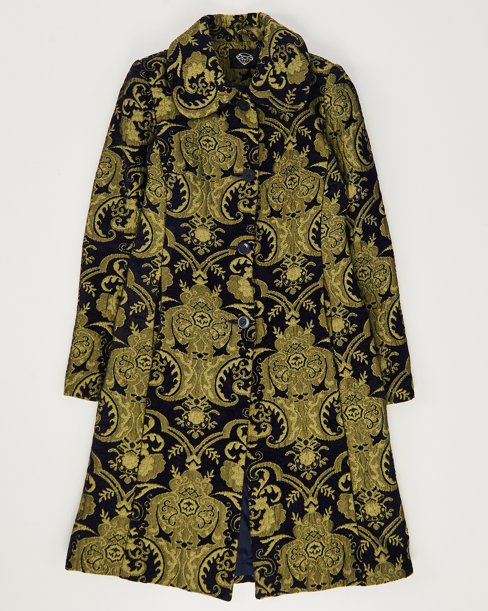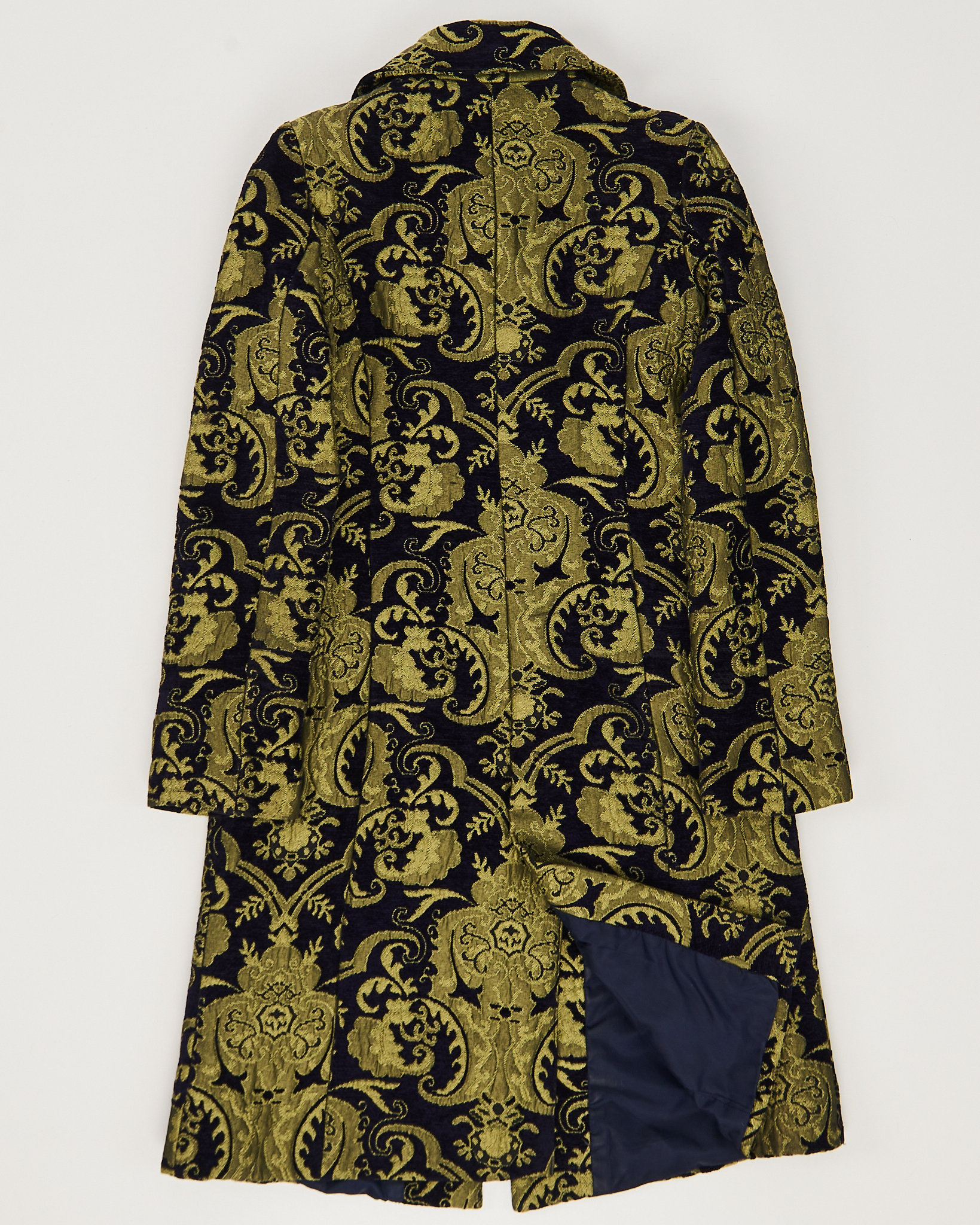 Пальто из плотной жаккардовой ткани с орнаментом. Материал фактурный и приятный на ощупь. Приталенная посадка, отложной воротник. Функциональные карманы, шлица на спинке.