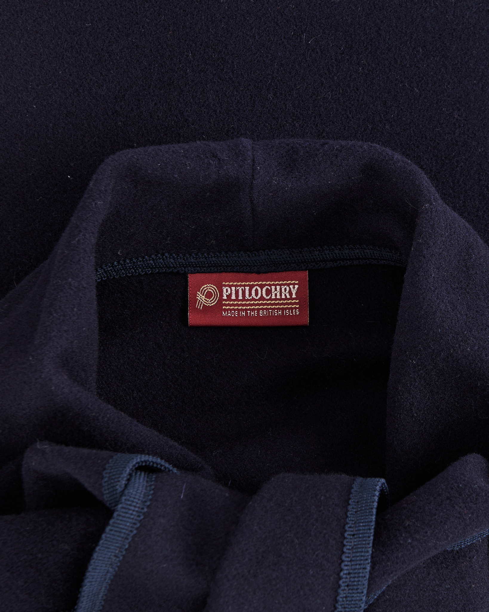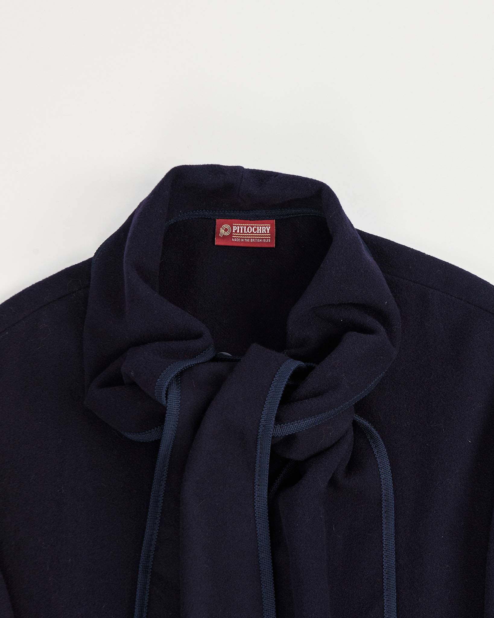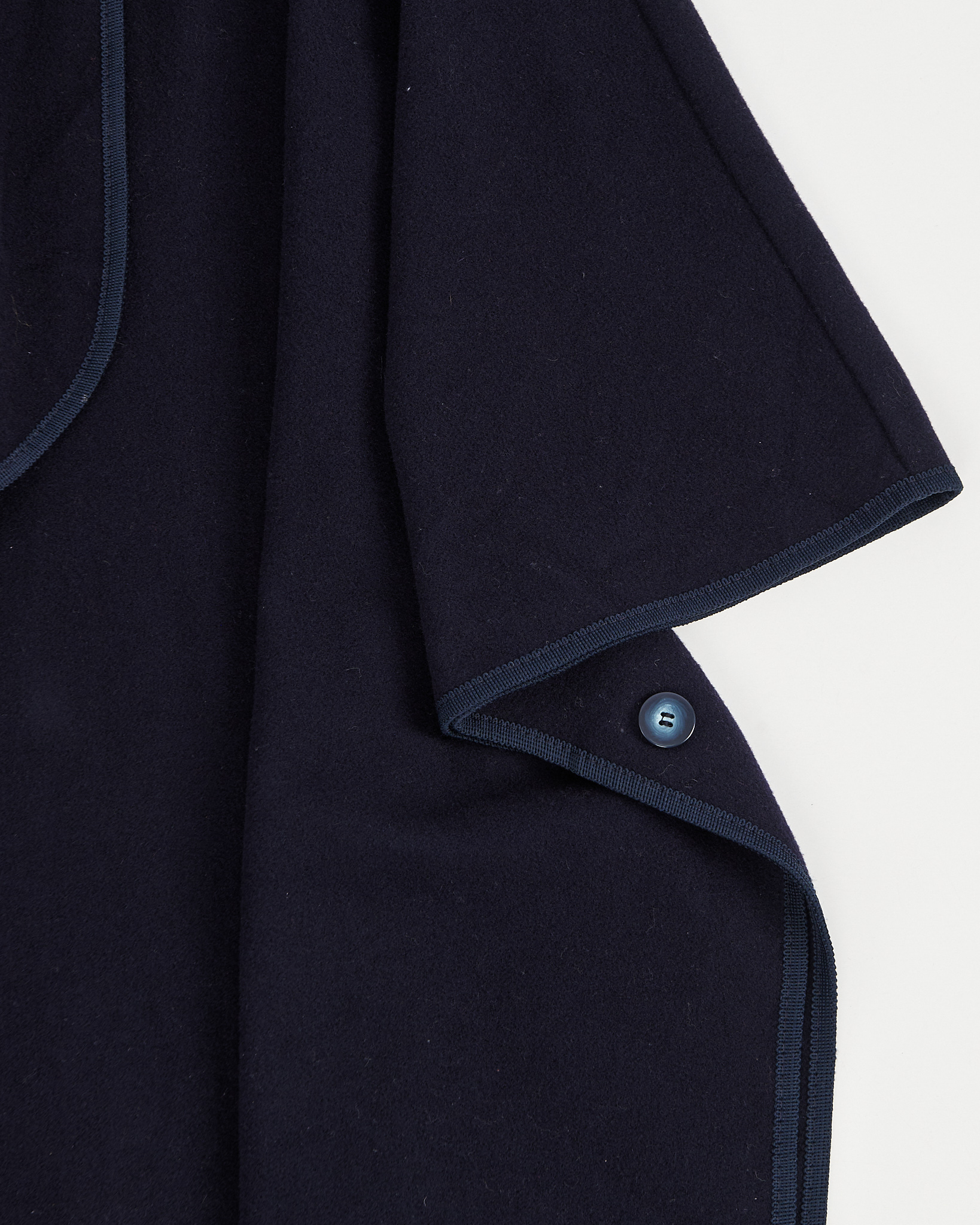Пончо Pitlochry с шарфом-воротником. Глубокий тёмно-синий оттенок и мягкая, тактильно приятная ткань. Свободная посадка, практичный шарф-воротник. Аккуратная отделка краёв тесьмой и удобная застёжка на пуговицы.