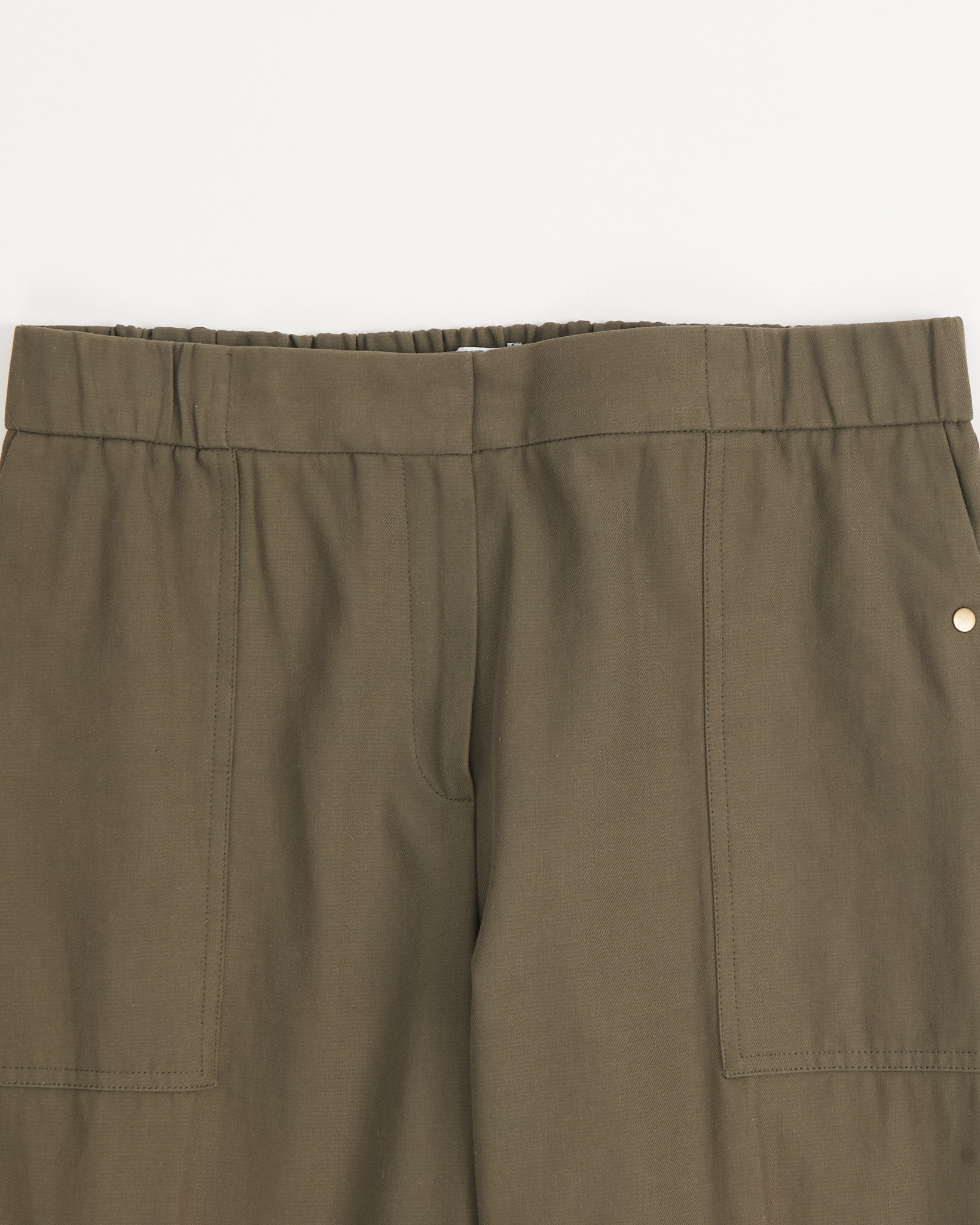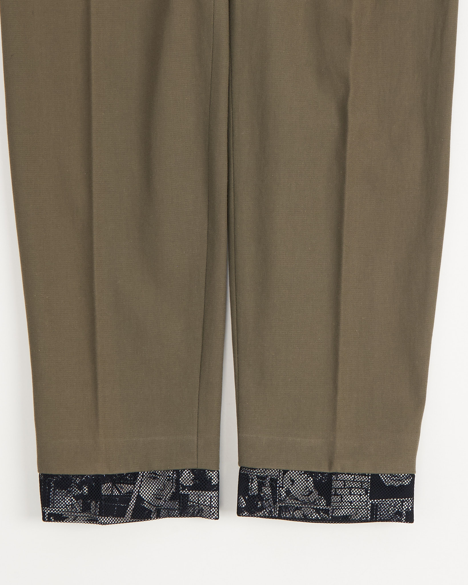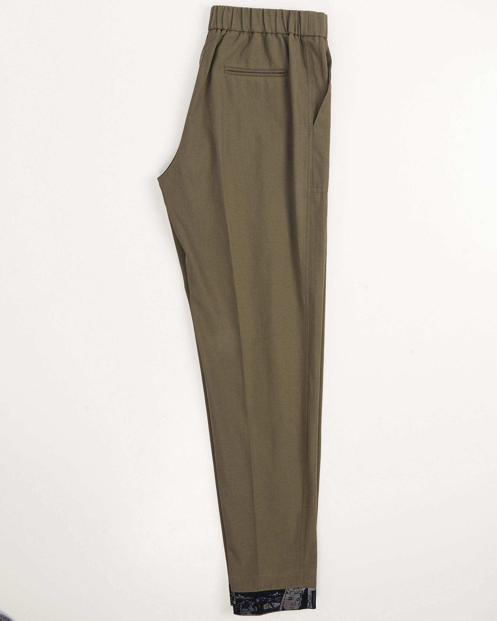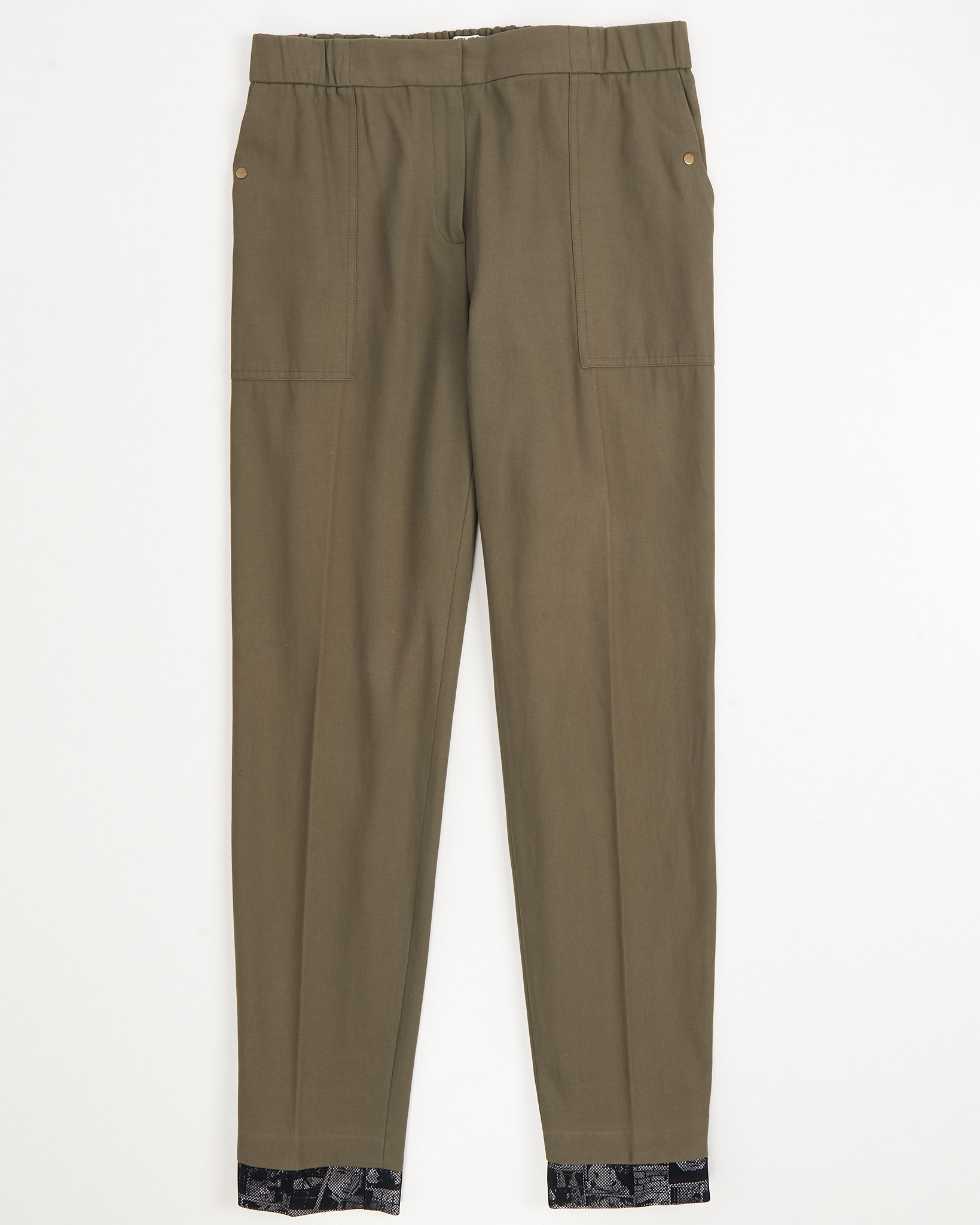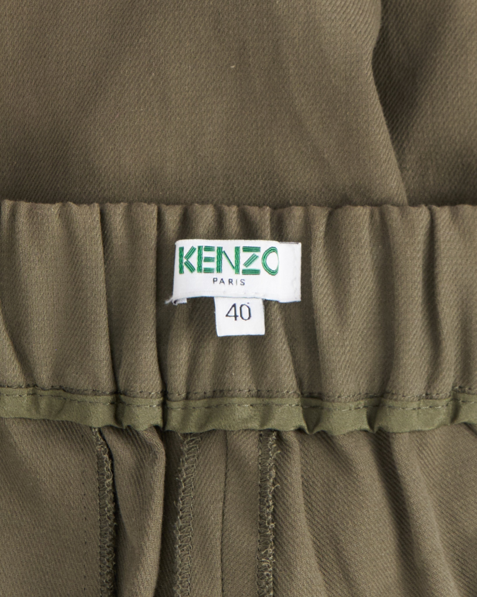 Брюки Kenzo с графичными манжетами. Брюки цвета хаки с эластичным поясом. Контрастные подвороты с черно-белым принтом, крупные накладные карманы.