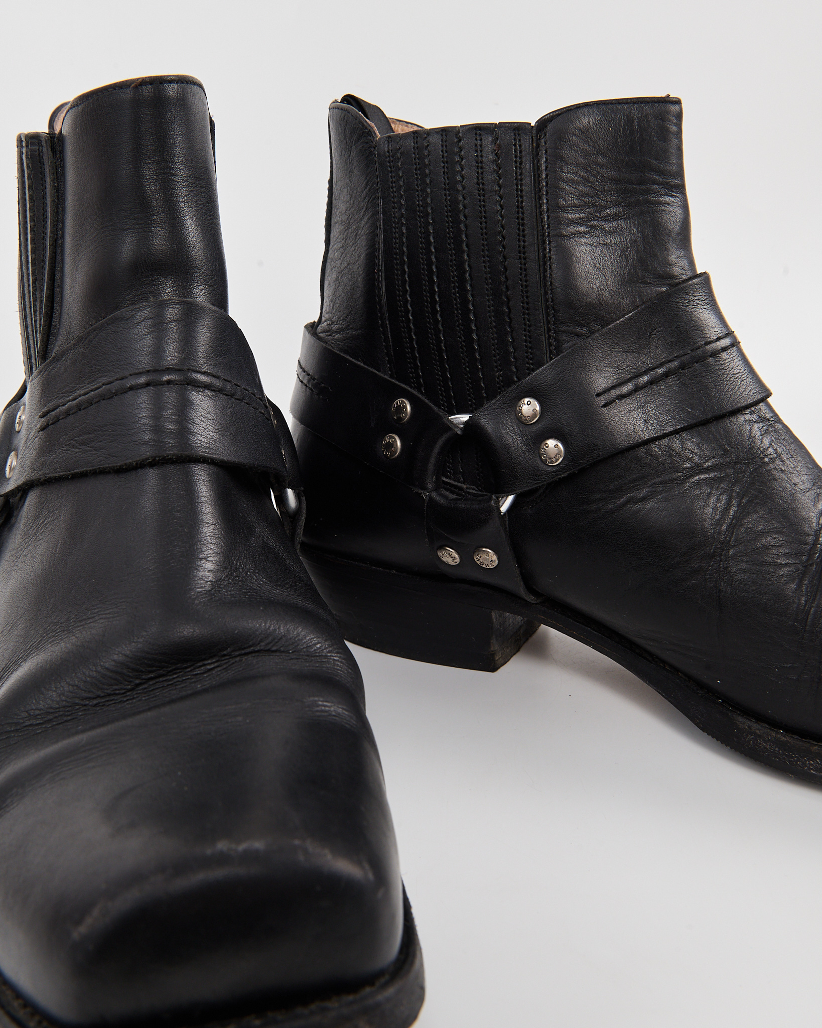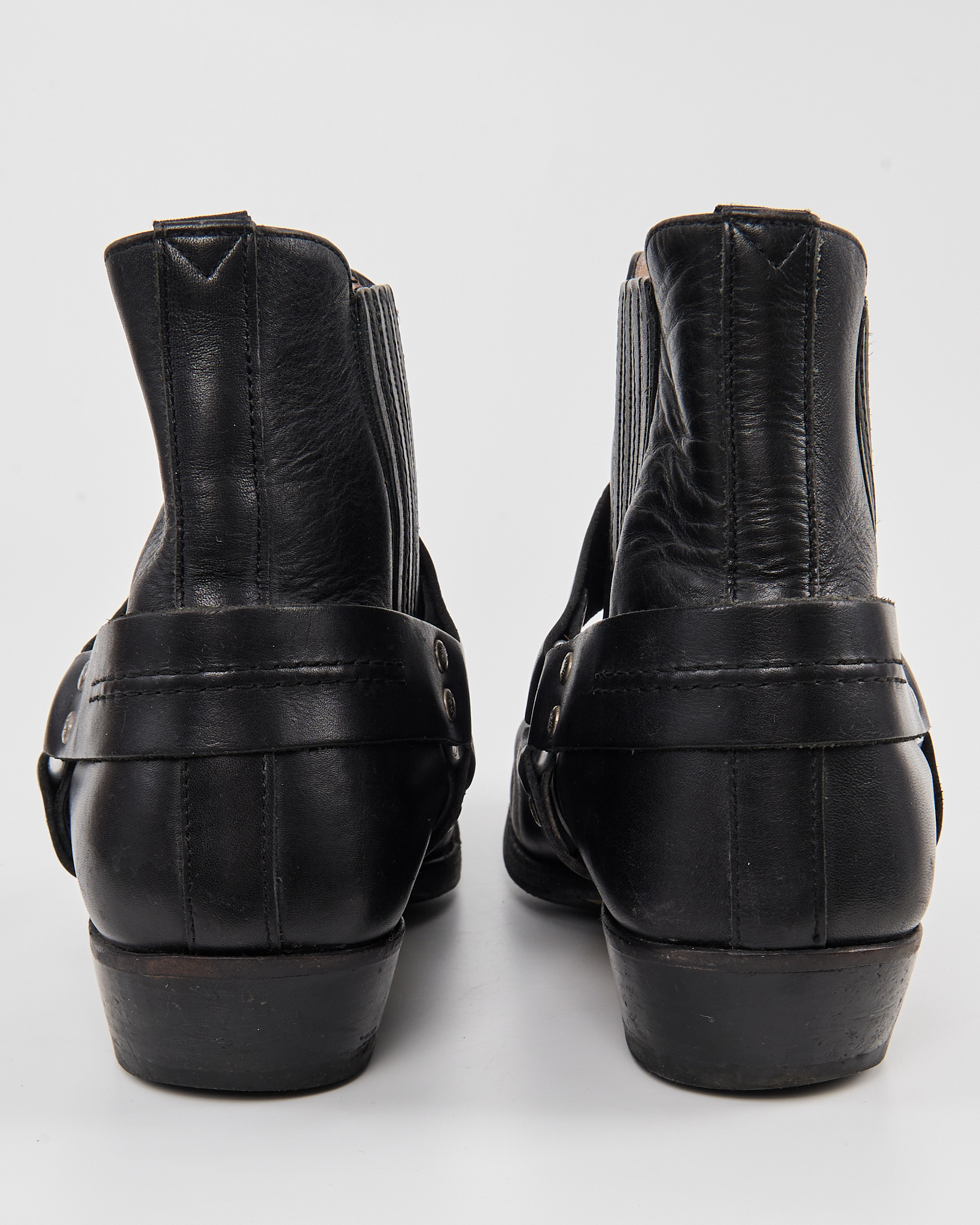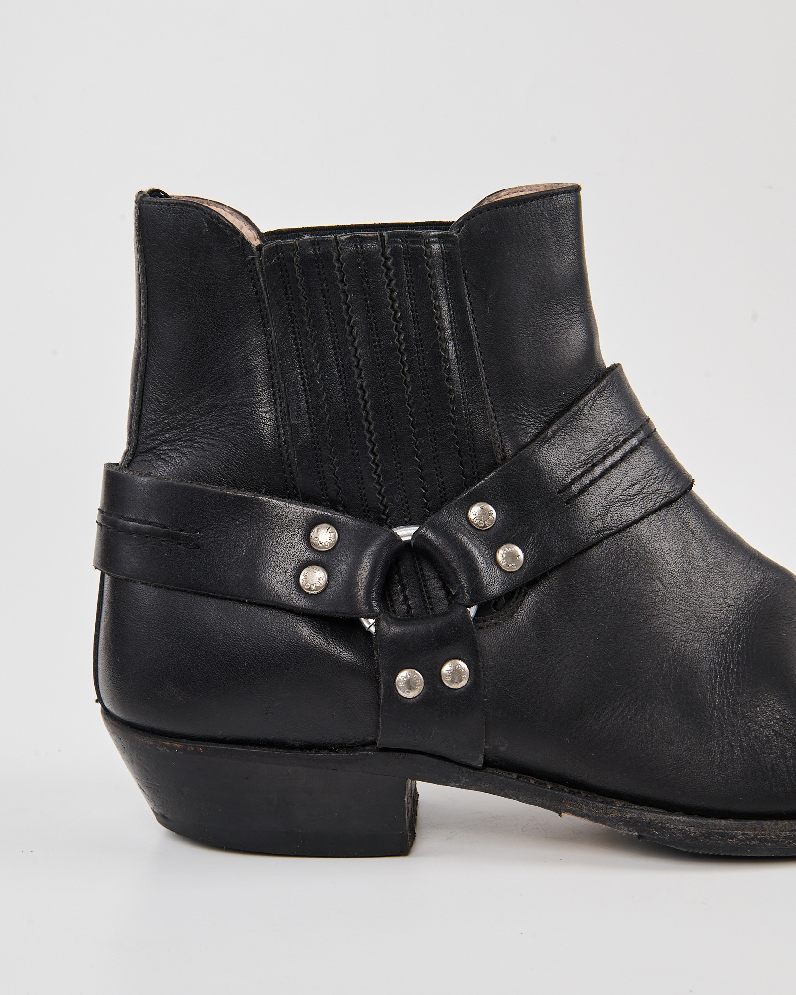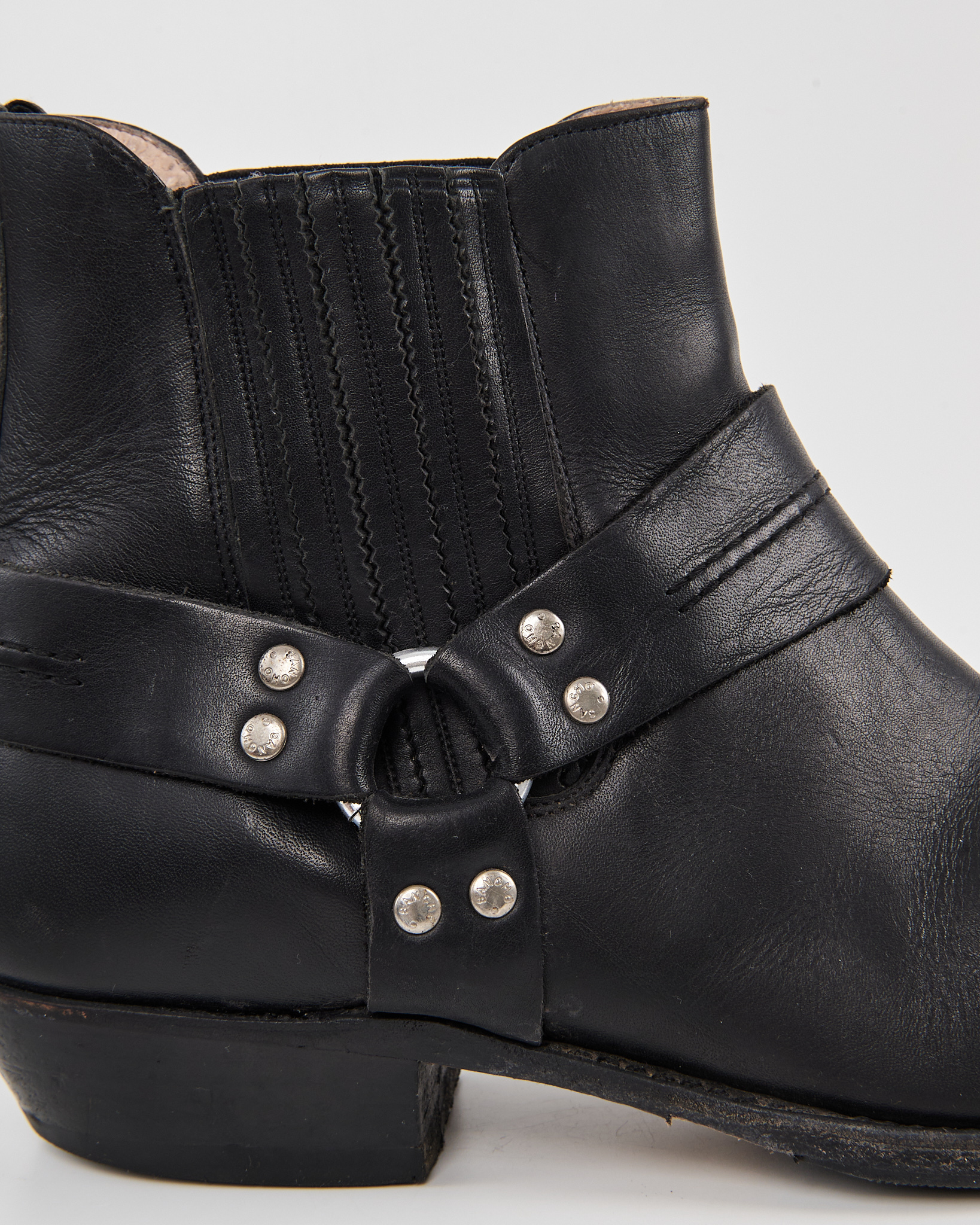 Кожаные казаки Sancho с характерной патиной. Посадка уверенная за счёт устойчивого каблука и эластичных вставок по бокам. Декоративная портупея с металлическими заклёпками.