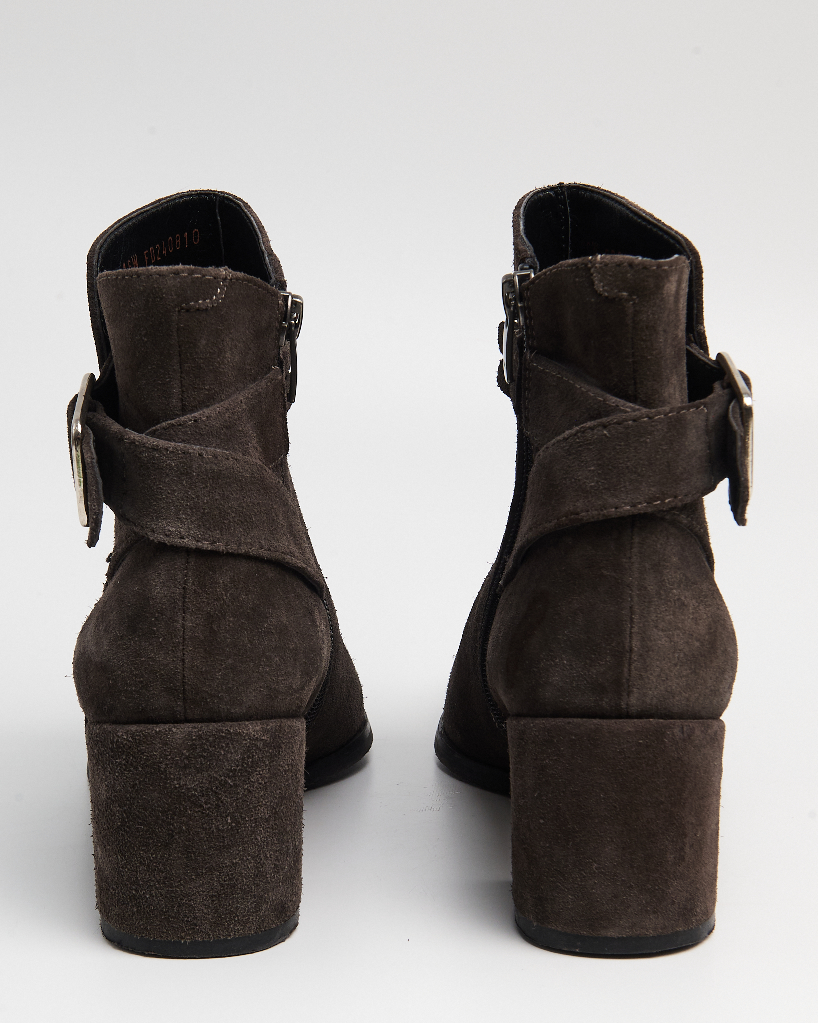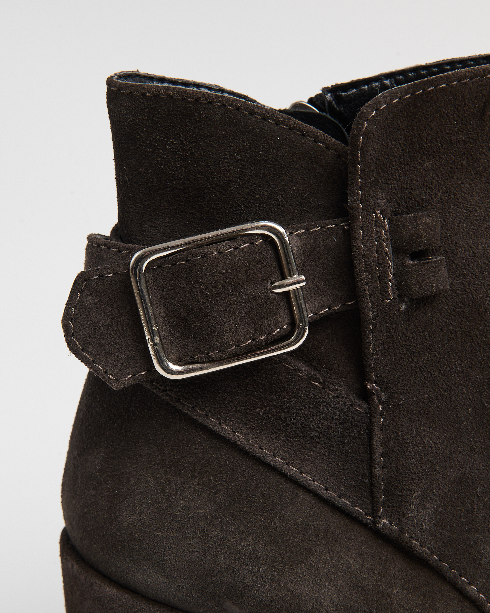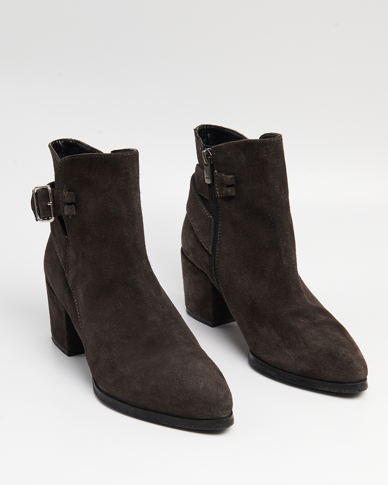 Ботильоны из 100% натуральной замши коричневого оттенка. Устойчивая колодка и широкий каблук. Удобная боковая молния, ремешок с металлической пряжкой.