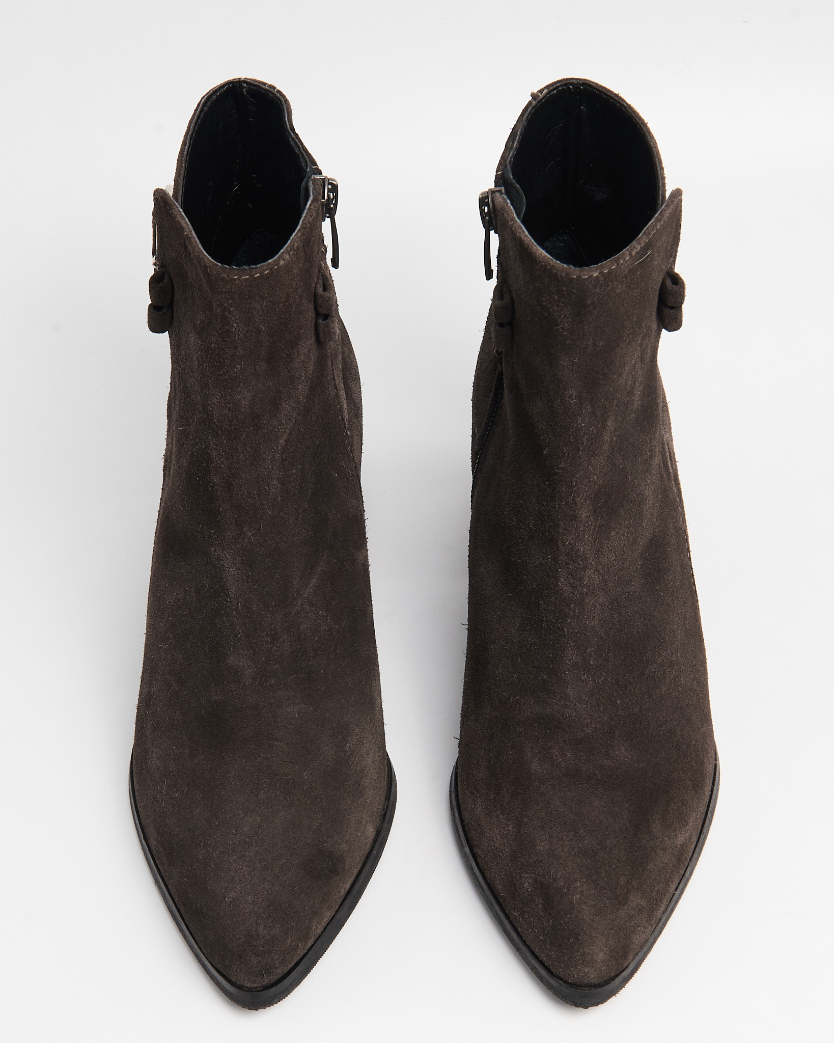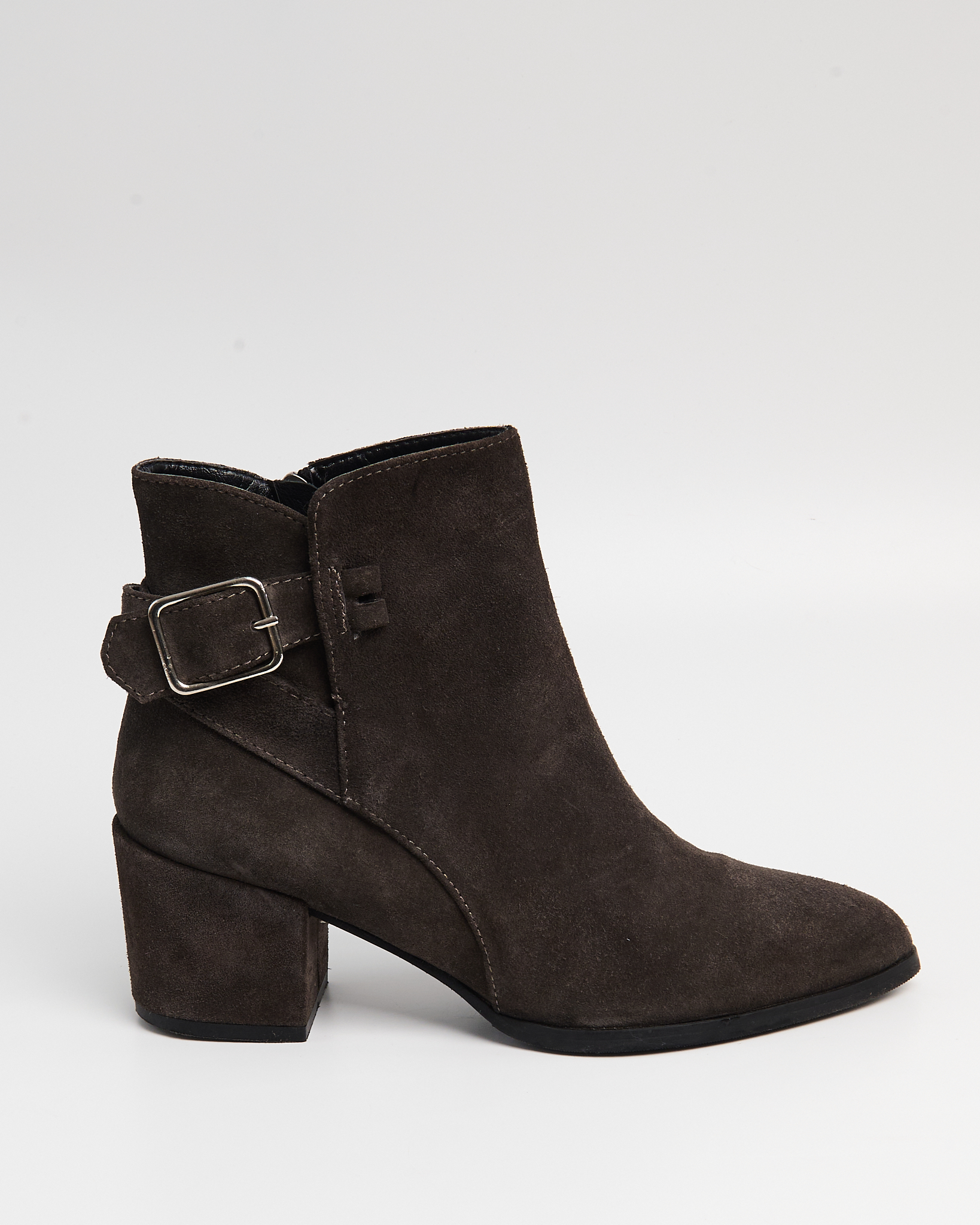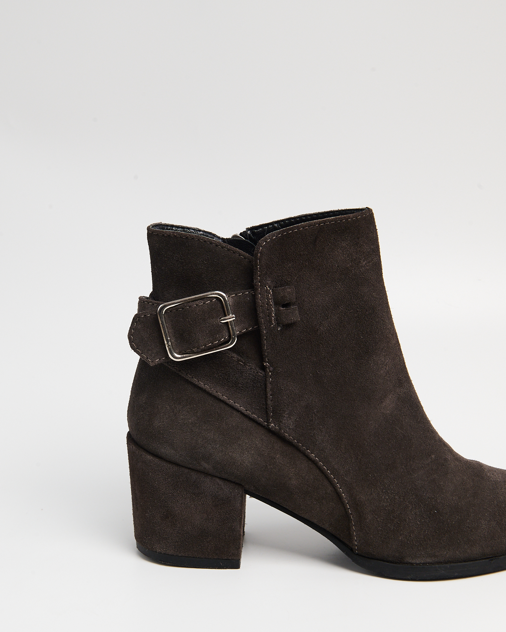 Ботильоны из 100% натуральной замши коричневого оттенка. Устойчивая колодка и широкий каблук. Удобная боковая молния, ремешок с металлической пряжкой.