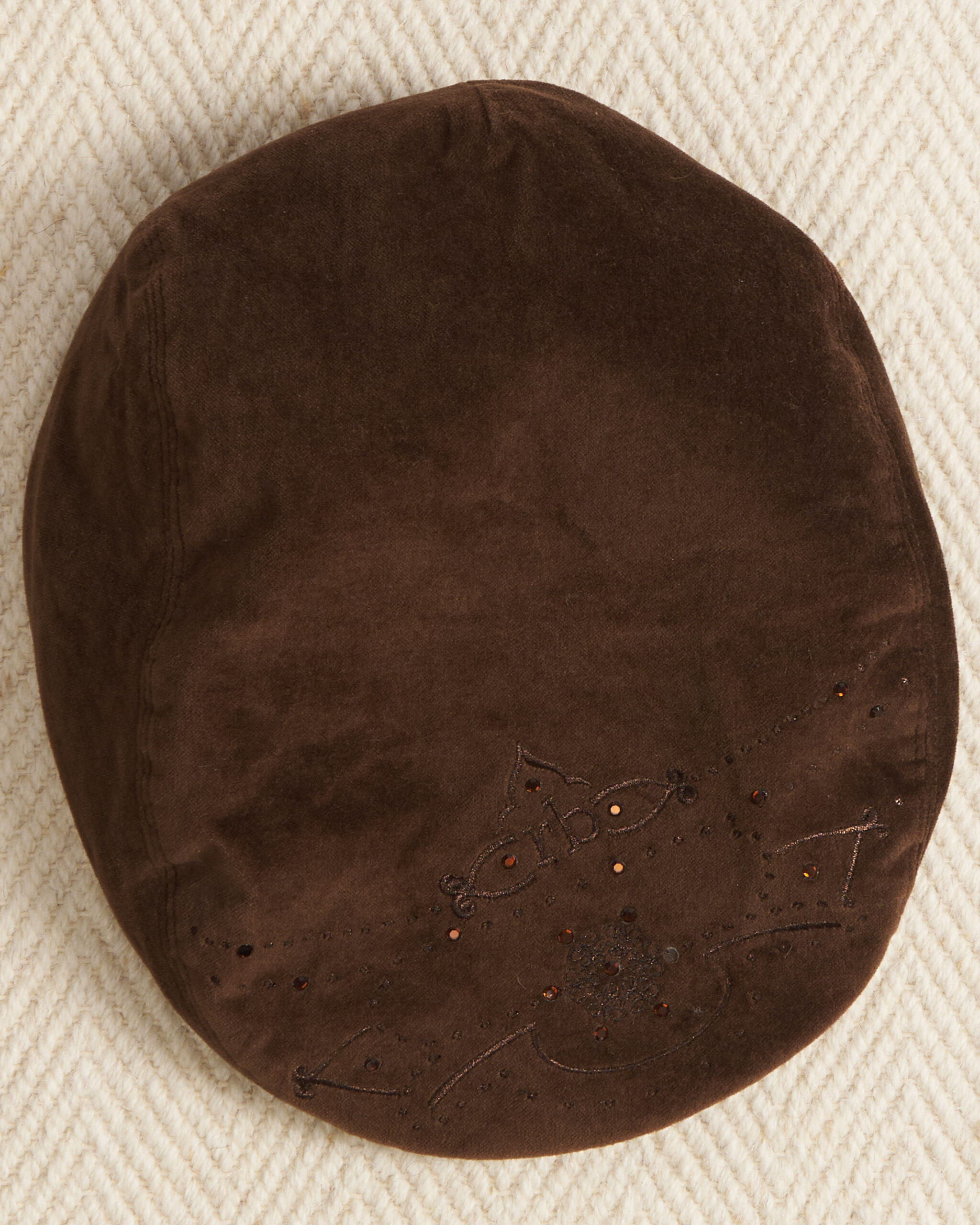 Винтажный берет в оттенке горький шоколад от бренда Roccobarocco. Берет превосходно держит форму без заломов. Легко можно менять наклон и глубину посадки на голове для разных образов. Берет украшен акцентными стразами и вышивкой.
