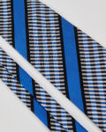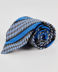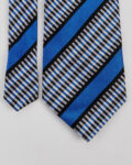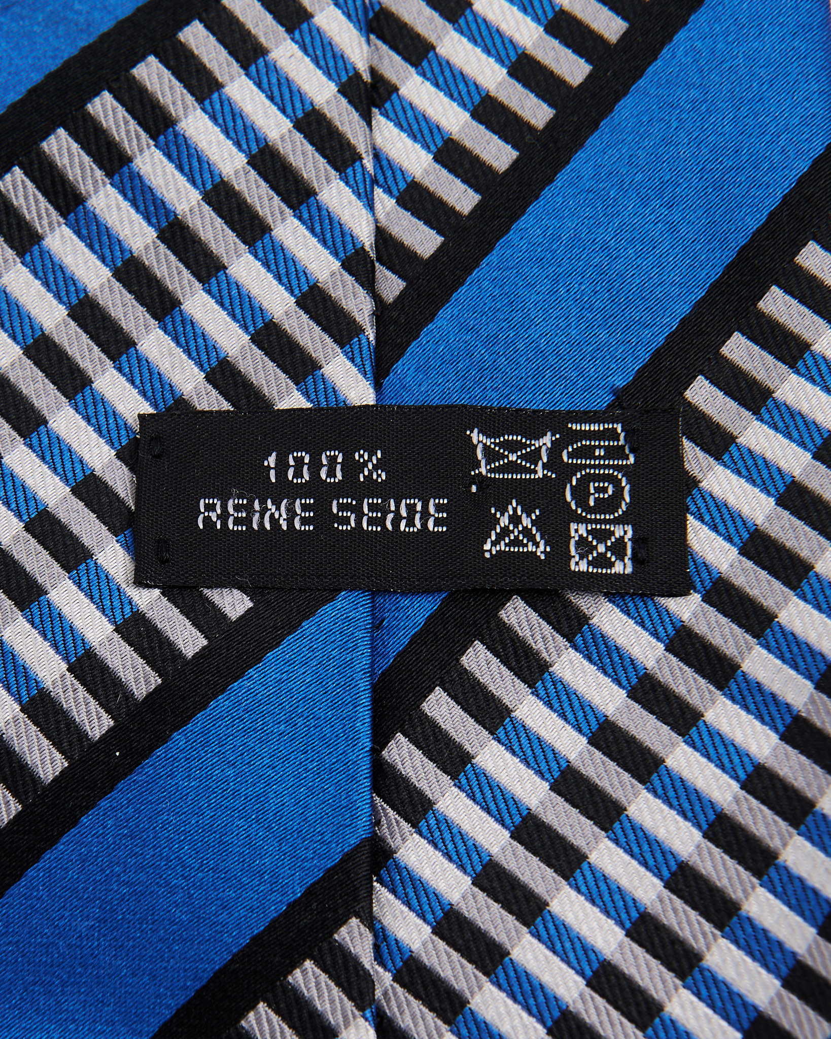 Выразительный галстук с контрастным сочетанием полос и мелкой клетки в сине-черной гамме, выполнен из 100% натурального шёлка.