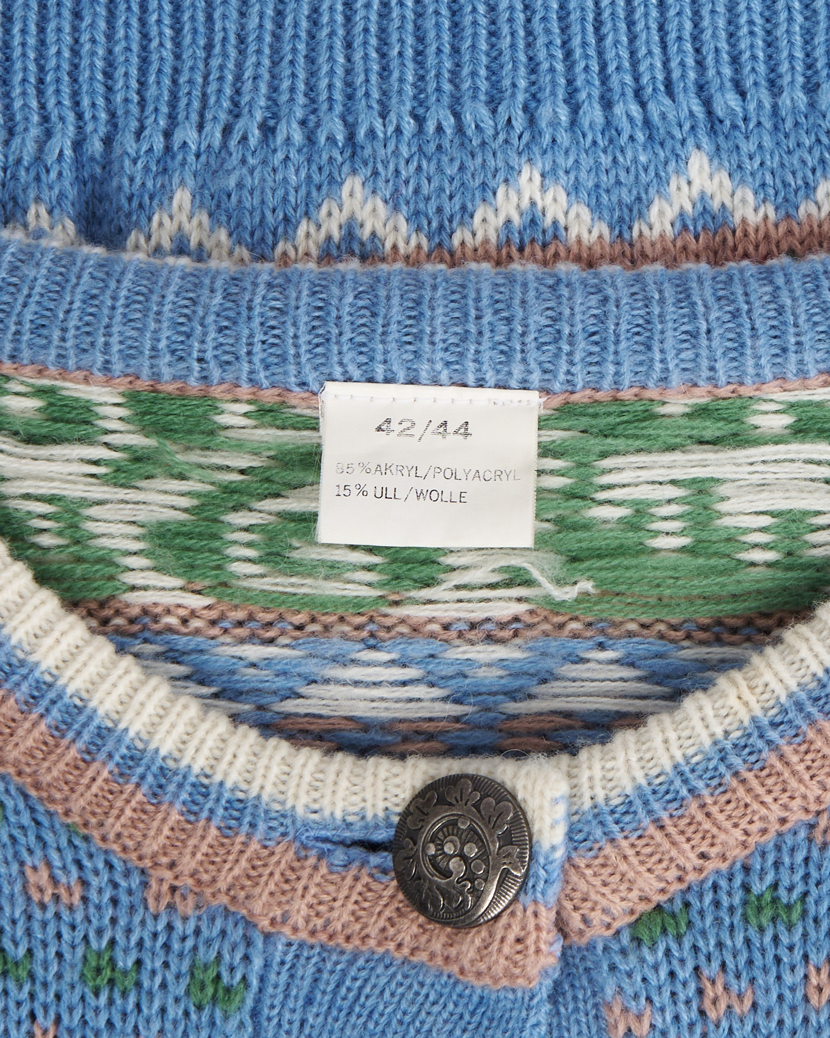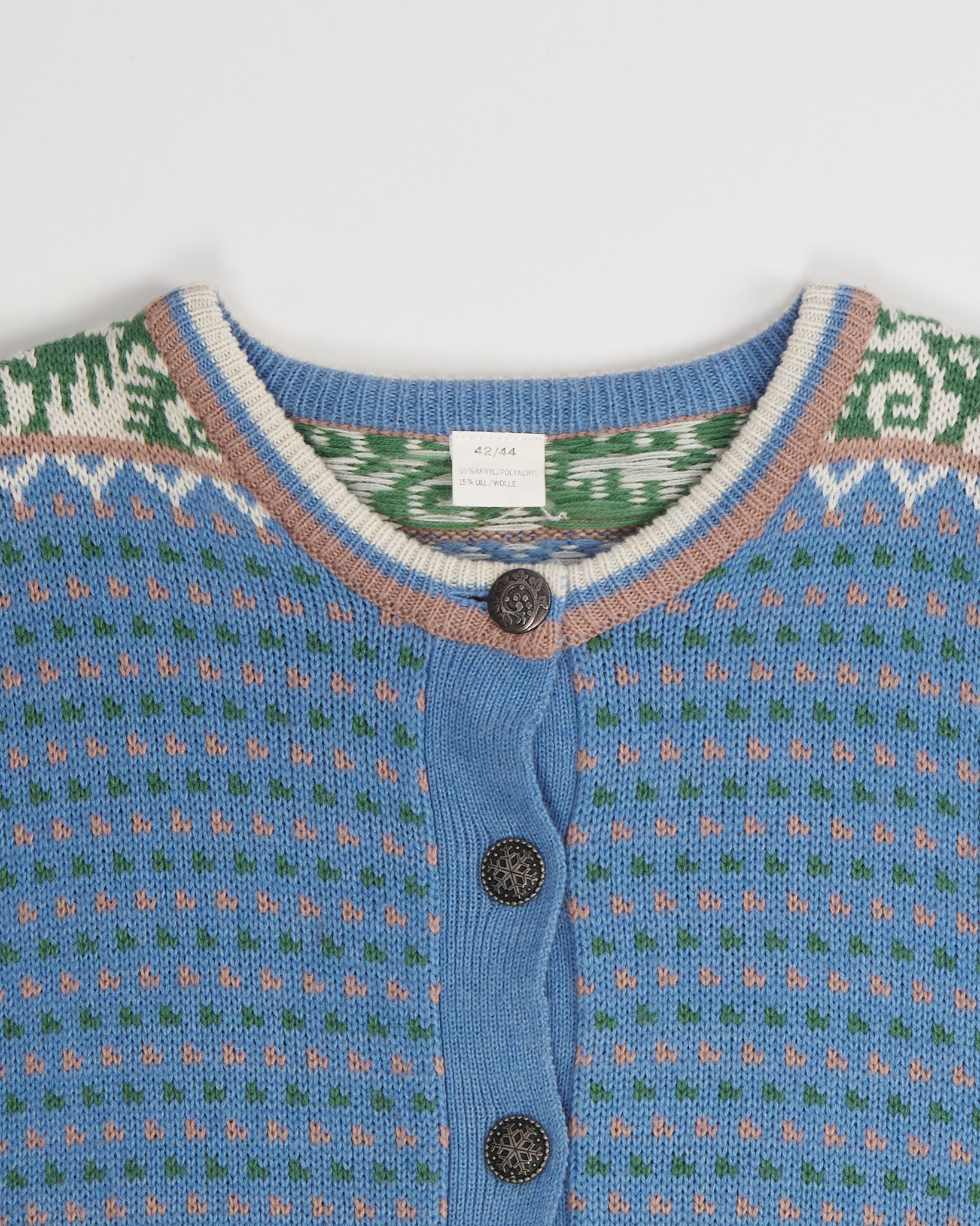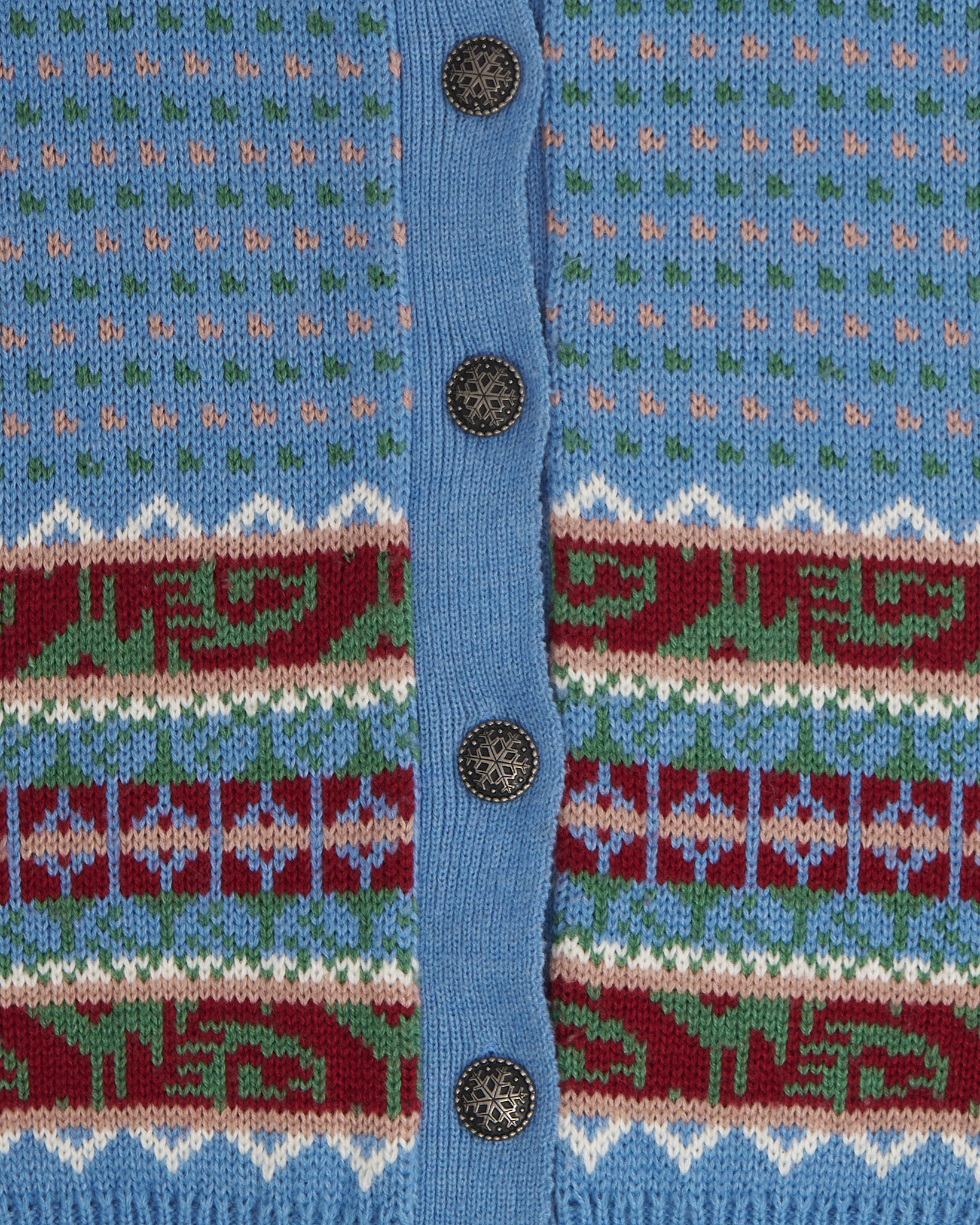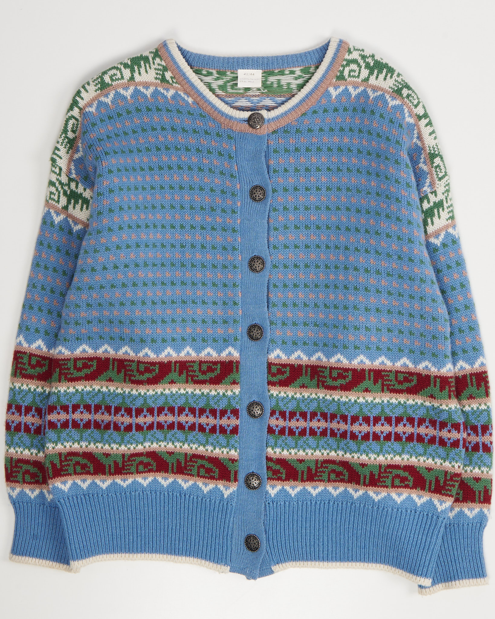 Кардиган в традиционном скандинавском стиле. Прямой крой и свободную посадку по фигуре. Сложный многоцветный орнамент и фактурные металлические пуговицы.