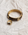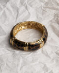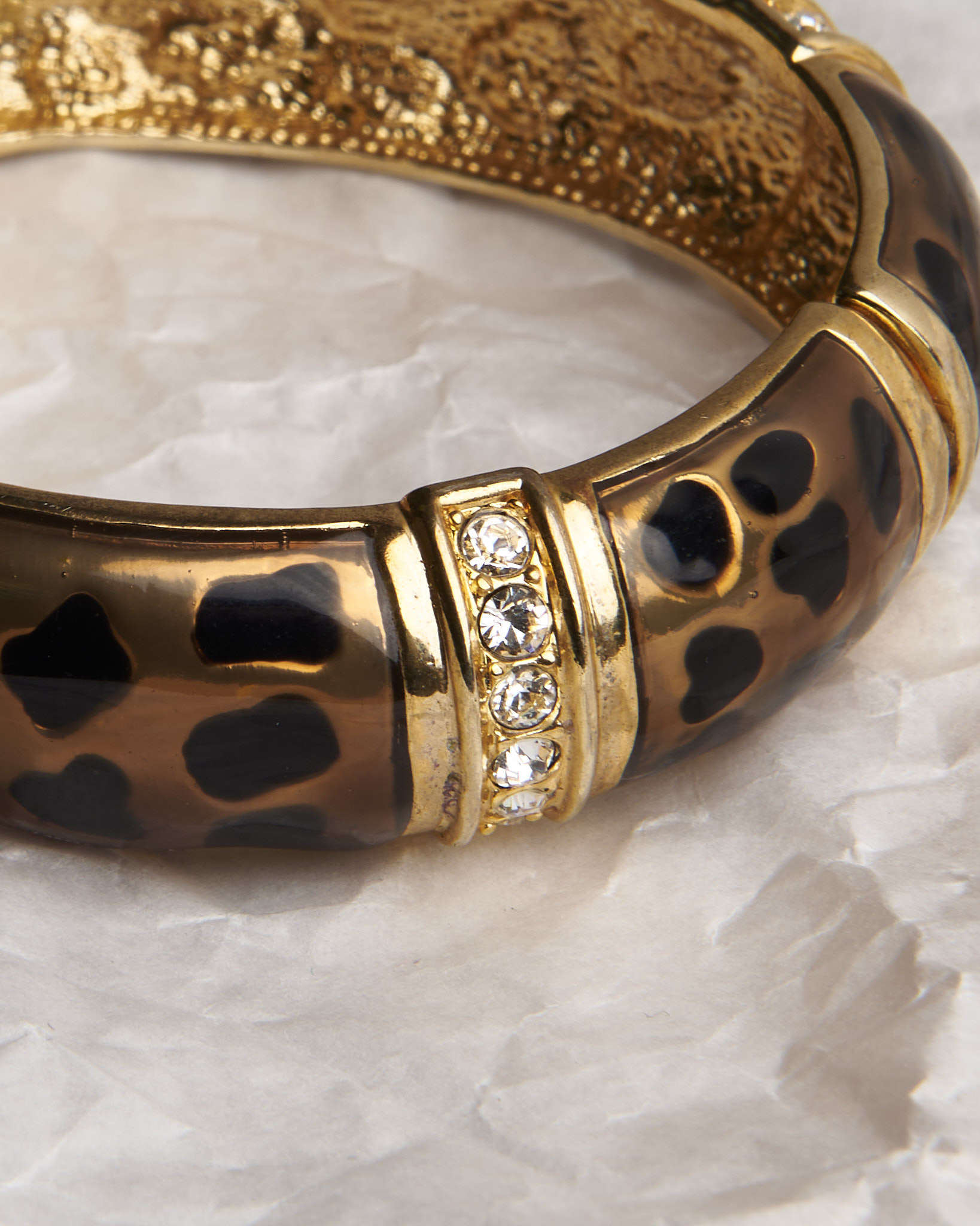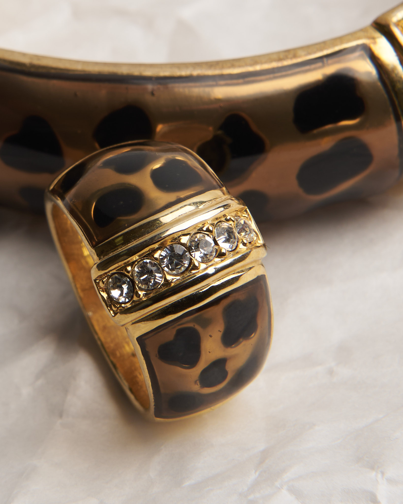 Комплект в стиле максимализм. Тяжелый золотистый металл, глянцевая эмаль с леопардовым узором, удобная застёжка у браслета.