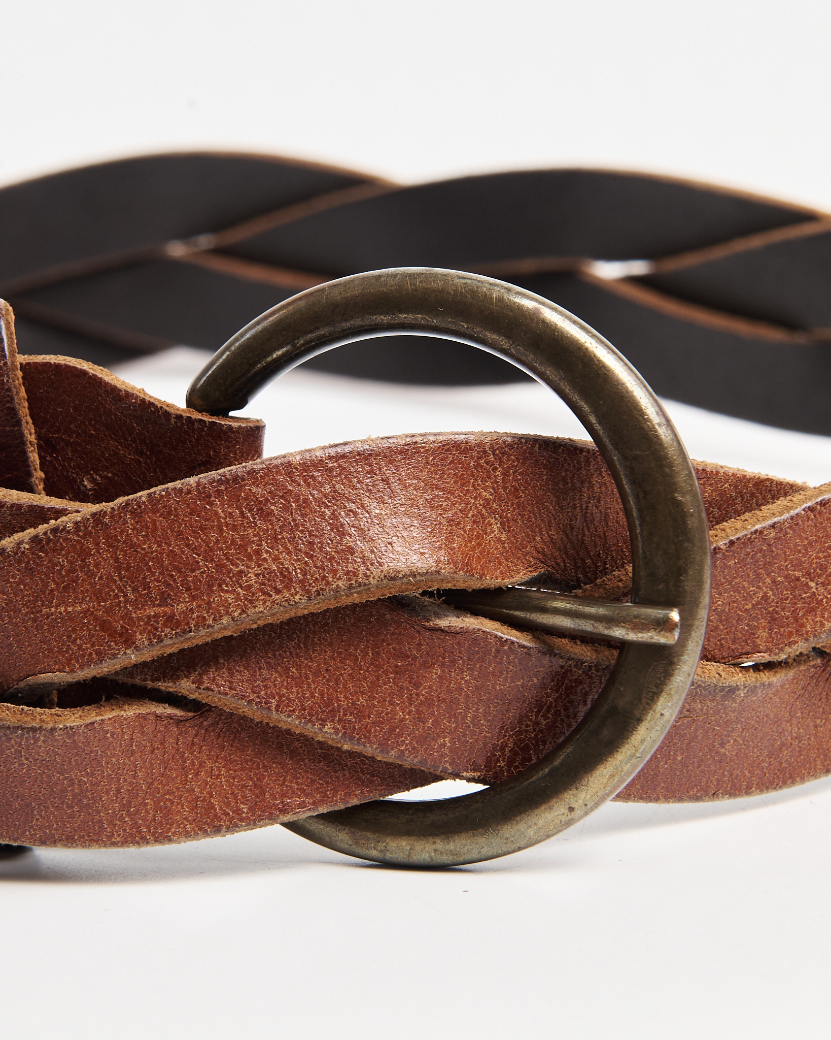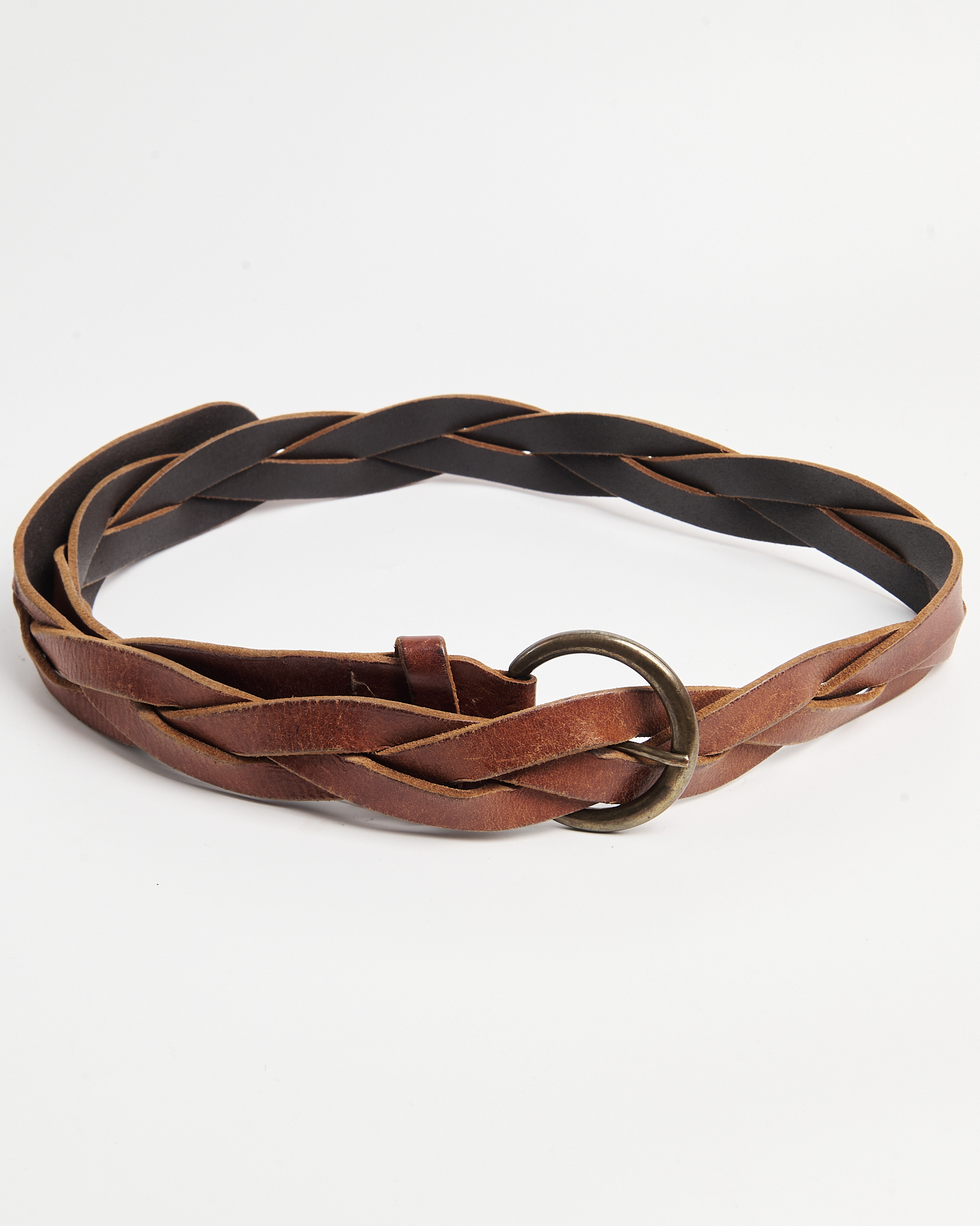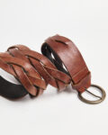 Ремень  из плотной натуральной кожи глубокого коричневого оттенка. Плетёная конструкция, круглая металлическая пряжка с состаренным эффектом, надёжная фурнитура.