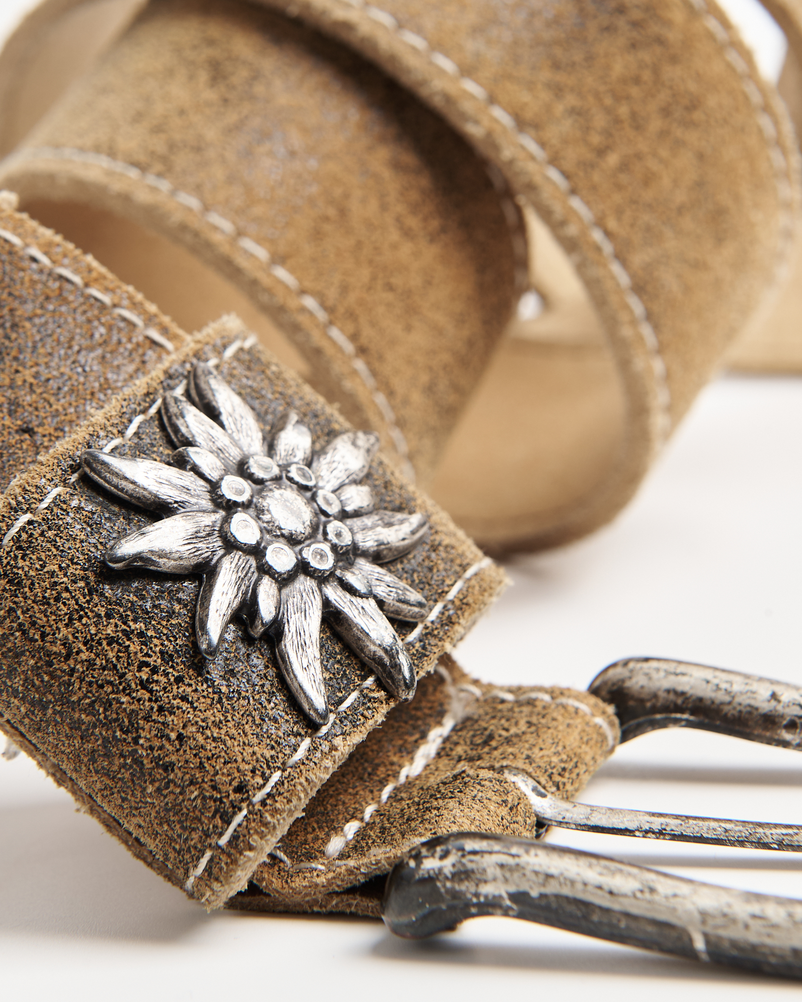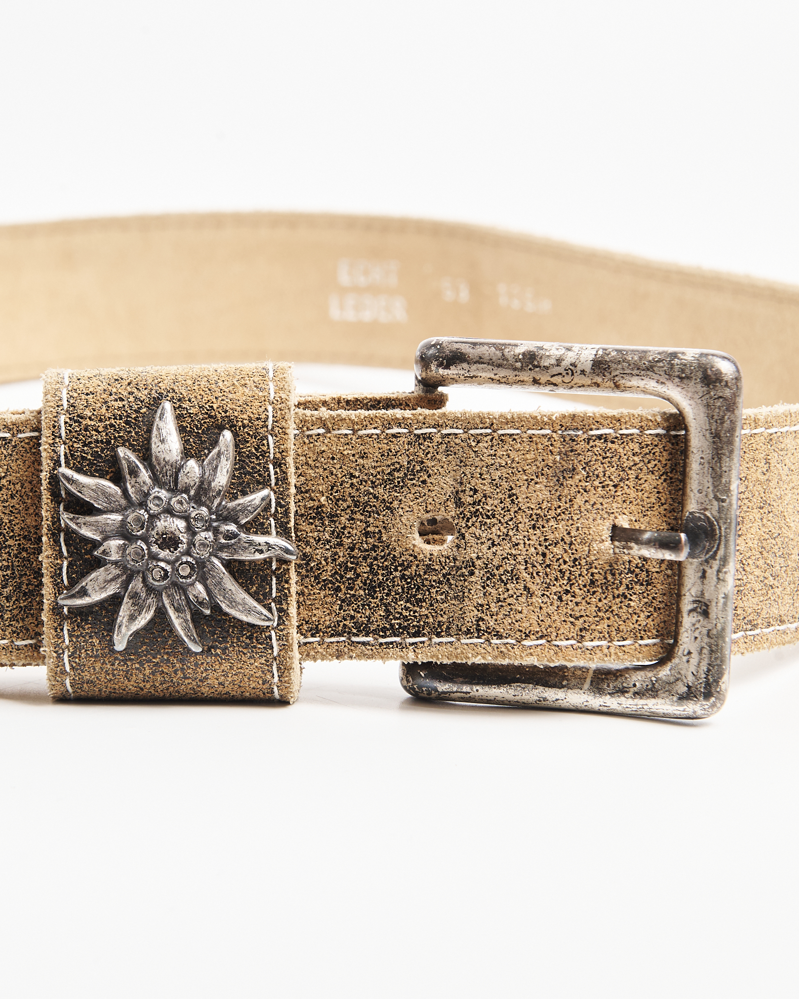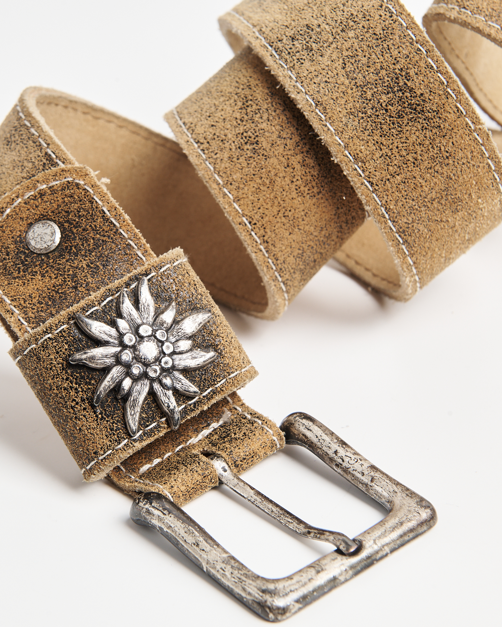Ремень из плотной натуральной кожи. Металлическая пряжка с эффектом патины, декоративные элементы в форме альпийского цветка придают акцент.