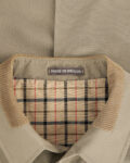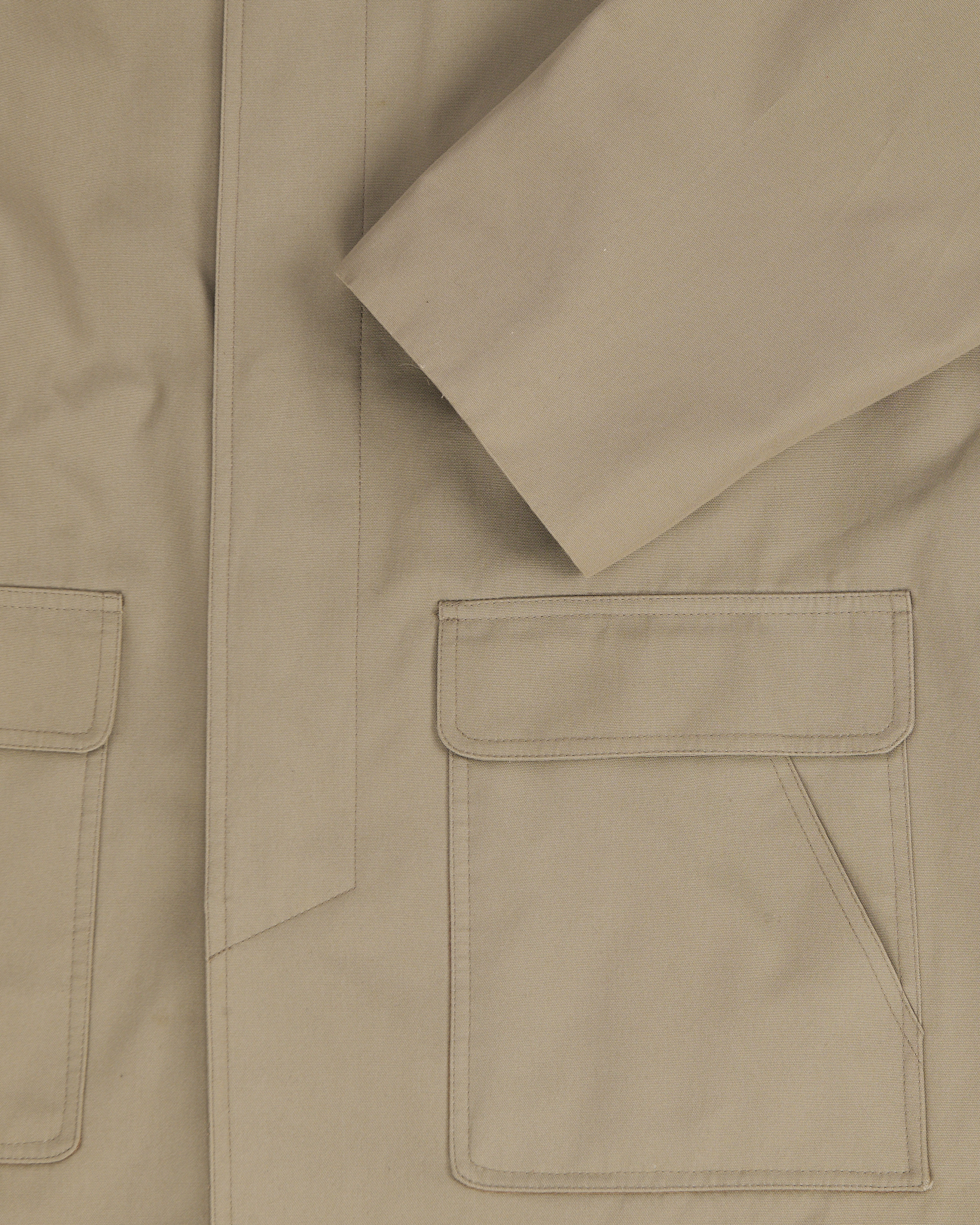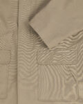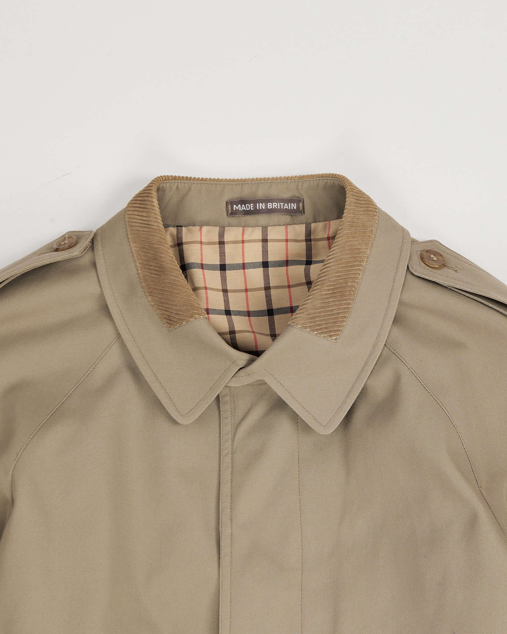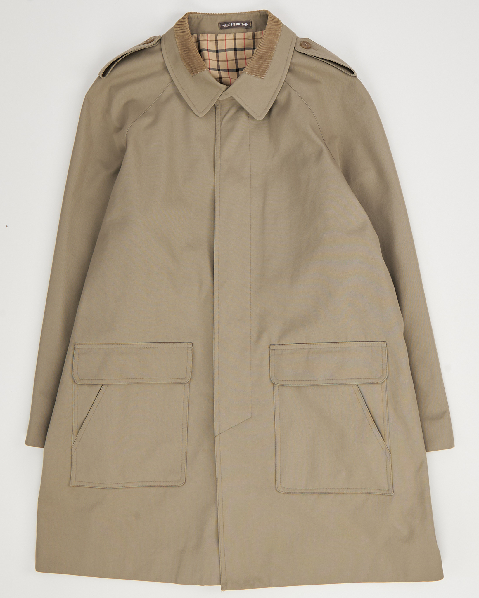 Плащ из плотной хлопковой ткани оливкового оттенка. Посадка свободная, силуэт прямой и аккуратный. Внутри контрастная подкладка в клетку, воротник из вельвета и крупные карманы.