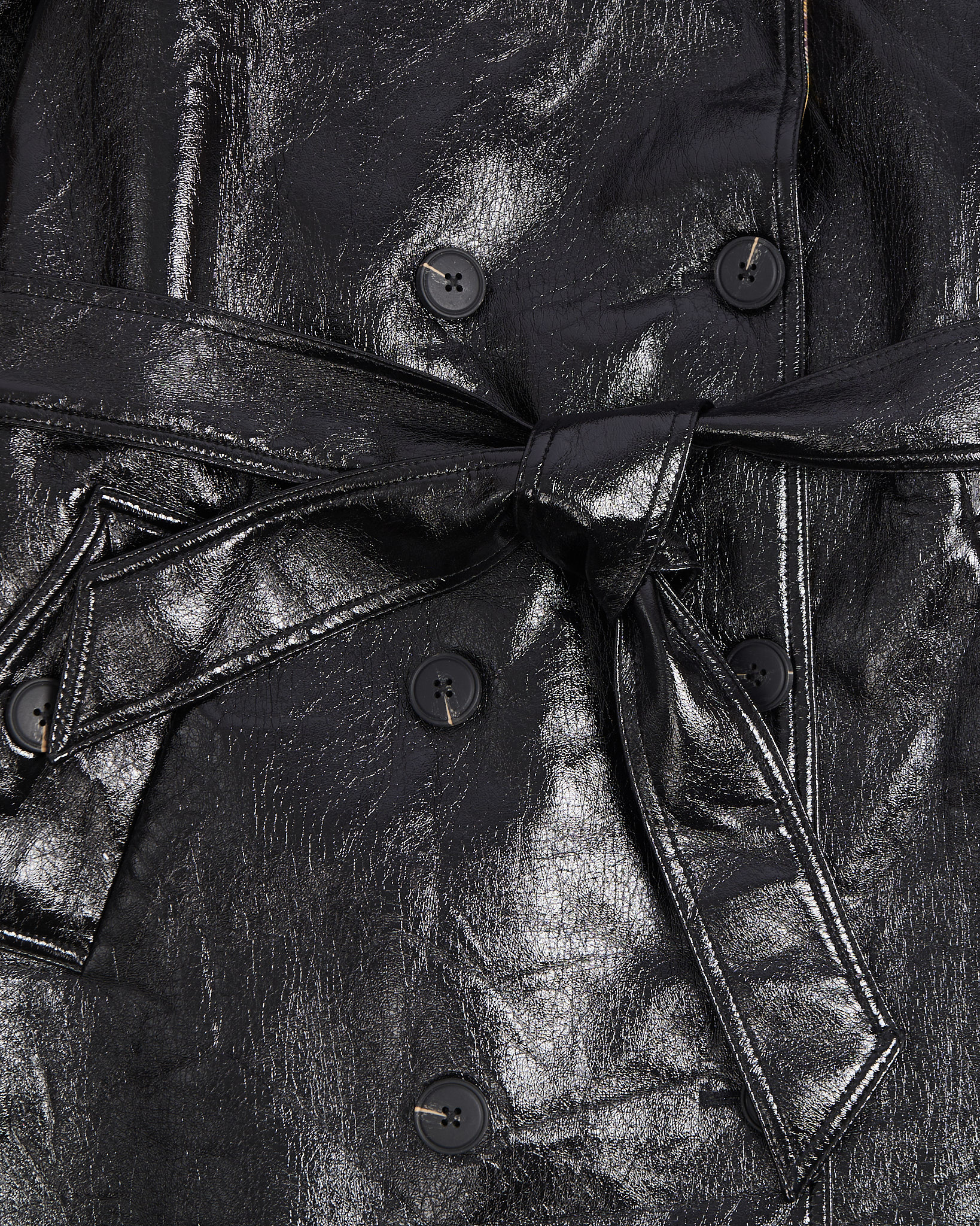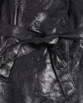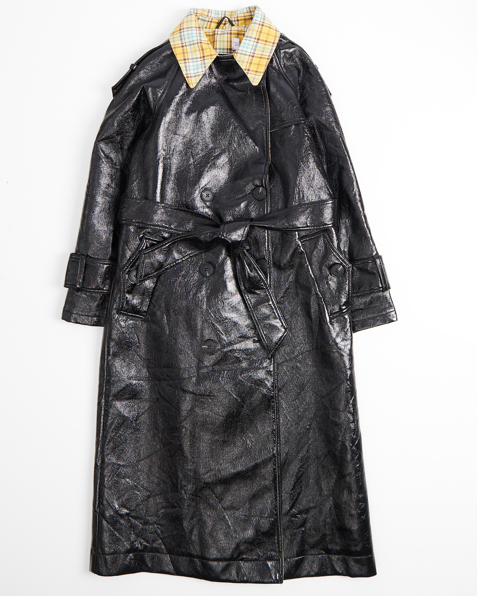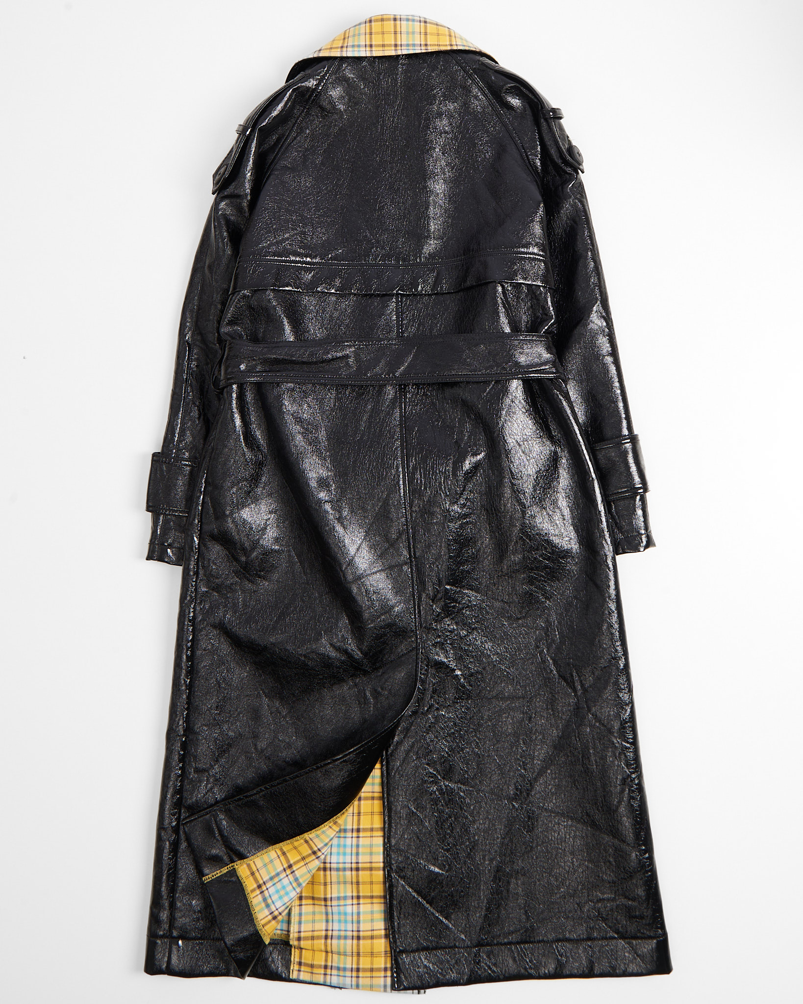 Фактурный винтажный плащ с контрастным воротником. Искусственная кожа с жатым эффектом, прямой фасон, широкий пояс в комплекте позволяет легко регулировать объем в талии. Контрастный воротник в желтую клетку, акцентные лацканы и функциональные карманы по бокам.