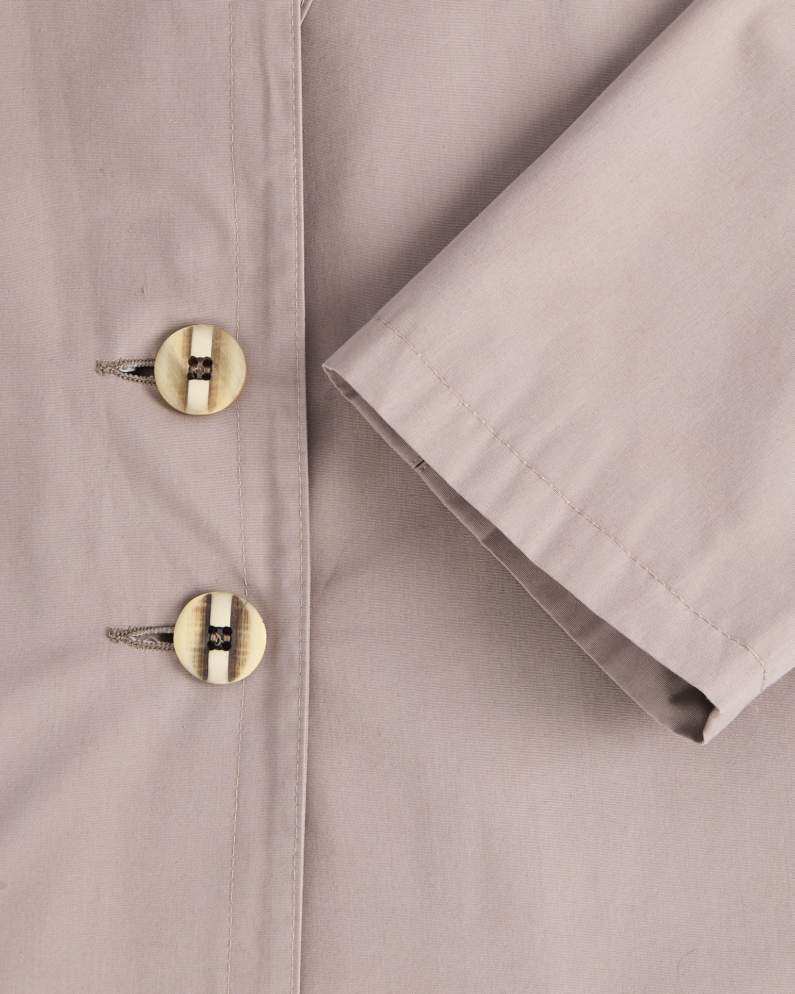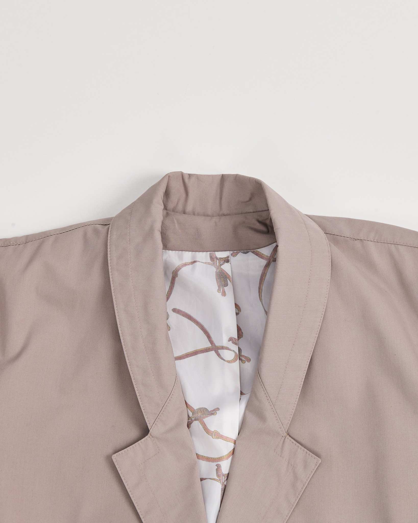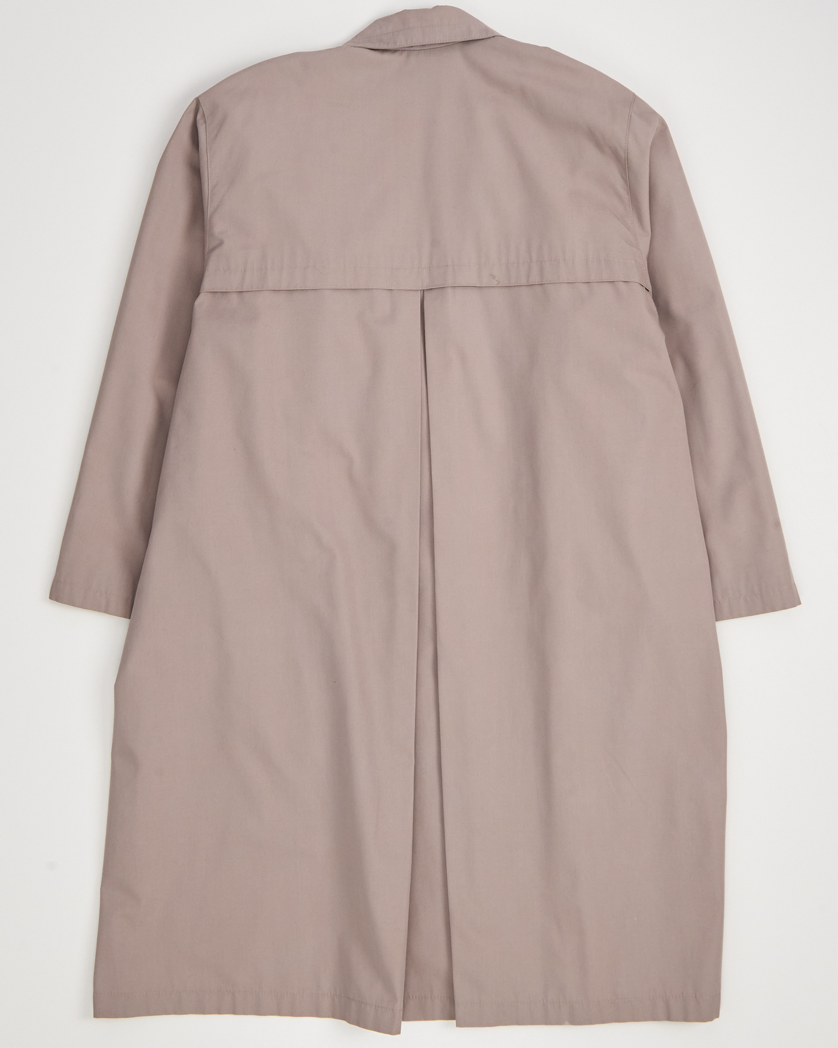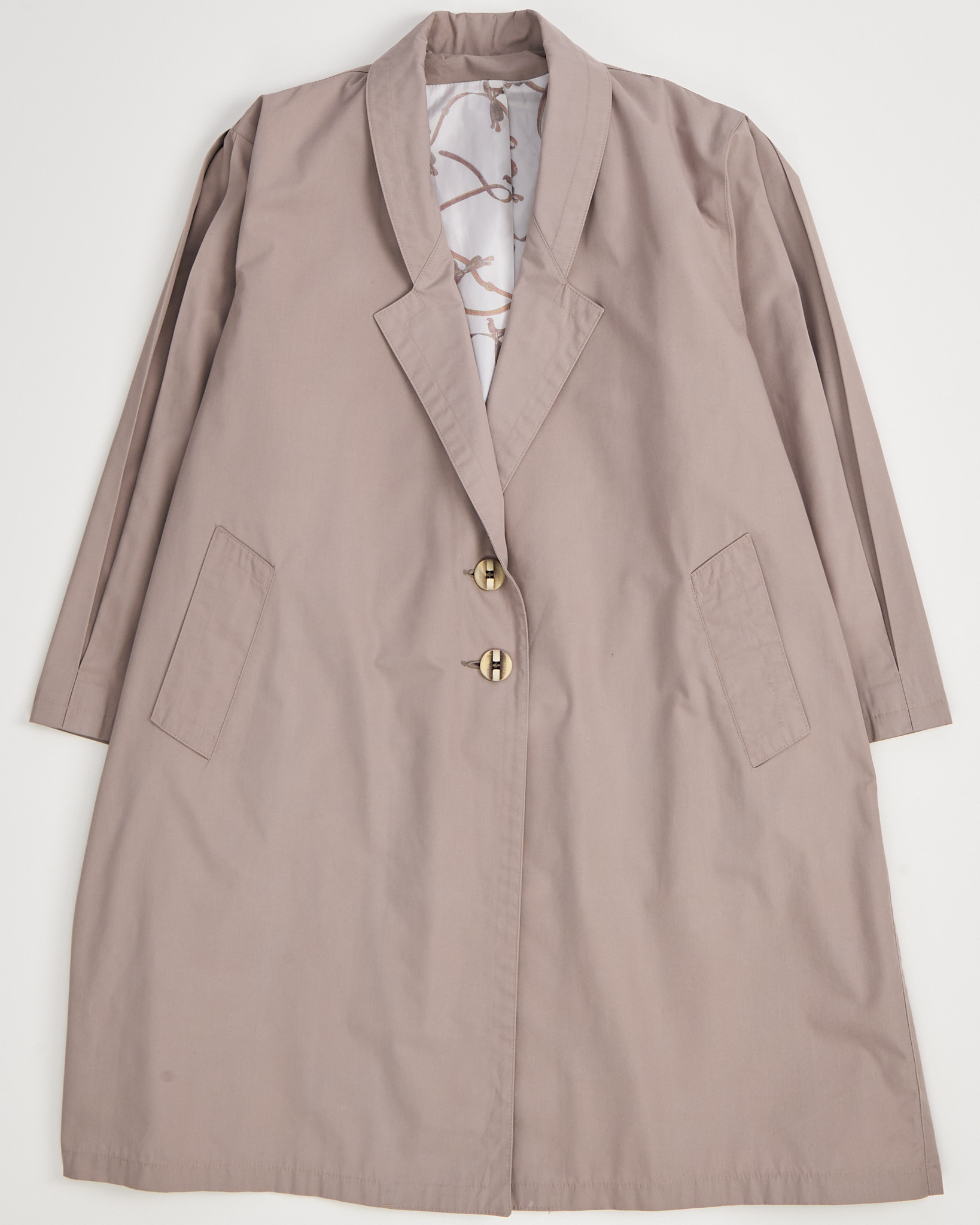 Винтажный плащ из легкой ткани. Прямой крой, свободная посадка. Широкий ворот и крупные декоративные пуговицы придают акцент. Подкладка с графичным рисунком, акцентные защипы на спине и рукавах.