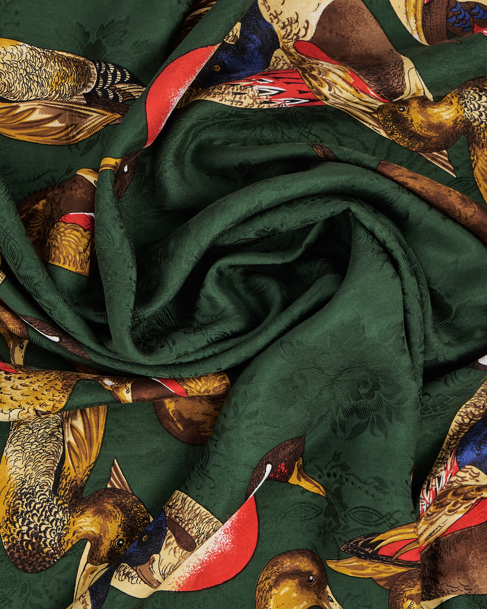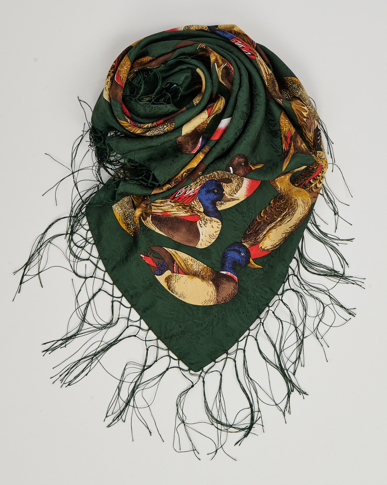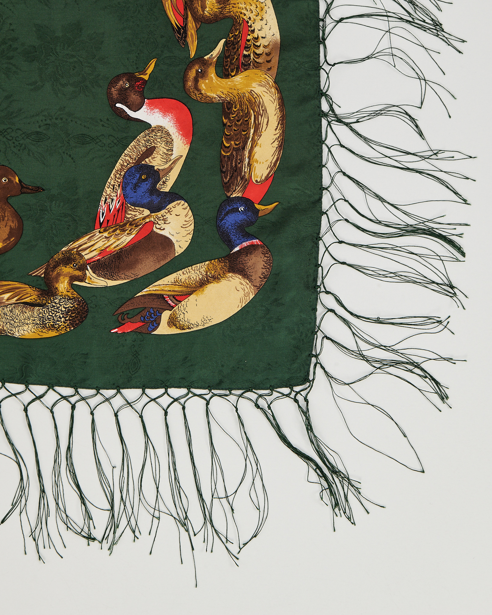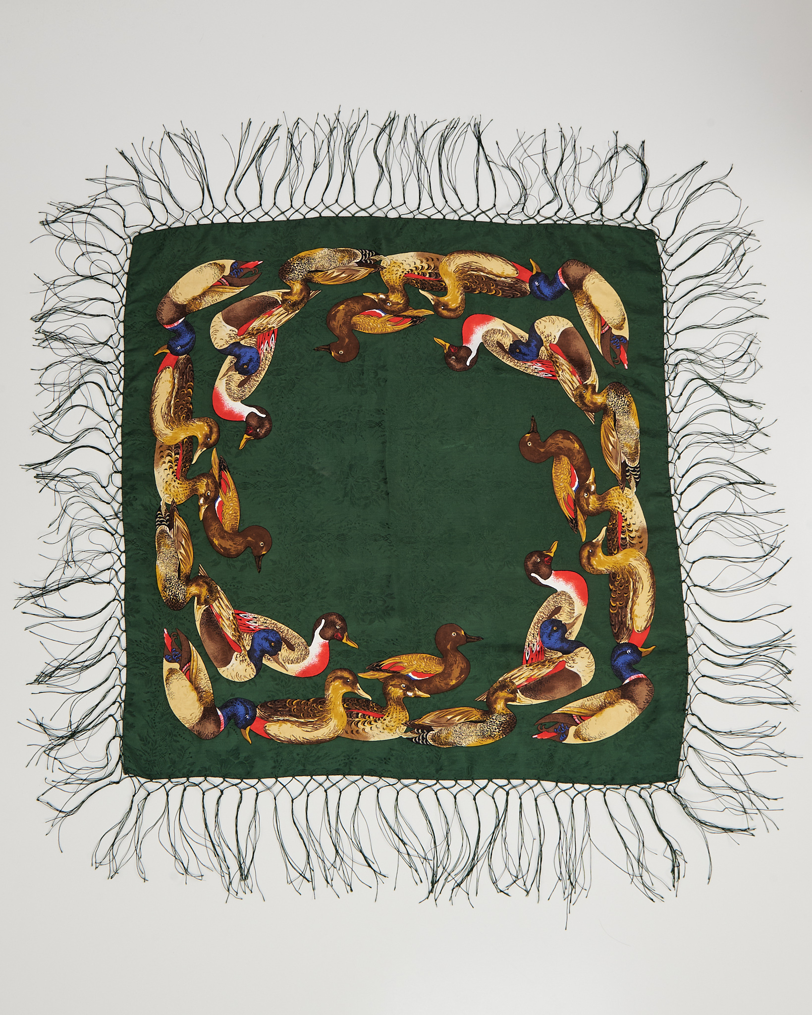 Платок  из натурального шелка глубокого зелёного оттенка с орнаментом из диких уток по периметру.Детализированный анималистичный принт, акцкентная бахрома по краям.