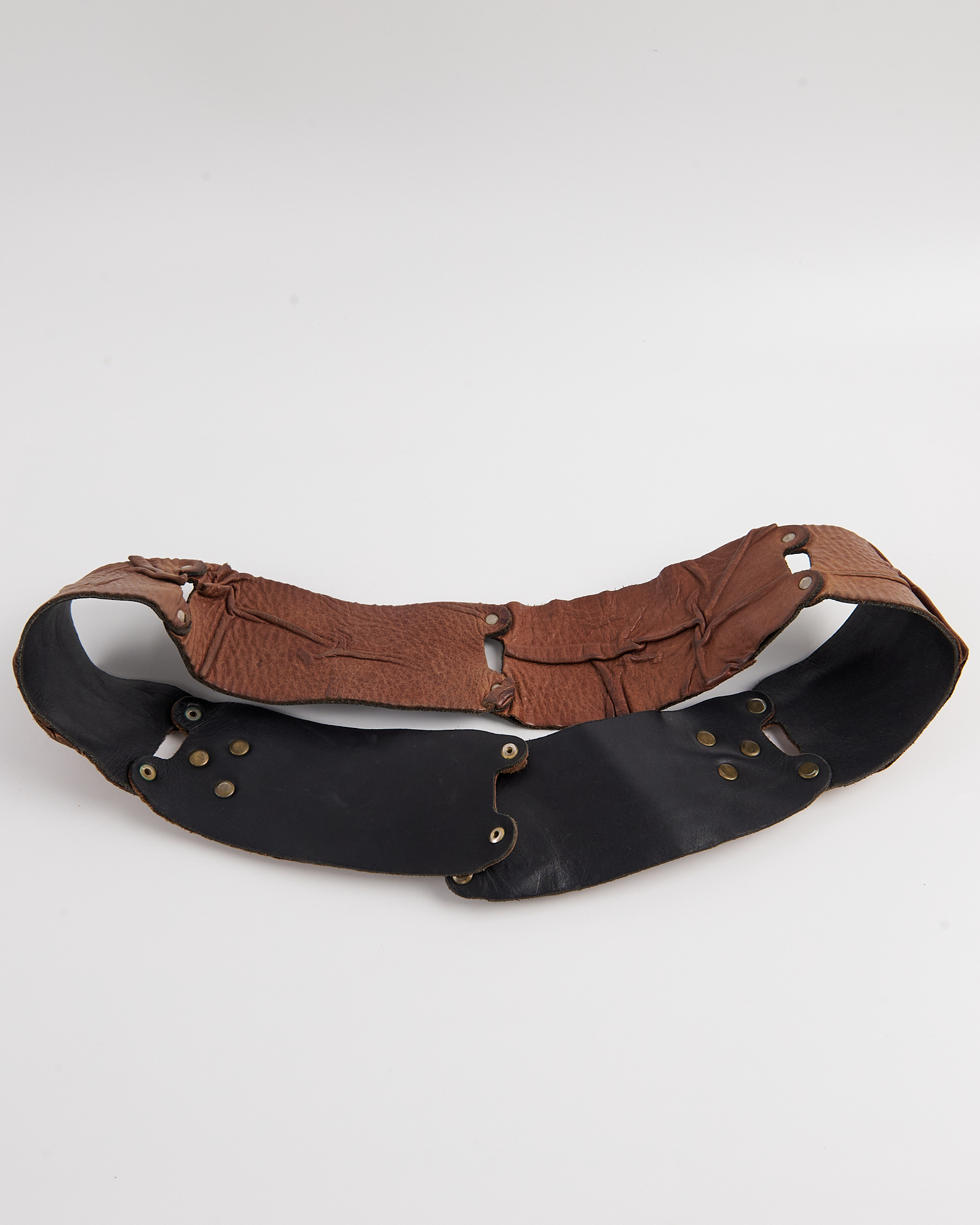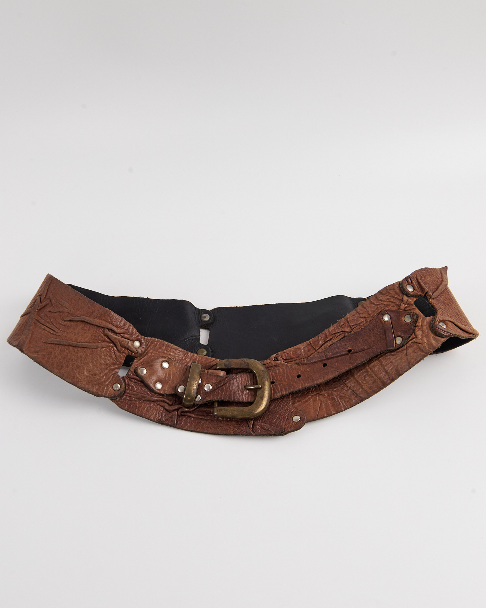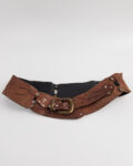 Ремень из плотной натуральной кожи теплого коричневого оттенка. Ремень плотно фиксируется на талии и формирует выразительную линию силуэта. Металлическая пряжка с эффектом состаренного металла и декоративные заклепки.