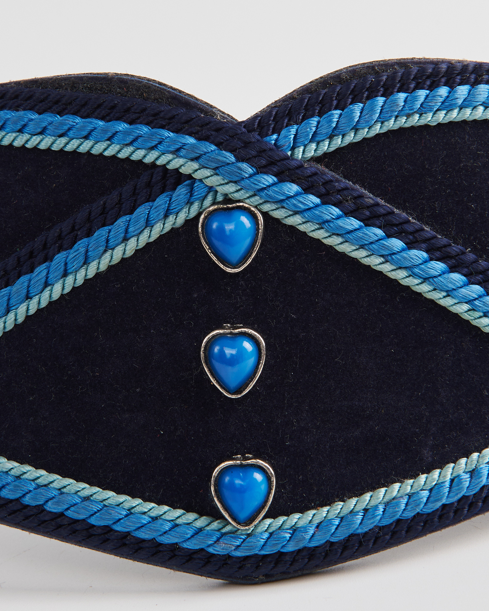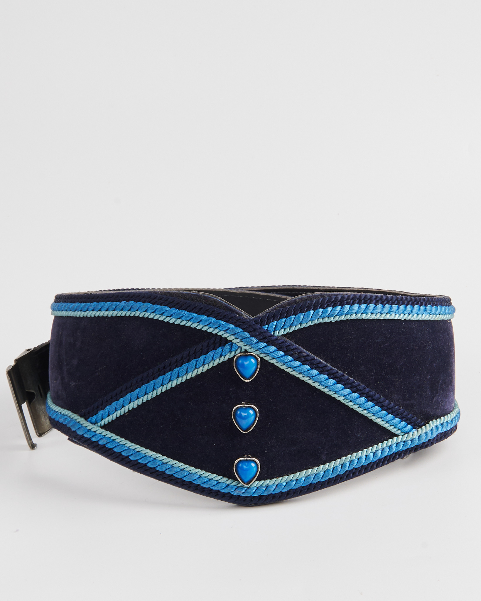 Ремень из искусственной кожи в темно синем оттенке. Акцентные клепки в виде голубых сердец, удобная застежка. Ремень украшен разноцветными нитями.