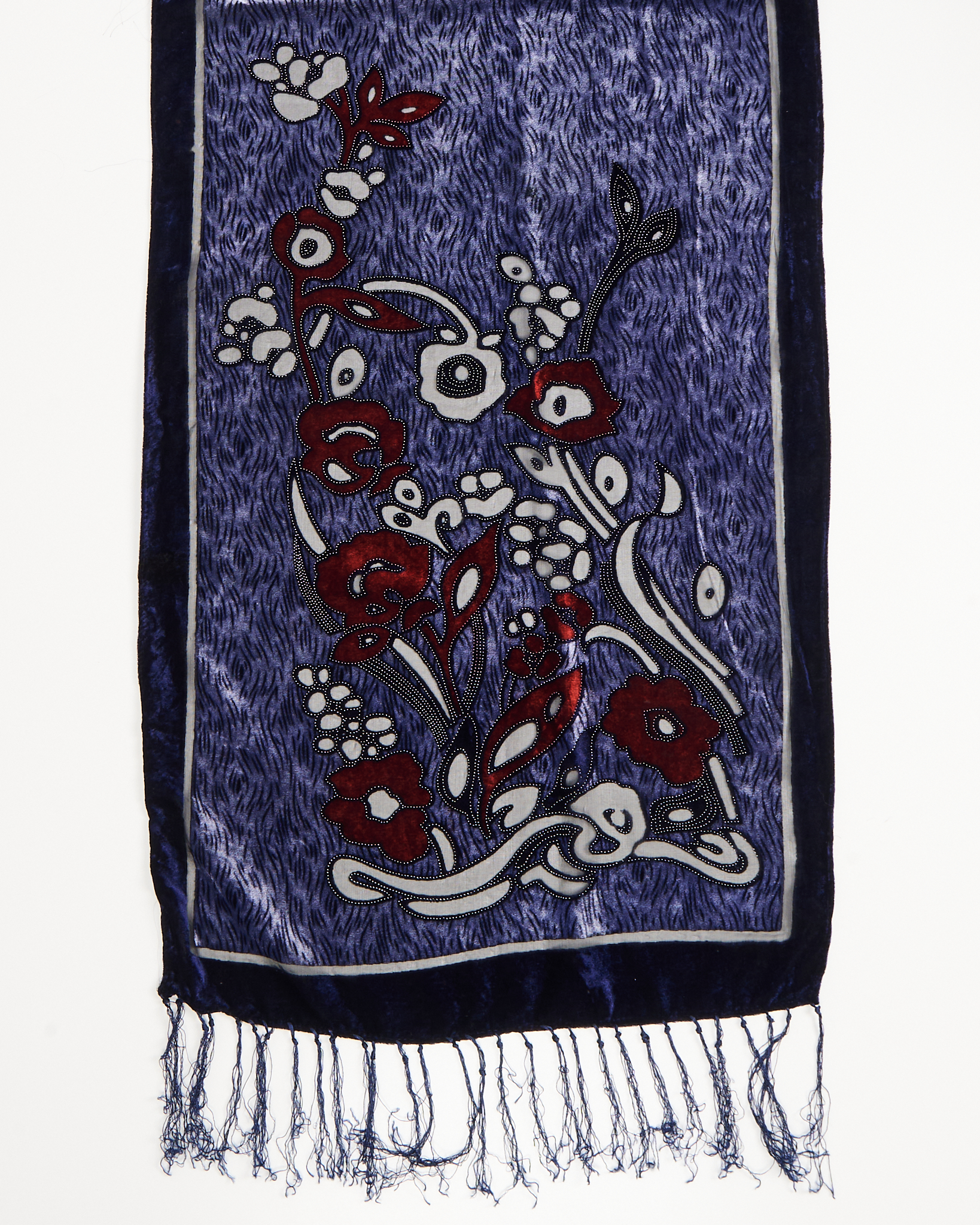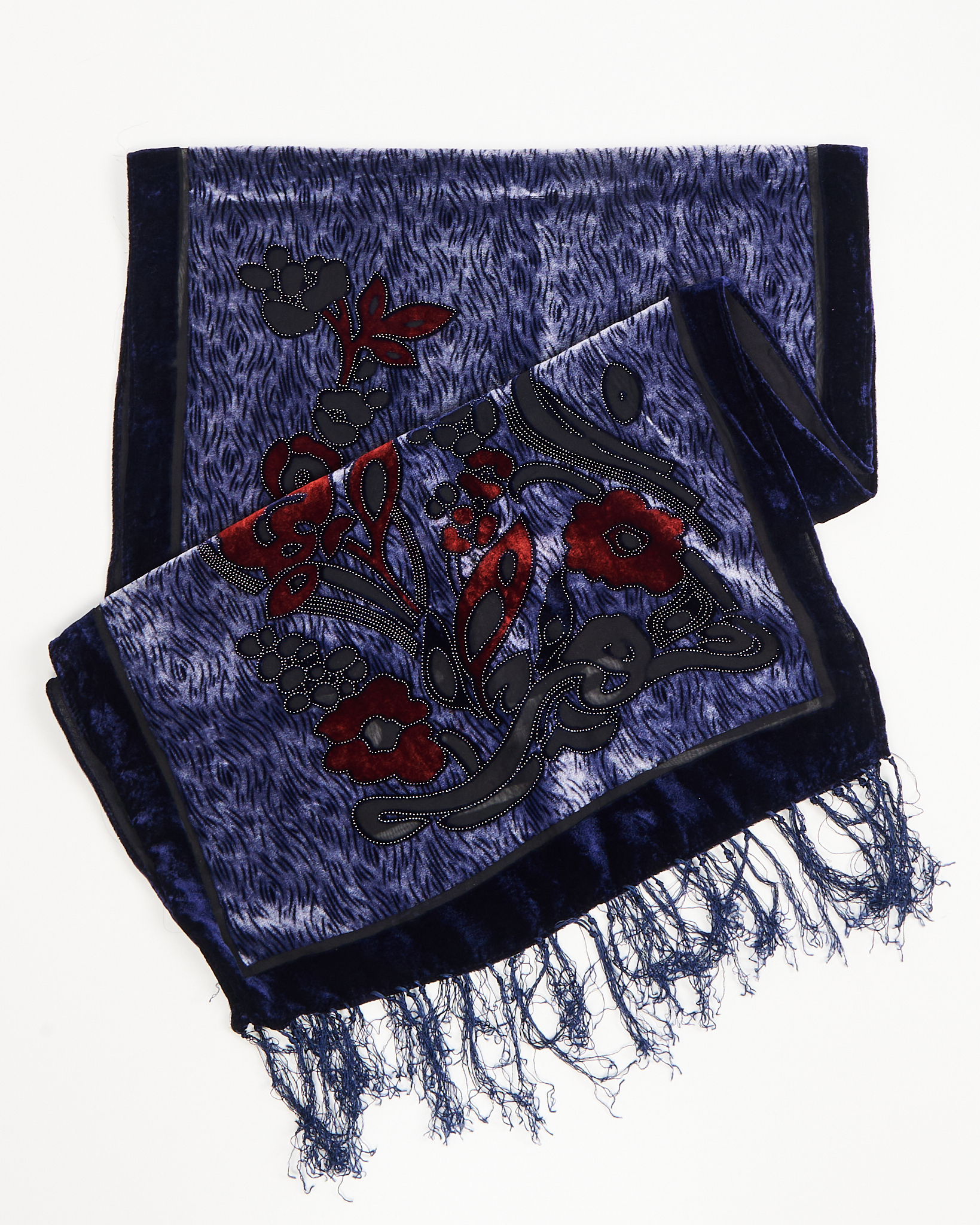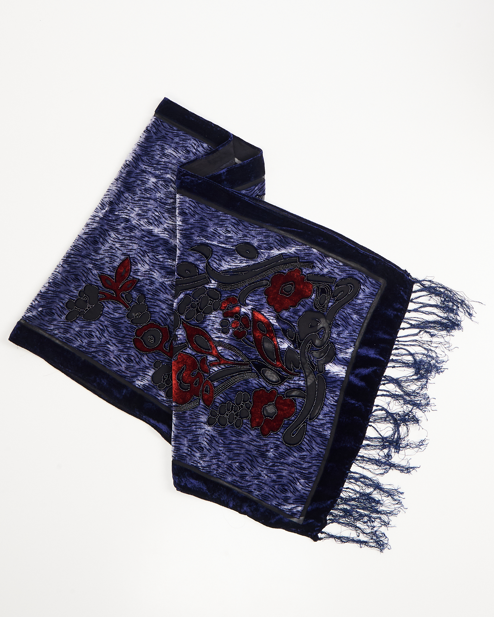 Бархатный шарф с вышивкой и бахромой. Выполнен из 40% шелка. Контрастная вышивка с цветочным принтом, шёлковая бахрома по краям.
