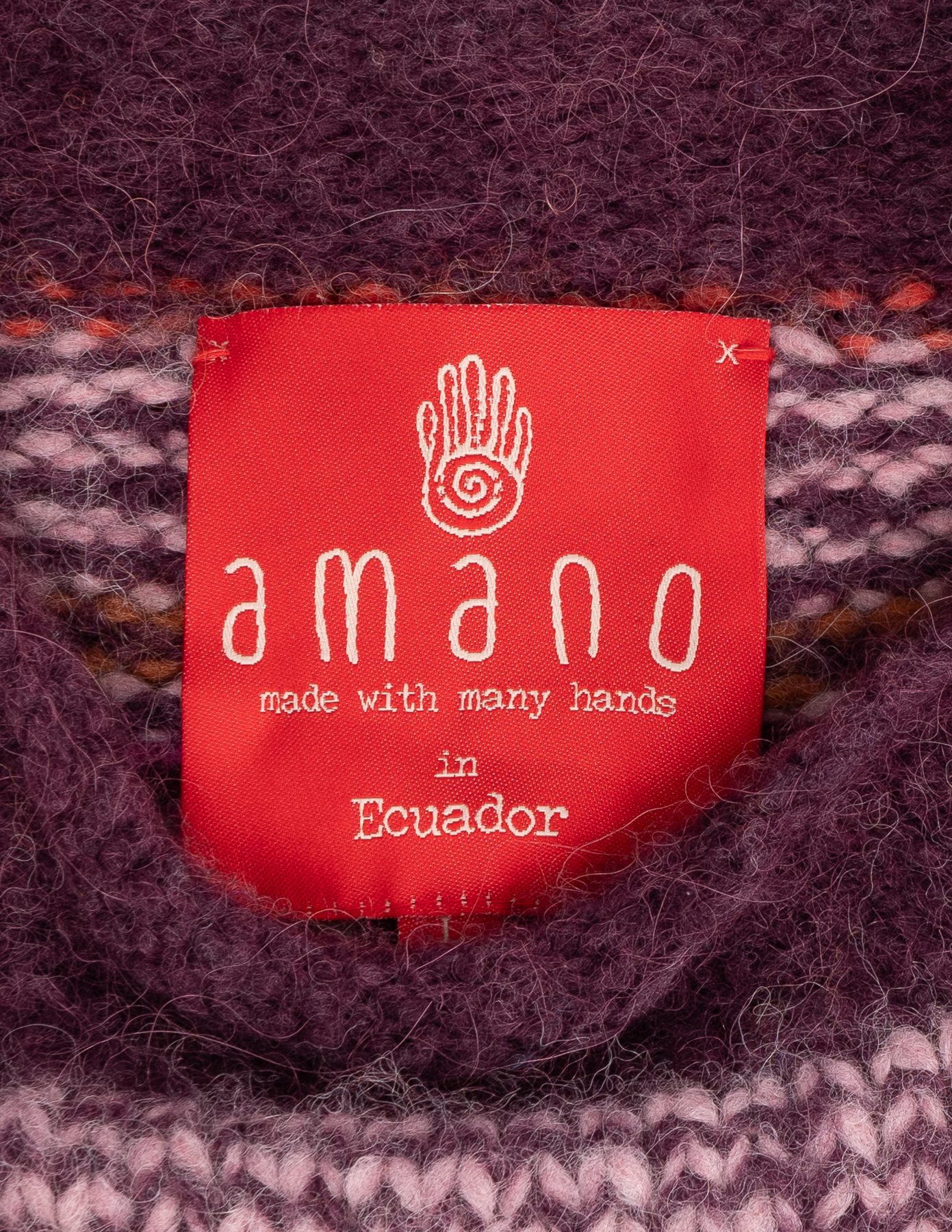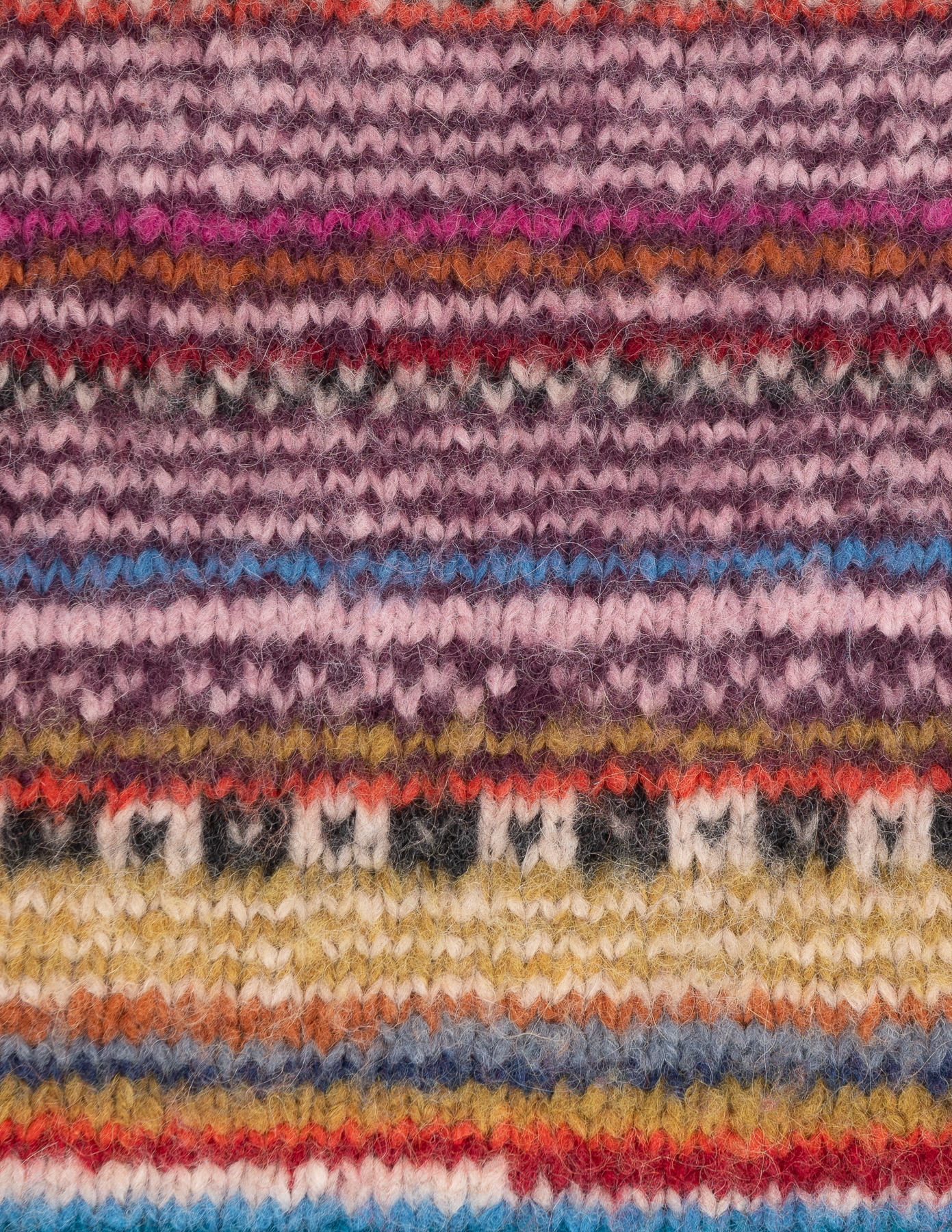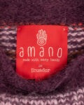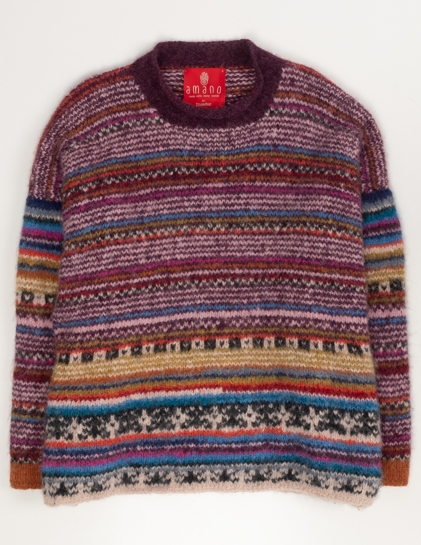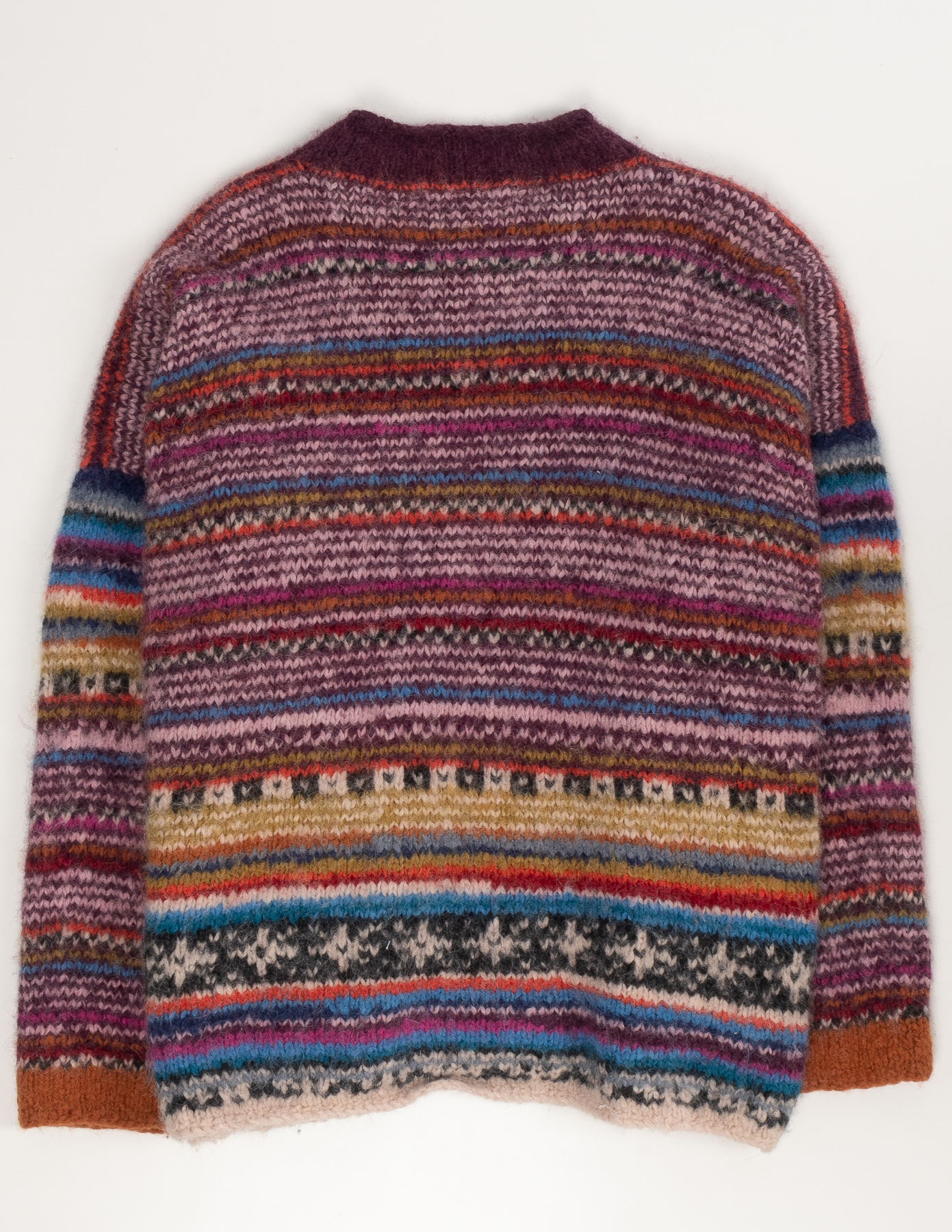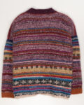 Связан вручную из пряжи с содержанием 79% baby-альпаки — мягкой, пушистой и тёплой на ощупь. Многоцветный орнамент в этно-стиле выполнен в приглушённой палитре с акцентами бордо, синего и охры. Свободная посадка oversize с широкими плечами и расслабленной линией силуэта.